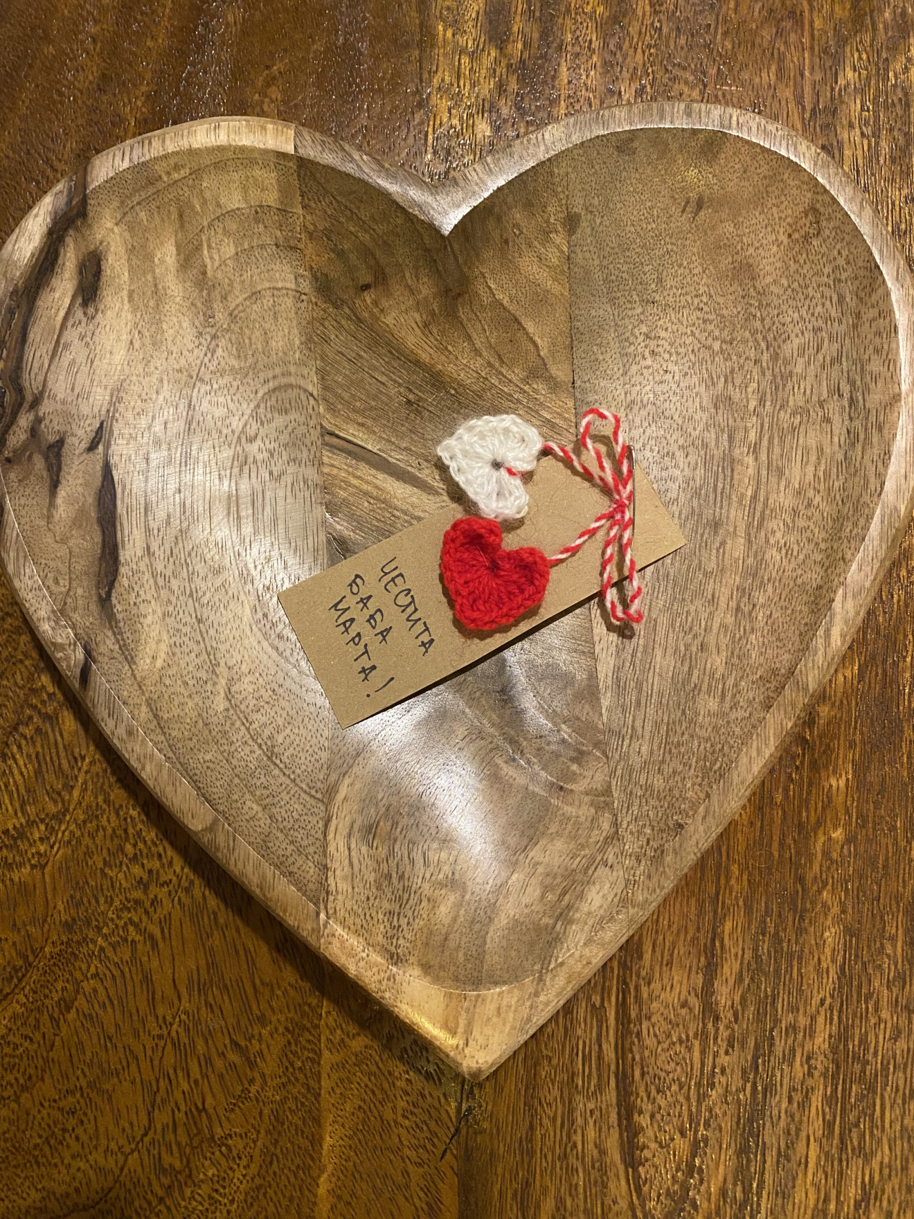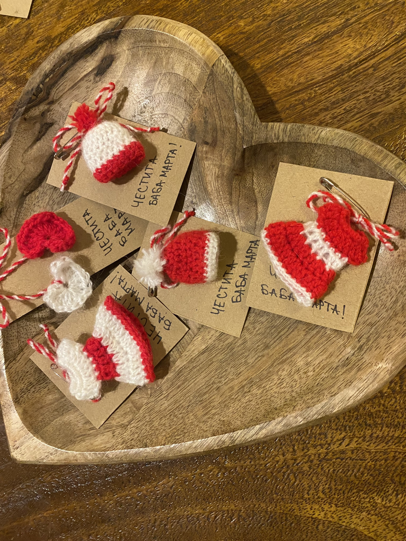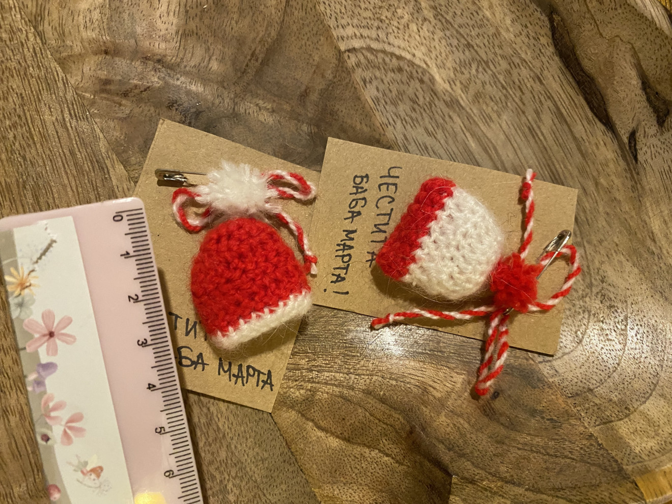 Мартенички, изплетени на една кука, с много любов и внимание към детайла. Традиционни, същевременно артистични и красиви. Опаковани, придружени с първомартенско стихче. Цени: -шапка с помпон- 7 лева/брой - рокличка- 7 лева/брой - сърчица- 4 лева/ мартеничка с едно червено и едно бяло сърчице Усмивки! :) Мария