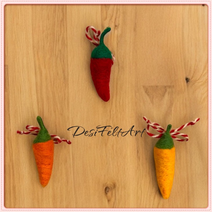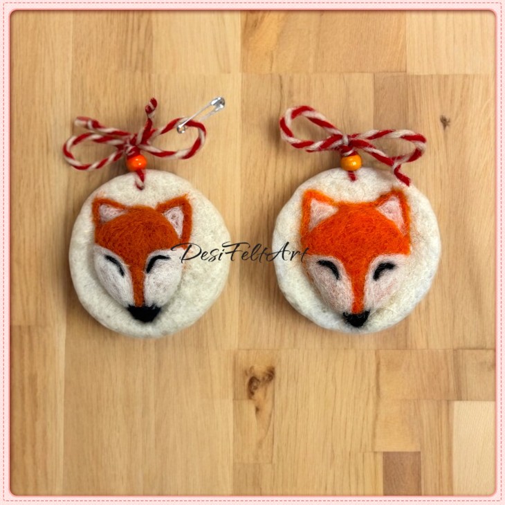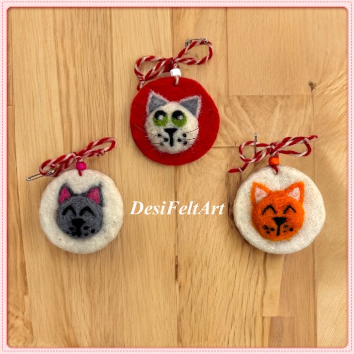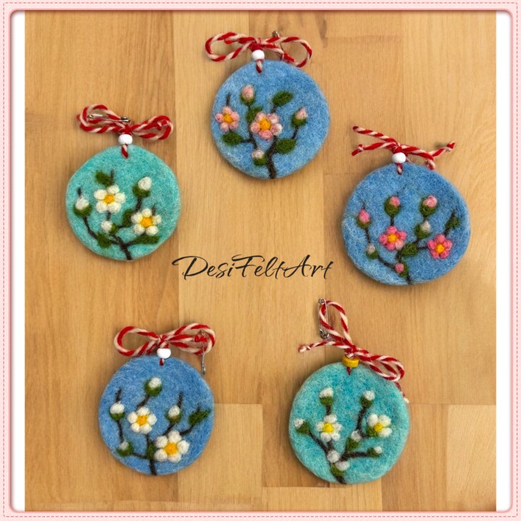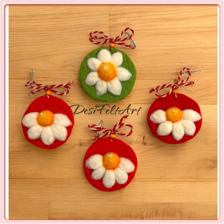 Ръчно изработени мартенички от вълна, чрез техника иглонабиване (сухо плъстене). Размери - около 5см (диаметър). Закичват се чрез безопасна игла. Цената е за 1 брой. Не са подходящи за деца под 3 години
