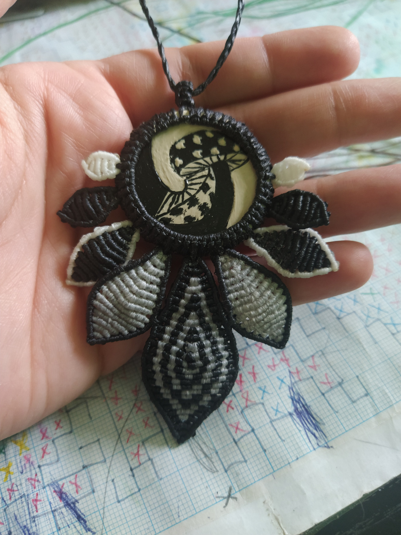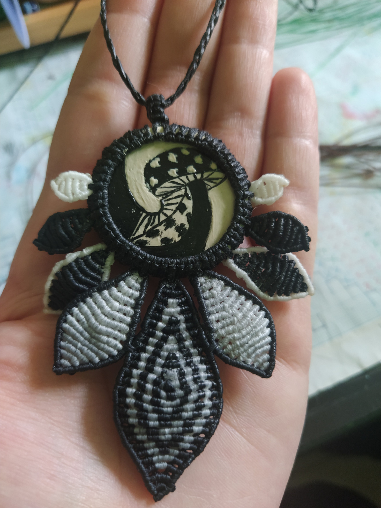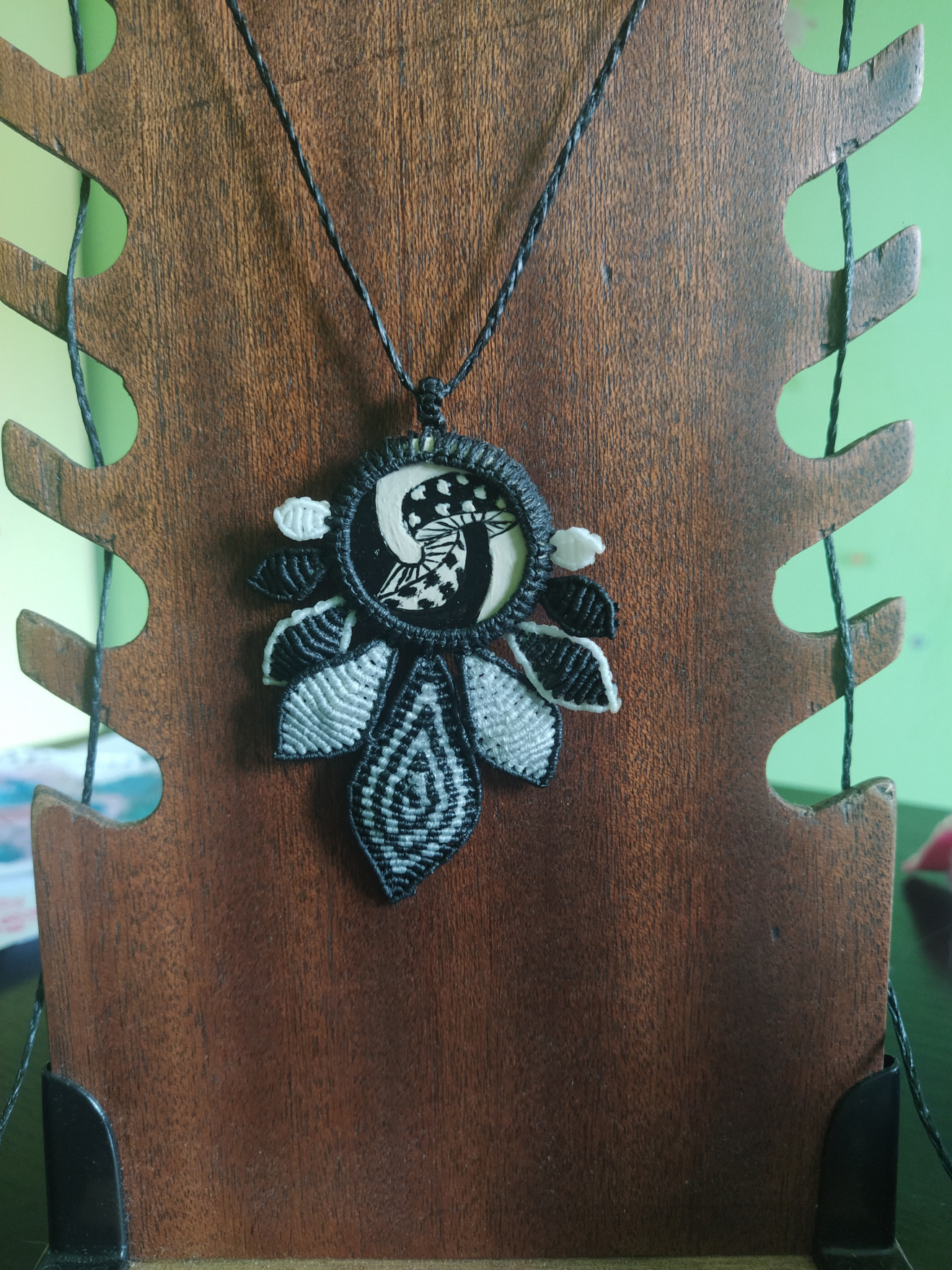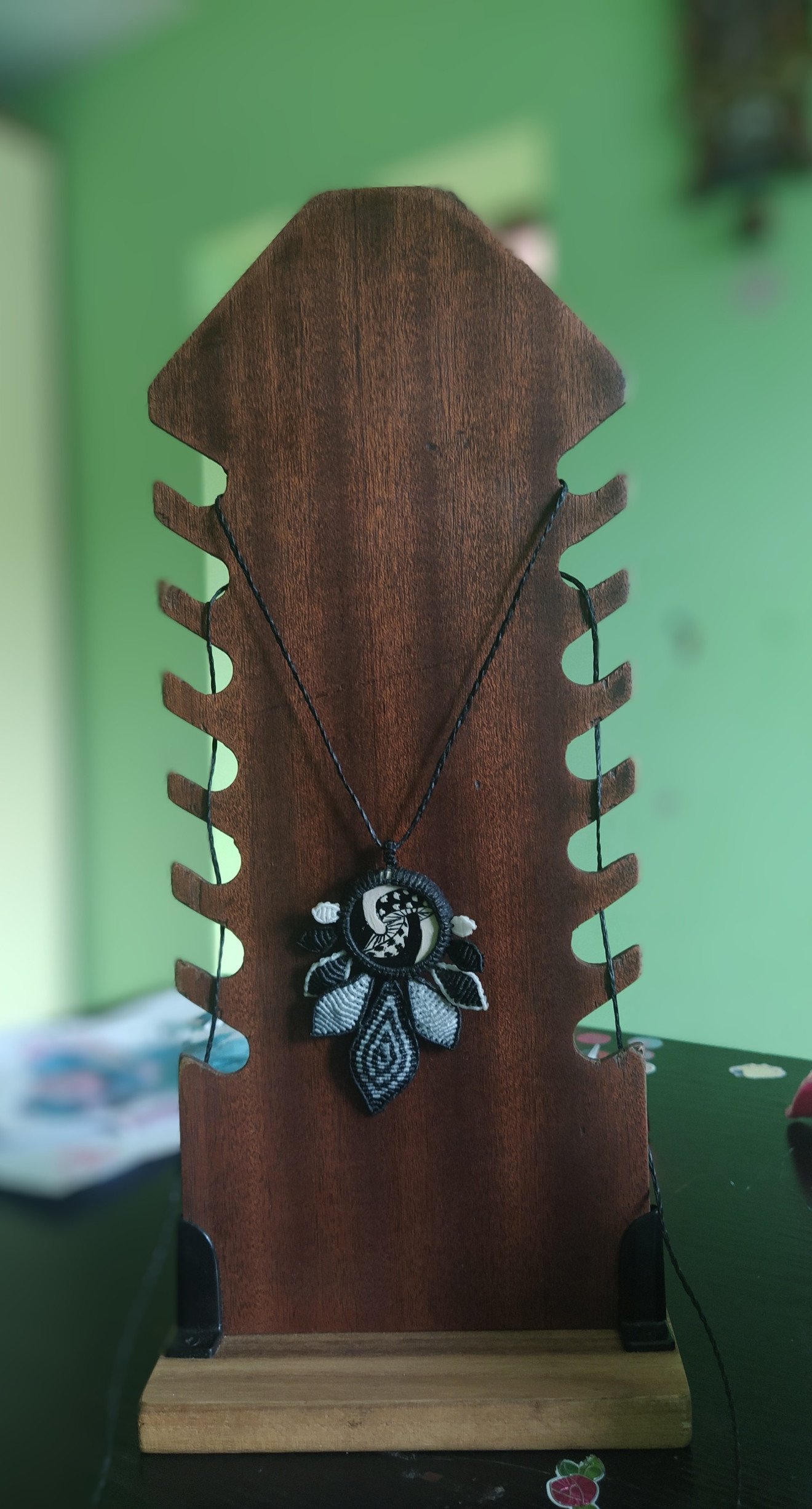 В средата е дървен количка, рисувана с акрилни бои и запечатана с лак, оплетена с восъчни конци, които продължават и оформят различни по големина листенца. Верижката също е плетена с восъчни конци, дължината се регулира чрез пристягащ възел. Може да се носи по врата (като чокър) или под гърдите, според Вашите предпочитания, тоалет и т.н. Колието може да се изработи в други цветове, с друга рисунка по Ваши идея и дизайн. Артикула идва опакован и готов за подарък