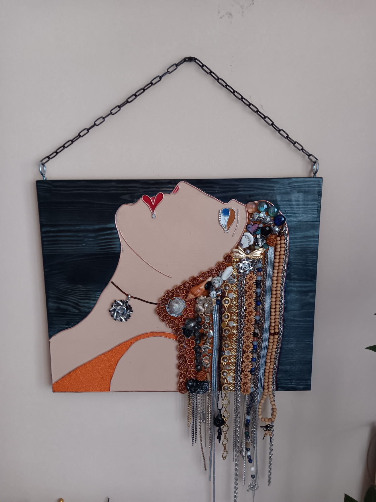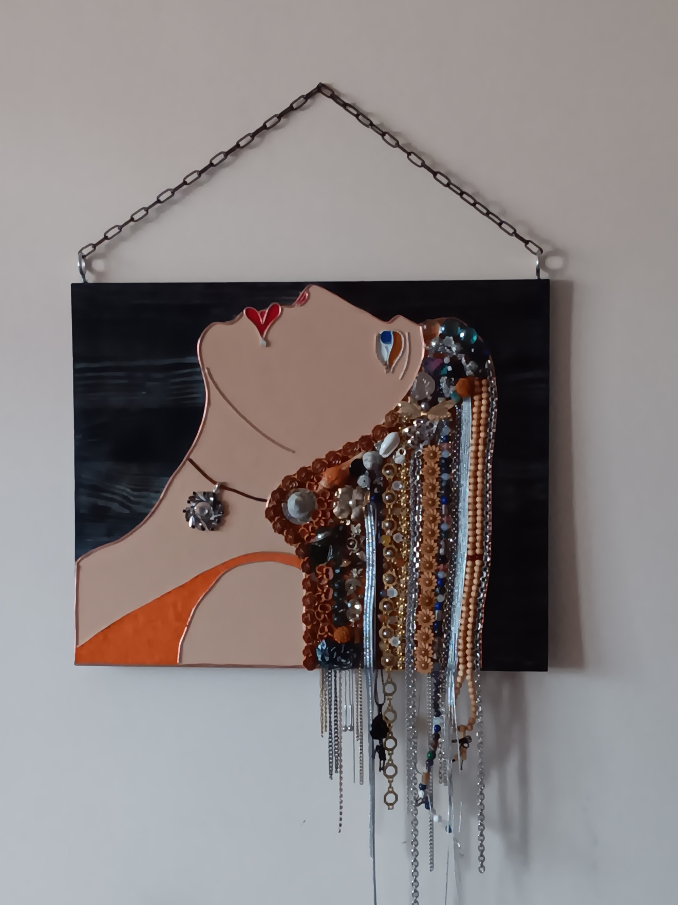 Глава на жена използвана е тепниката клоазоне, цветовете са пигменти върху дървена основа. Косата на жената е направена от различни синджири и герданчета. В творенията ми имам картина на жена но в по-малък размер.