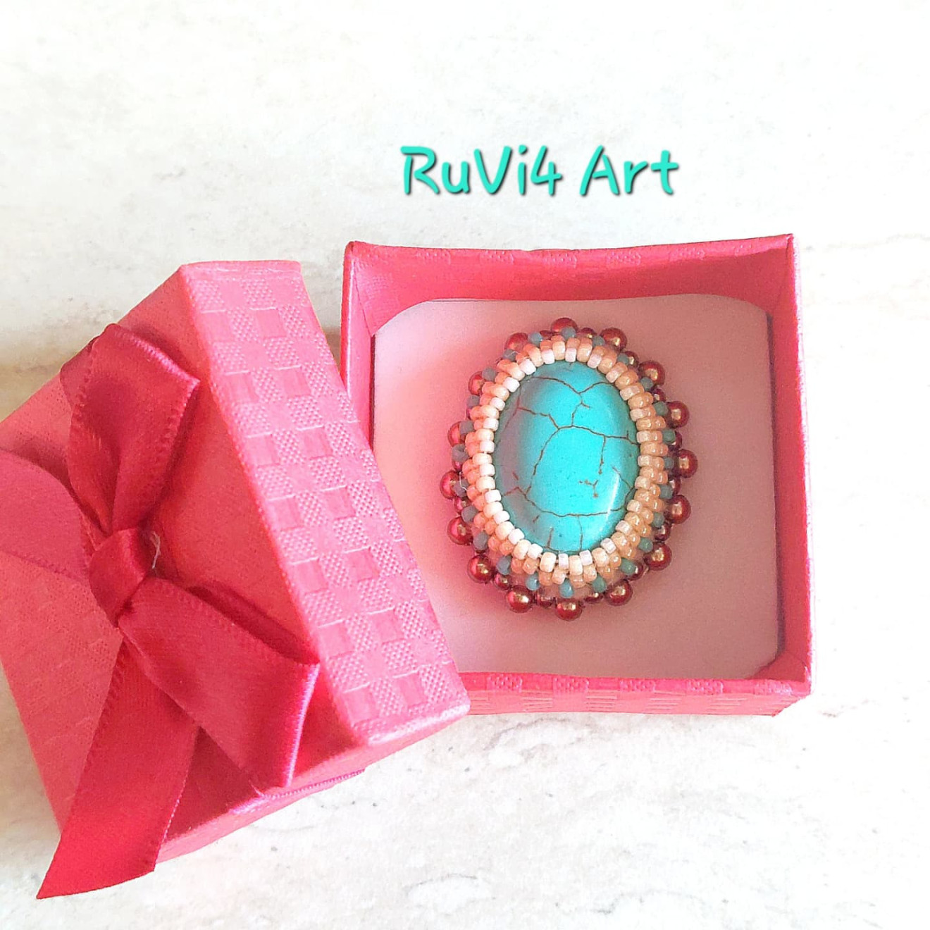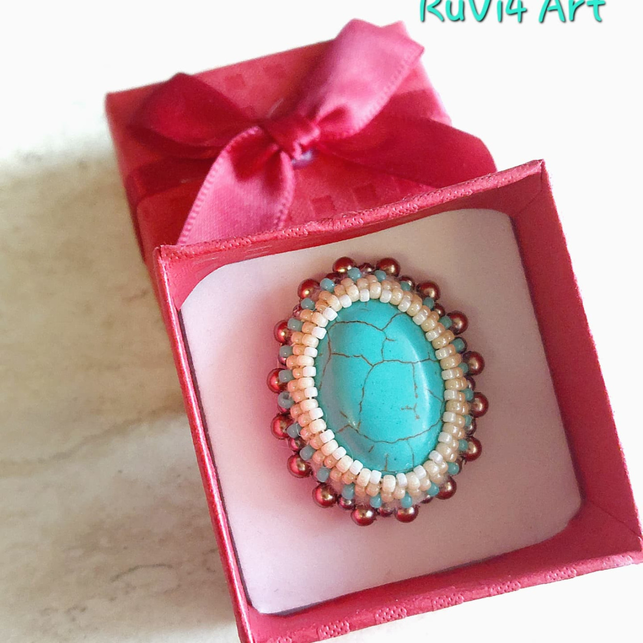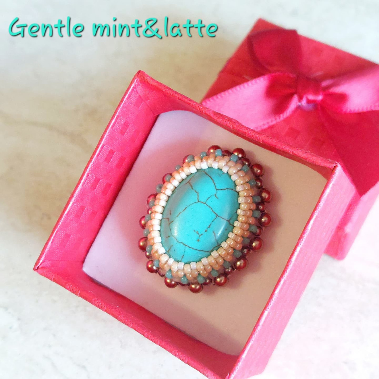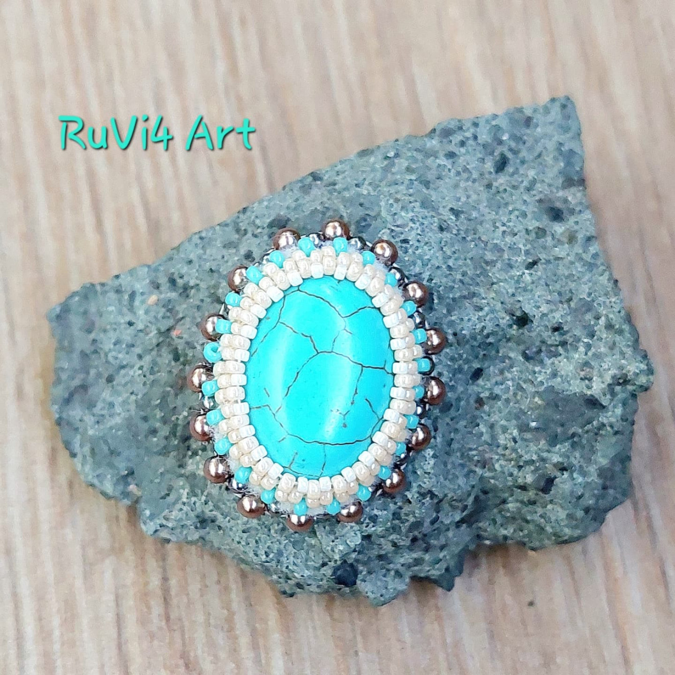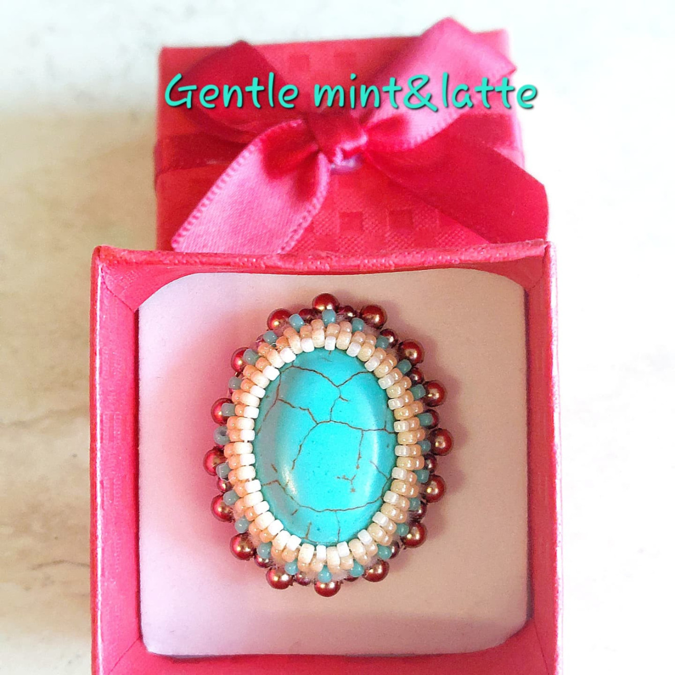 Брошка, изработена от кабошон Тюркоаз, мъниста Миюки, перли и филц.