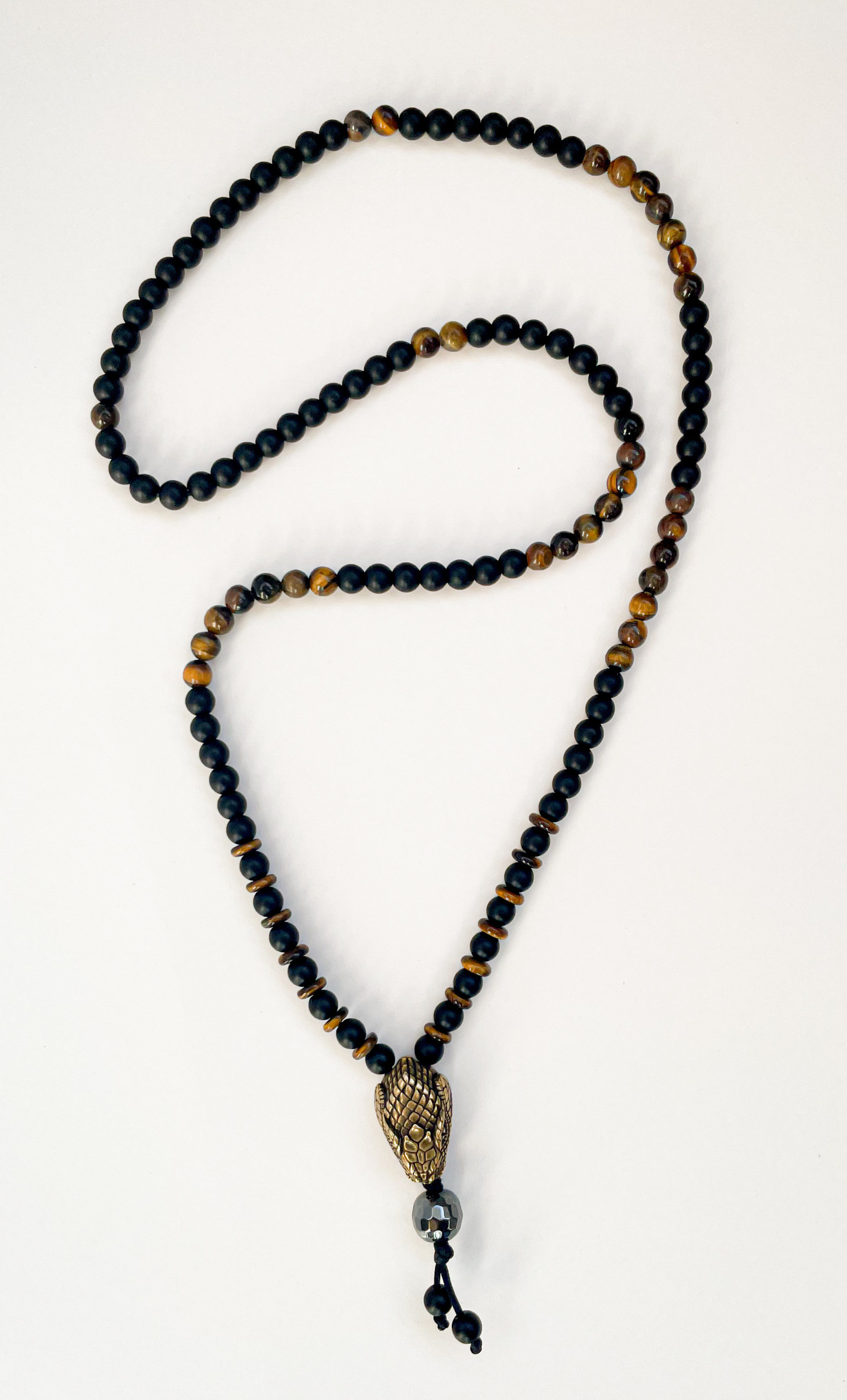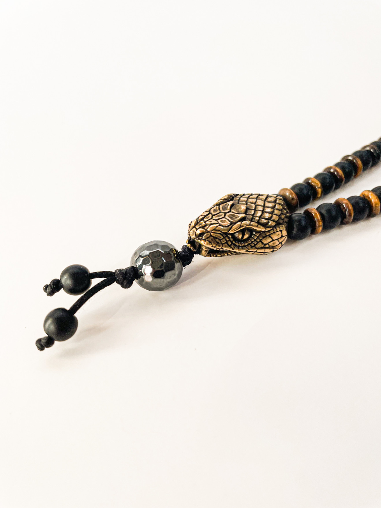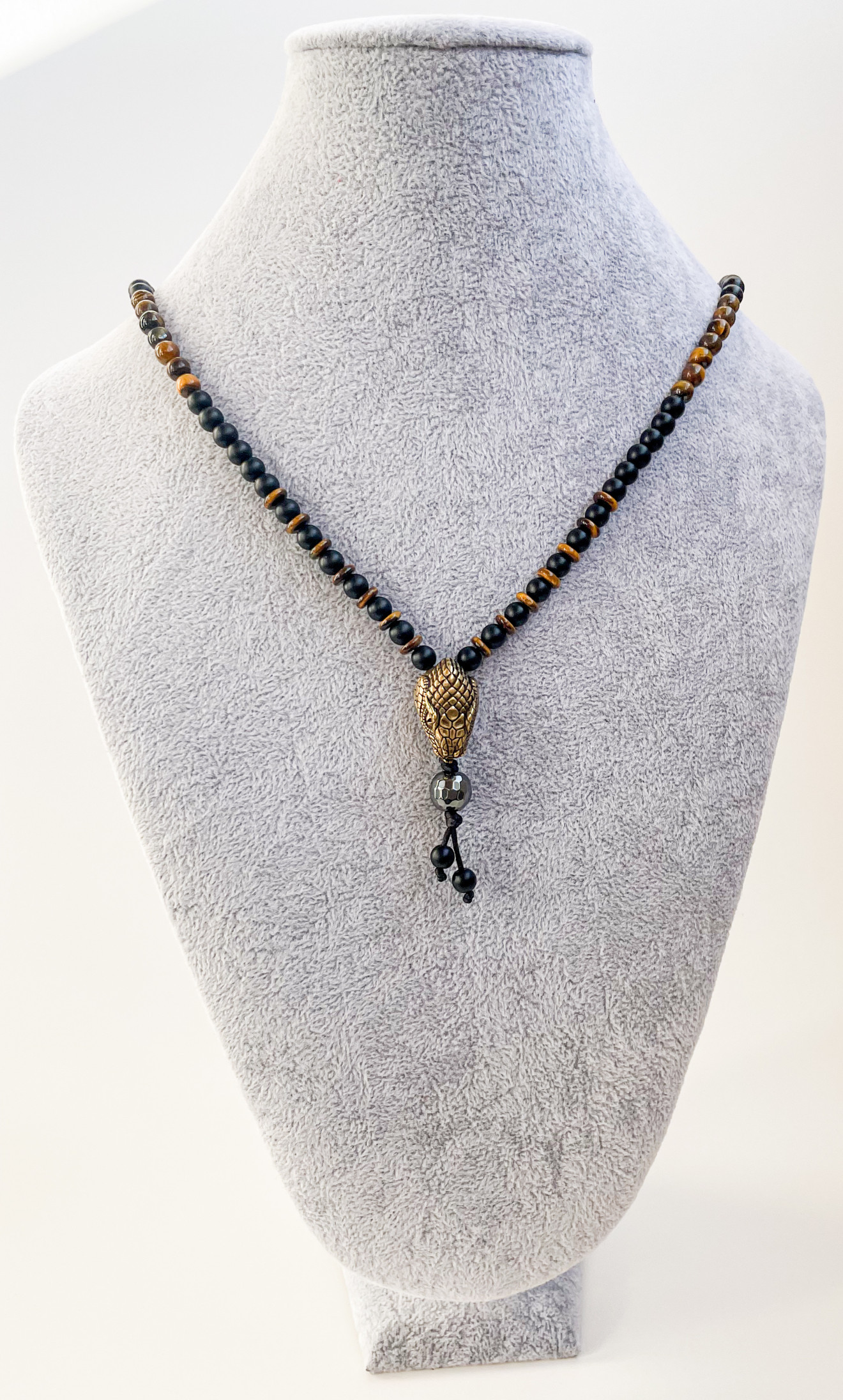 Този впечатляващ аксесоар комбинира 8мм и 6мм оникс и тигрово око, създавайки изискано и мощно бижу. Висулката – глава на змия, придава допълнителна символика и уникалност на дизайна. Всеки елемент е внимателно подбран и изработен, за да предостави максимално качество и естетика. Значение на камъните: Оникс: Известен със своите защитни свойства, ониксът предпазва от негативна енергия и поддържа емоционална стабилност. Тигрово око: Камък на защита и земна сила, тигровото око насърчава кураж и самоувереност, като подобрява яснотата на ума и фокуса. Символика на змията: Змията е символ на трансформация, обновление и сила. Висулката във формата на глава на змия добавя мистичен и автентичен акцент към гердана. www.vande.bg Този модел подлежи на корекция в дължината. Ако желаете персонализиран размер моля оставете бележка при поръчка с желания размер в см или се обадете на тел. 0887 107 562 ,за да уточните размера с бижутер от ателие VanDe. Изработва се ръчно от квалифицирани бижутери в ателието на VanDe. Времето за изработка и доставка е от 1 до 4 работни дни. Подаръчна опаковка