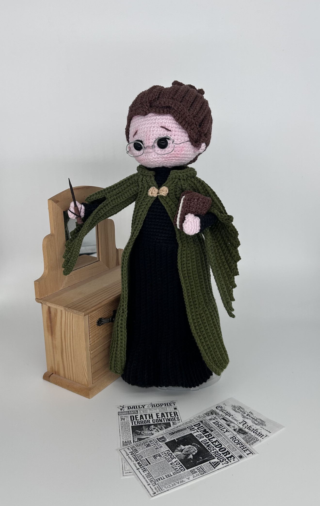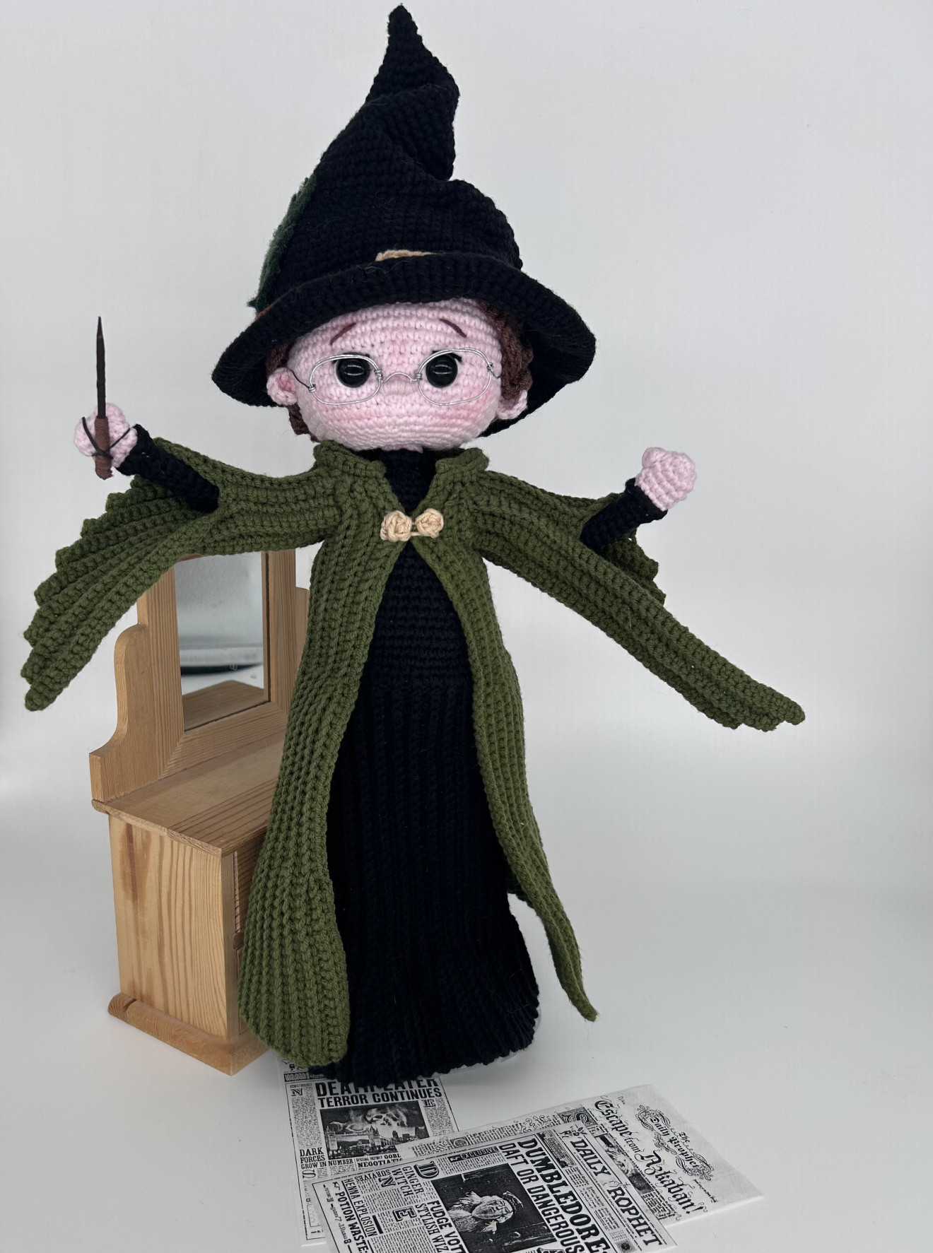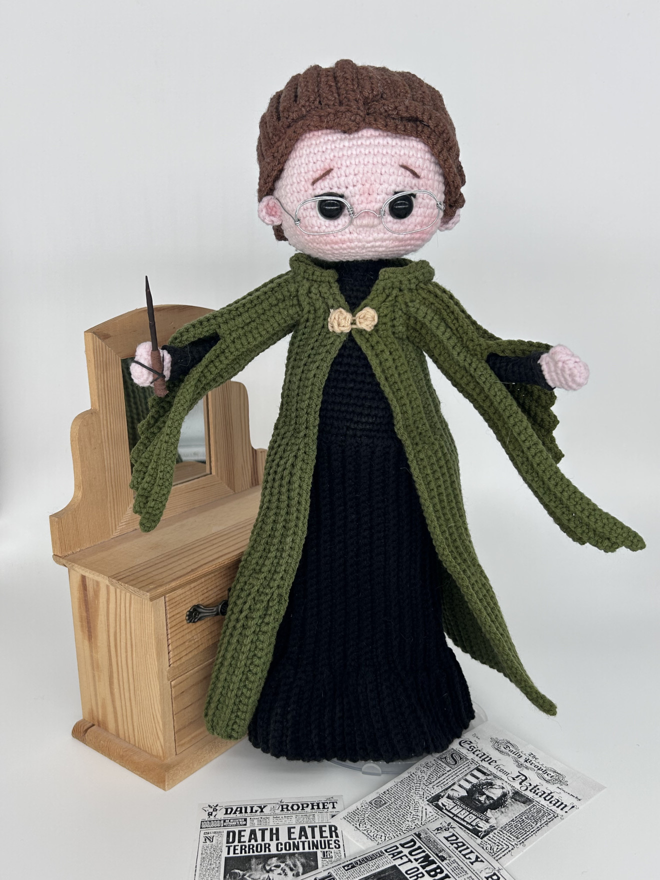 Фигурата е изпълнена с прежда акрил и памук, има метална конструкция в телцето и е висока 34 см. Има си учебник по "Трансфигурация" и вълшебна пръчица.
