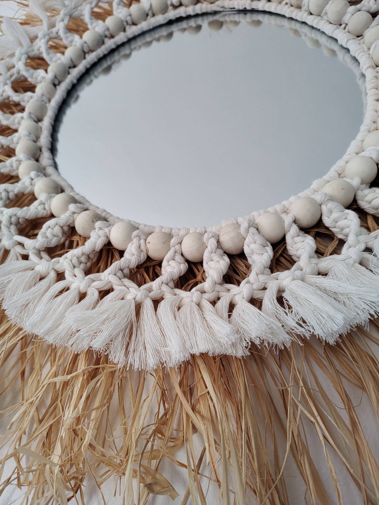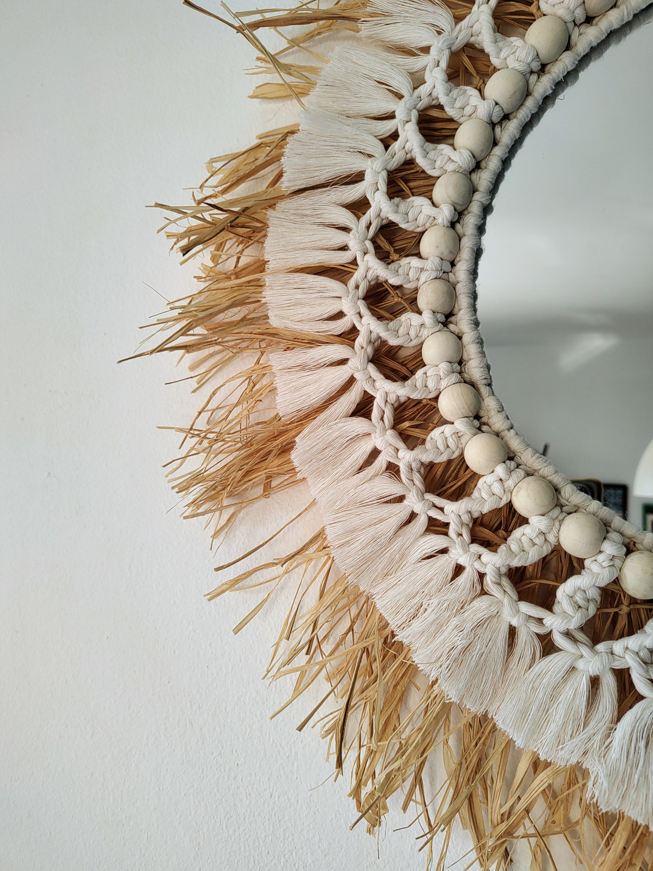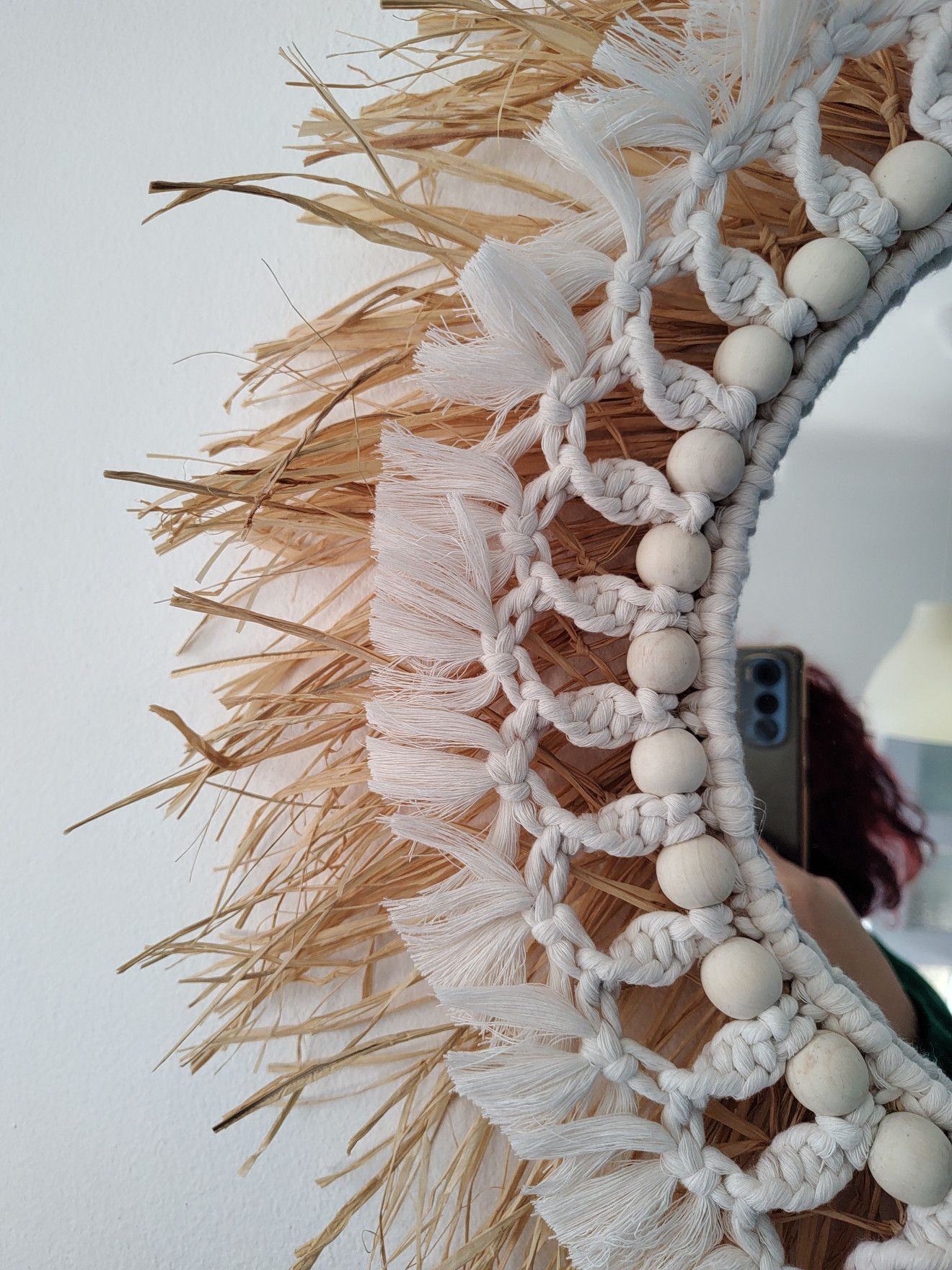 Бохо огледало изработено от рафия и памучни макраме конци и дървени елементи. Огледалото е с диаметър 28см. Готово за окачване.