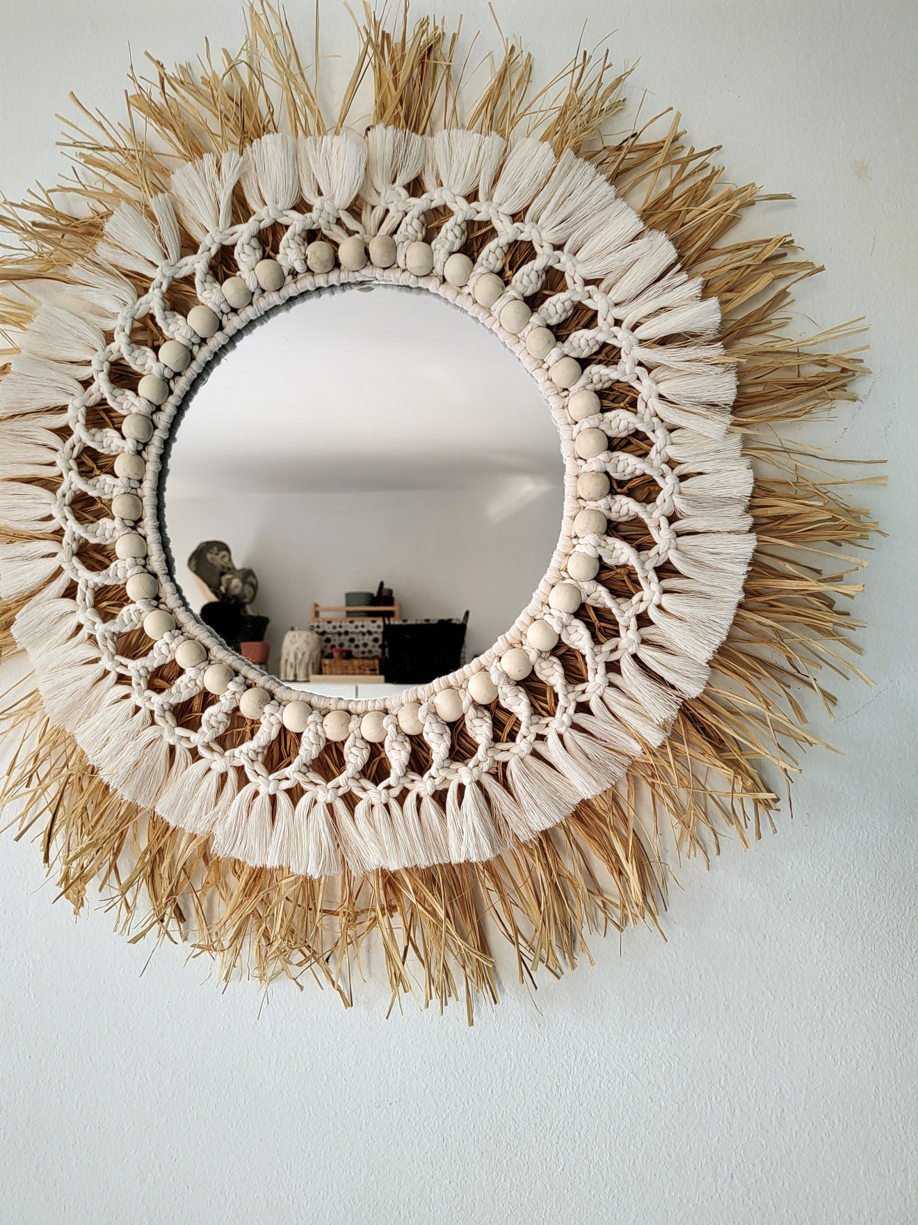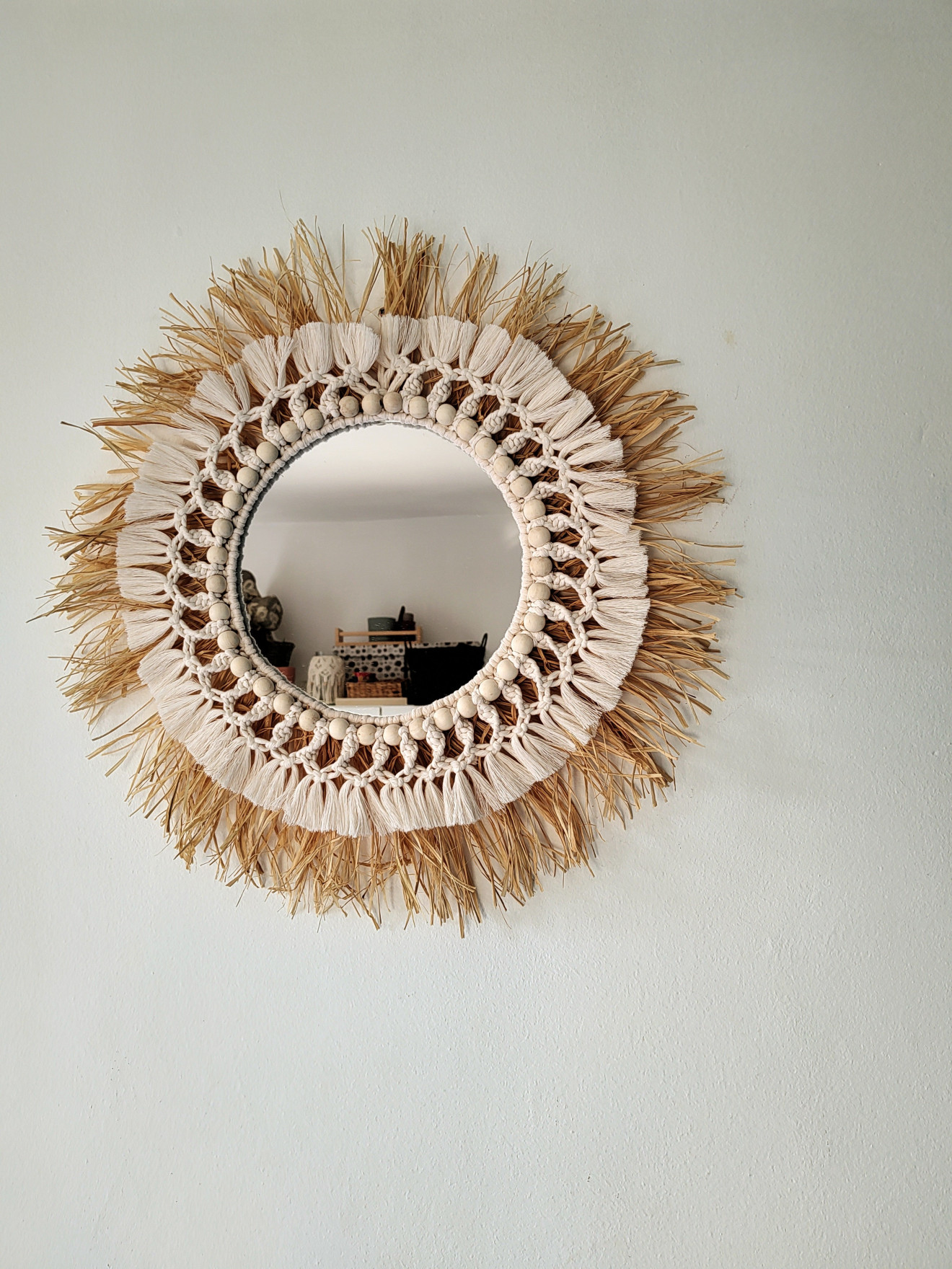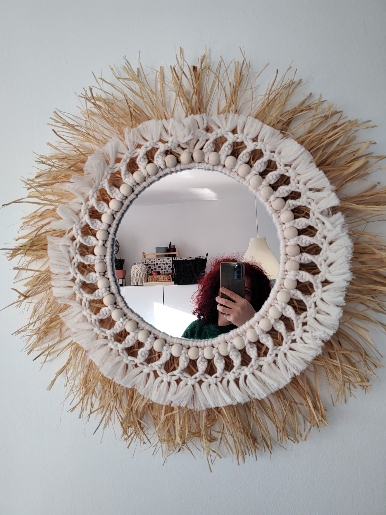 Бохо огледало изработено от рафия и памучни макраме конци и дървени елементи. Огледалото е с диаметър 28см. Готово за окачване.