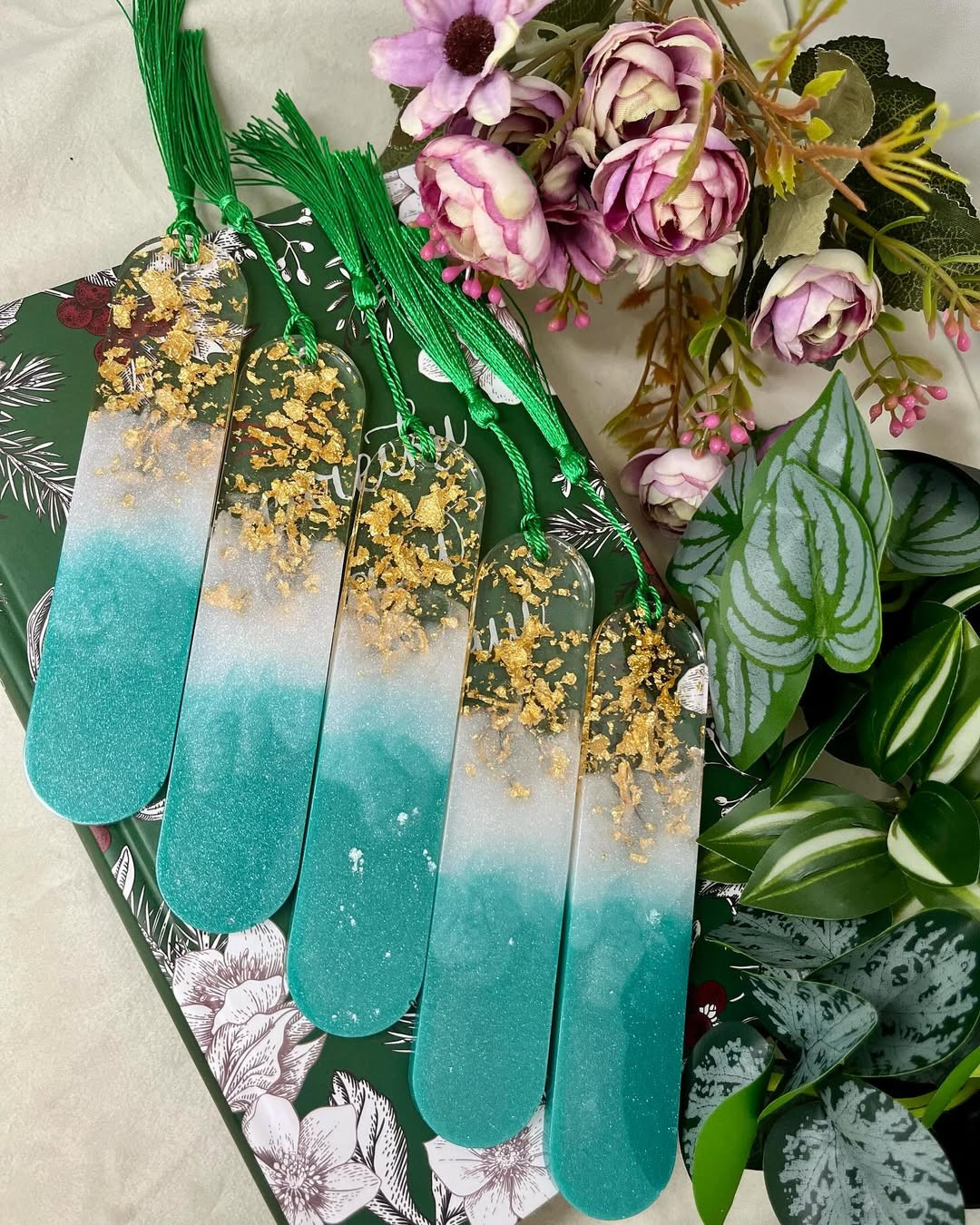 Книгоразделители в бяло,тюркоазено и безцветна смола.Като допълнение сме добавили и златисто фолио за блясък ⭐️✨ ✅Всички моделчета са уникални и неповторими сами по себе си. ✅Продават се,както индивидуално,така и в комплект. ✅Могат да бъдат изработени в цветове по Ваш избор.