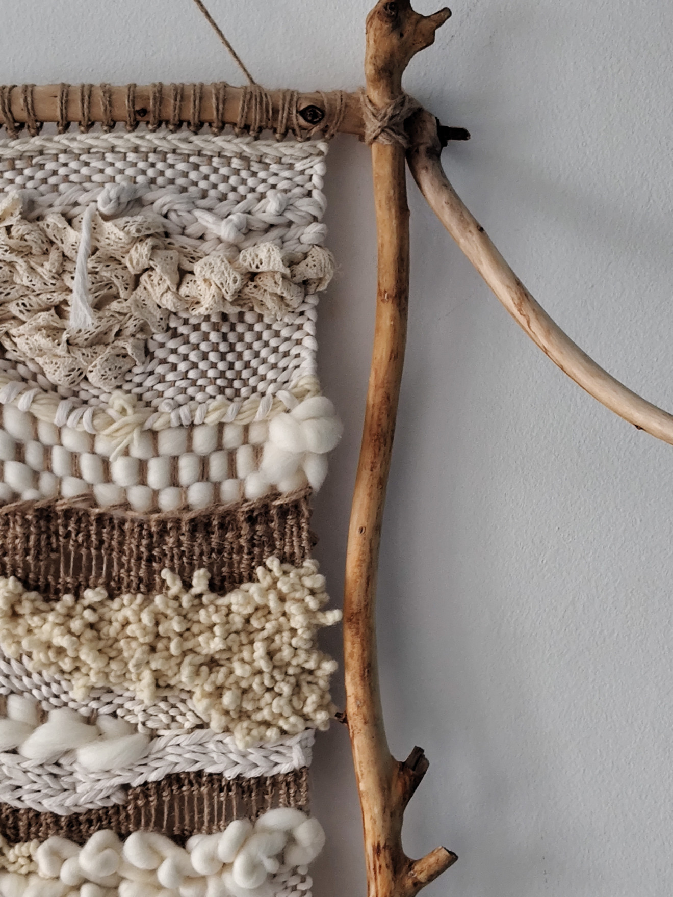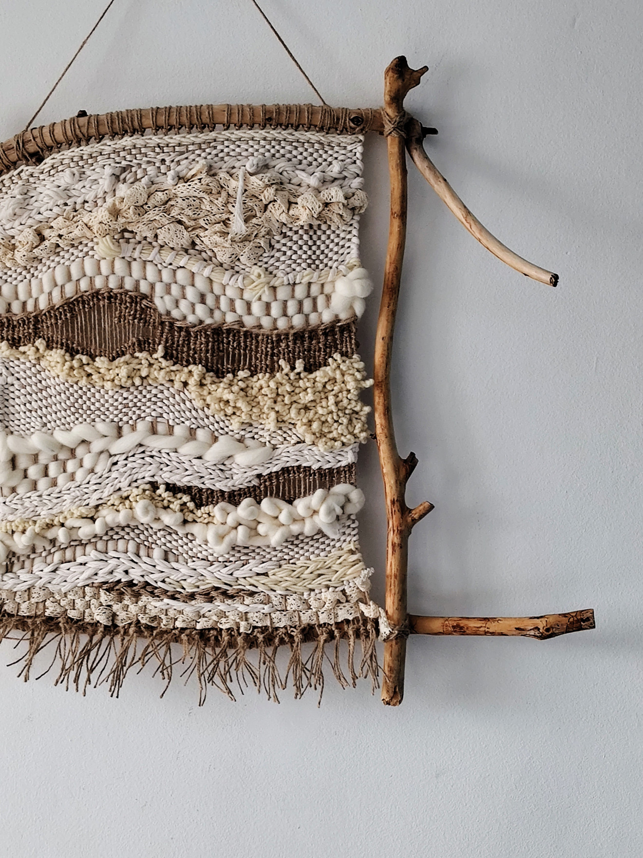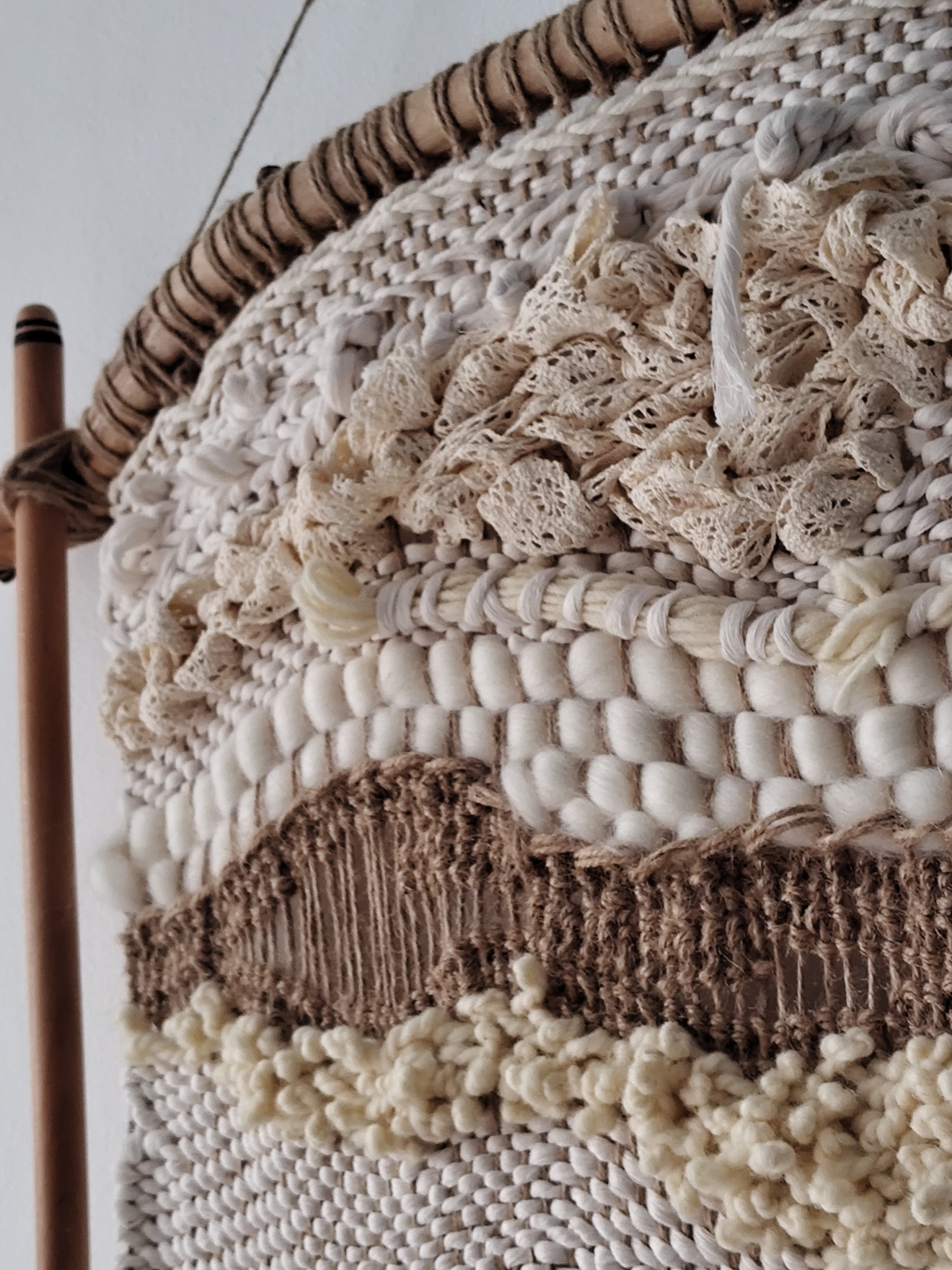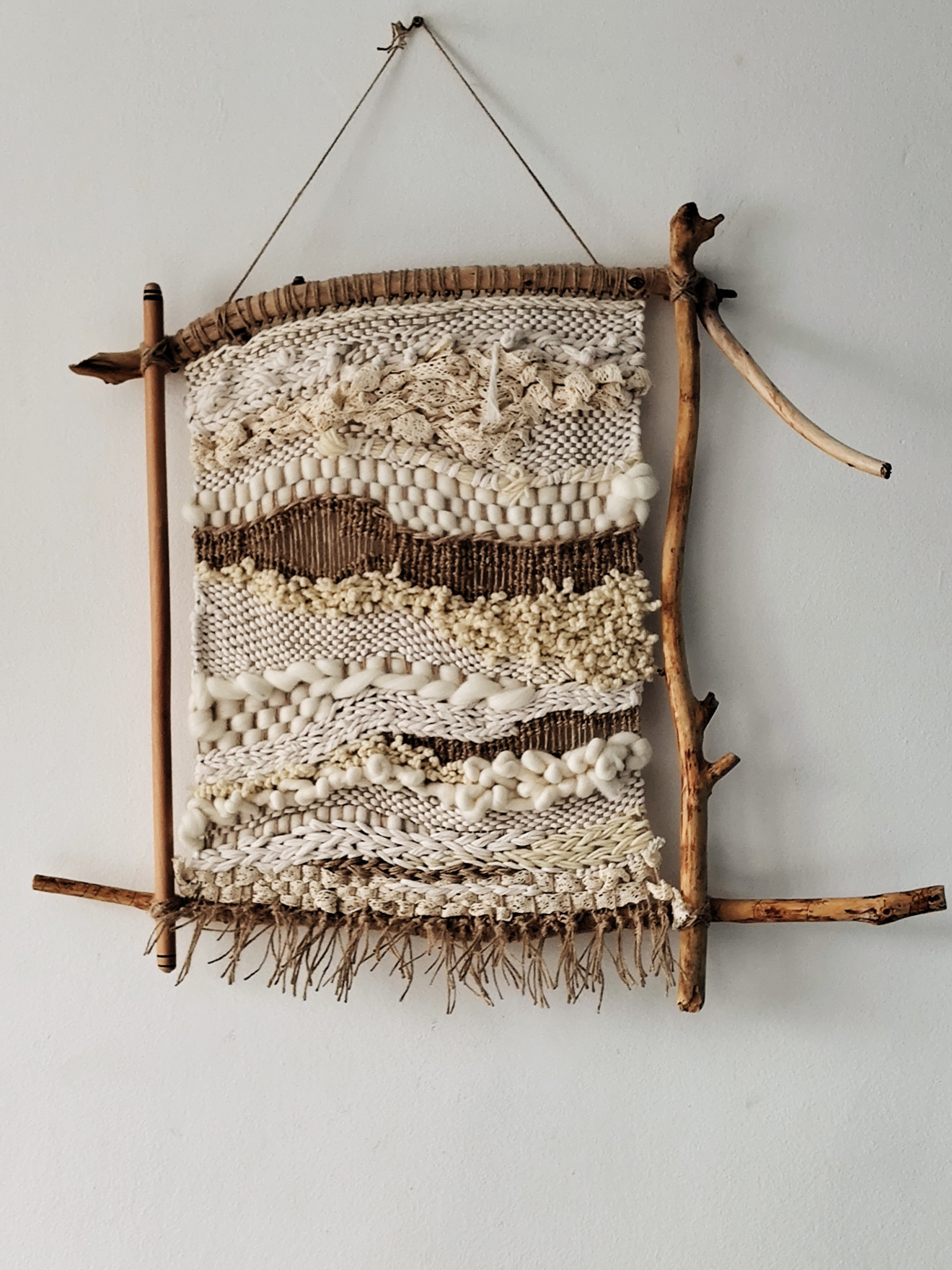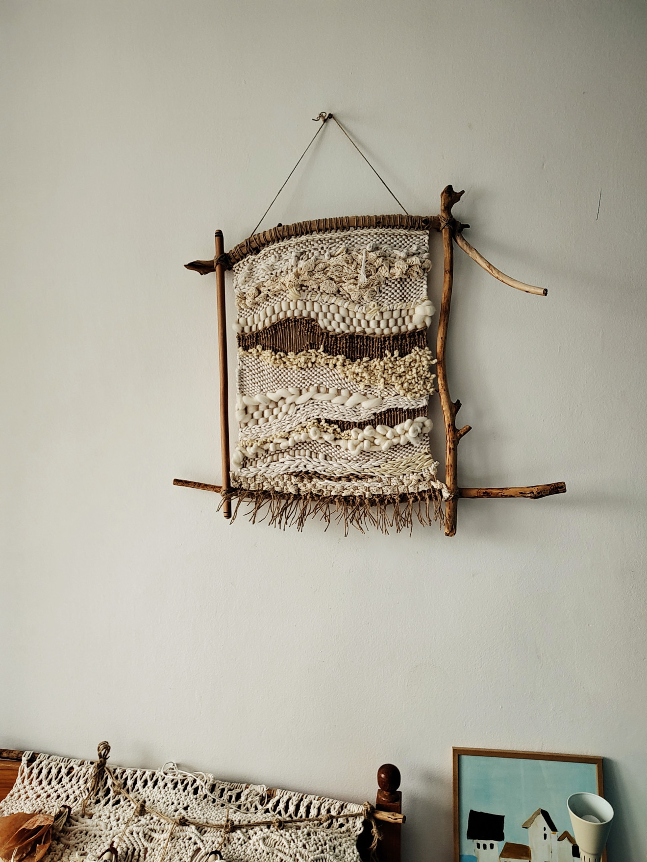 Ръчно изработено пано от различен материал и дебелина конци -памучни ,канап ,вълна и дантела за разкош. Рамката е изработена от мен и е от естествени дървени пръчки с различни форми. Тъй като пръчките са изпъкнали извън паното ,размерите са крайни на дължината и ширината .
