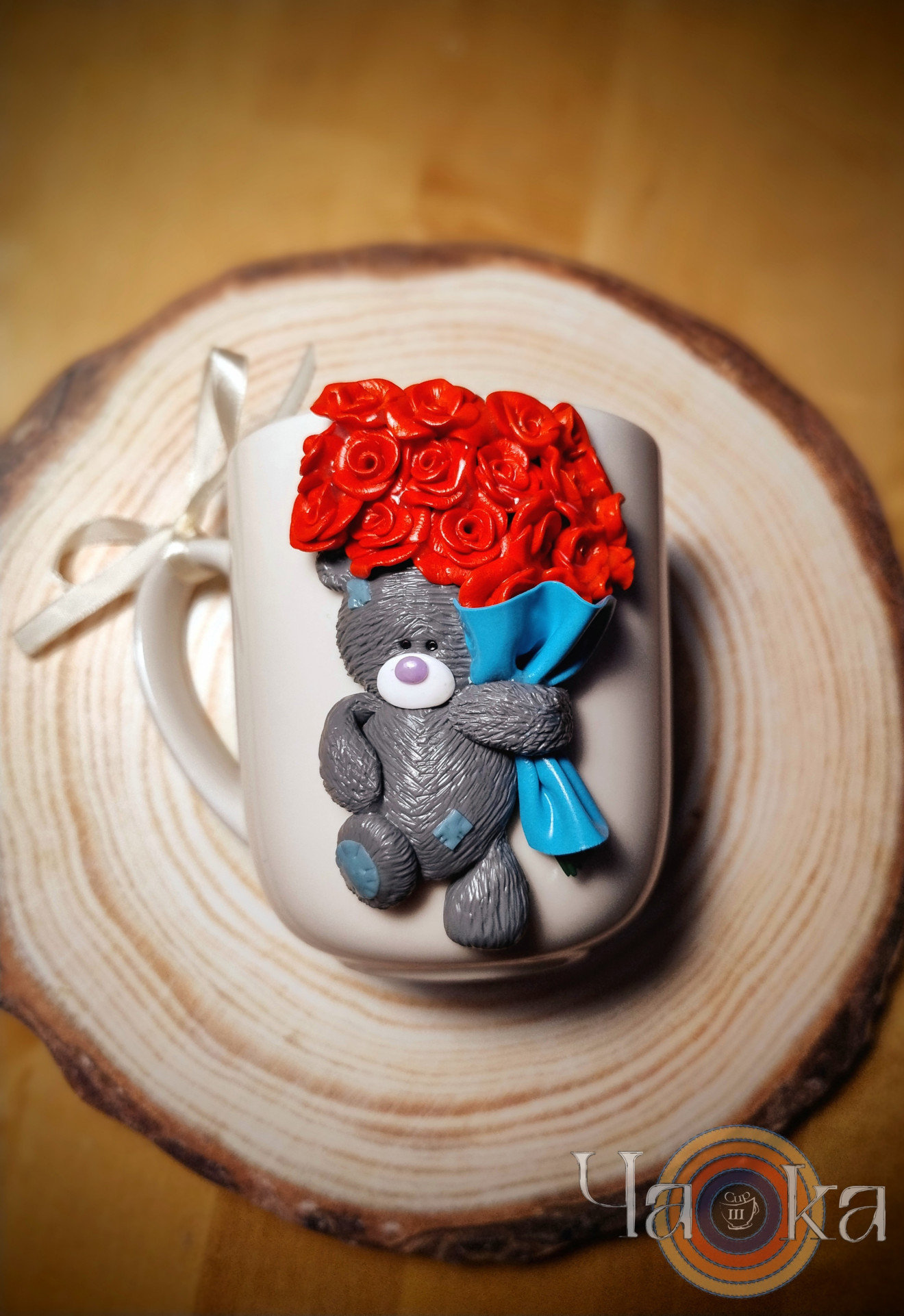 Представям ви една много симпатична сладурска чаша мече с букет от рози, подходяща за Денят на влюбените или за любимата жена за Осми март.