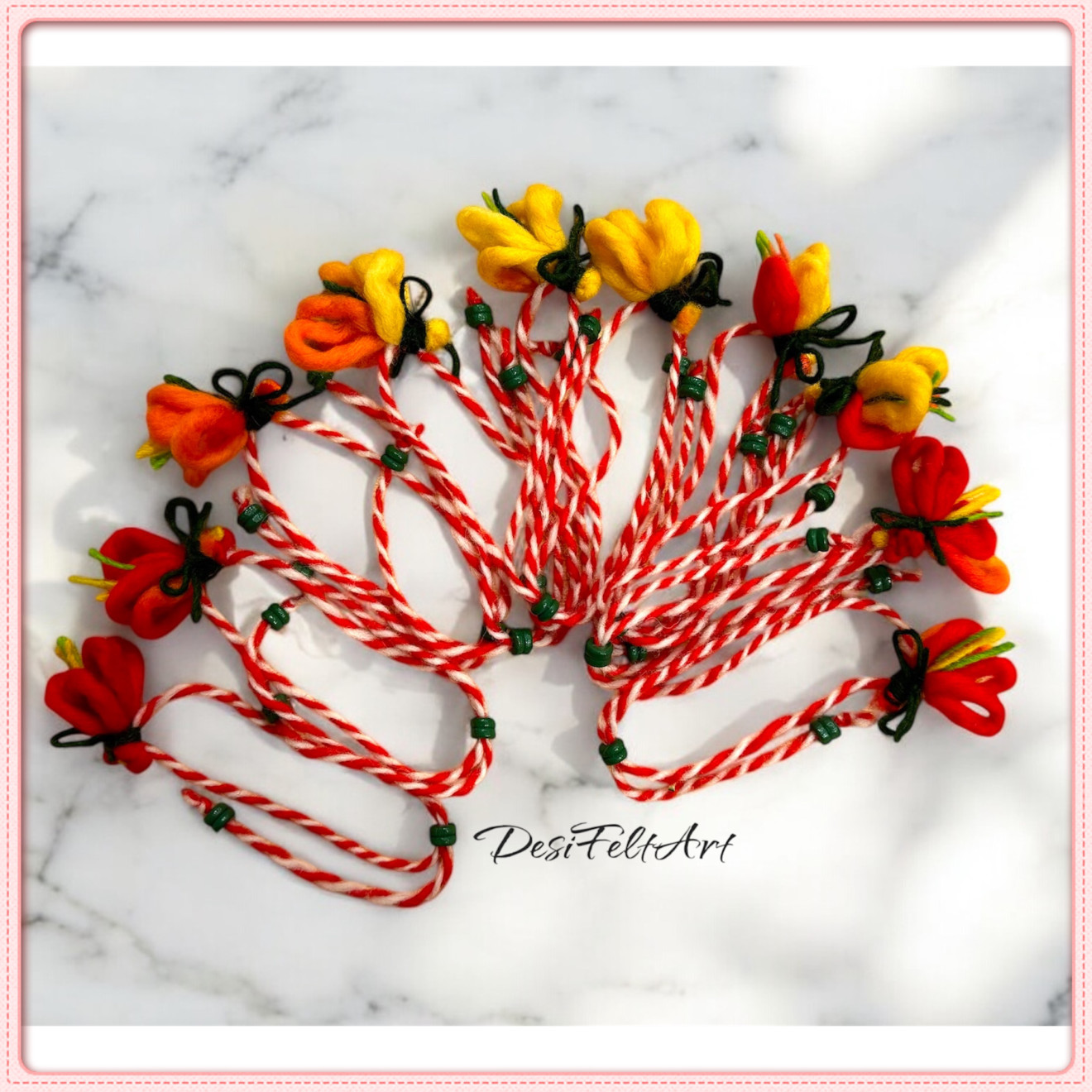 Ръчно изработени мартеници от фина вълнена прежда и дървени елементи.