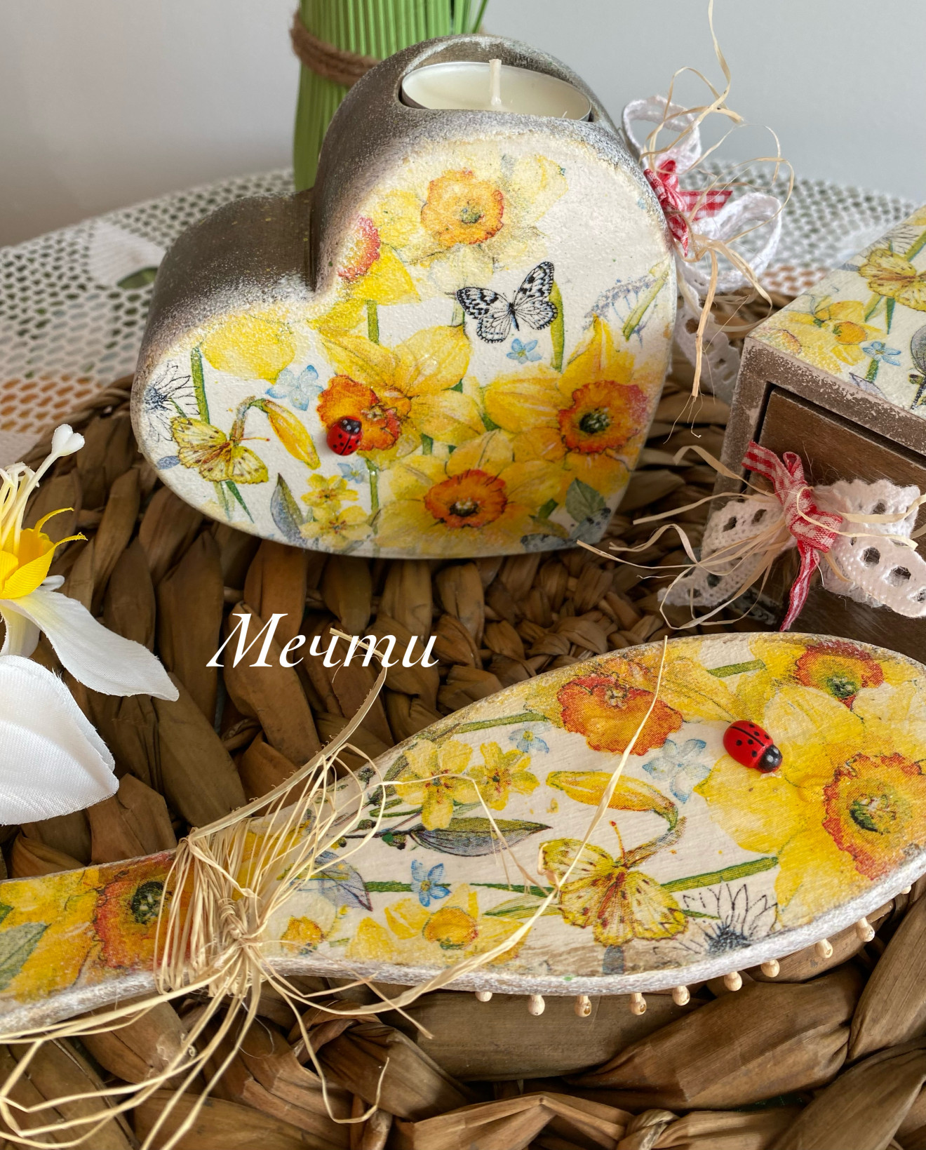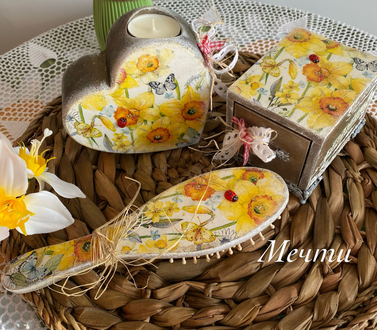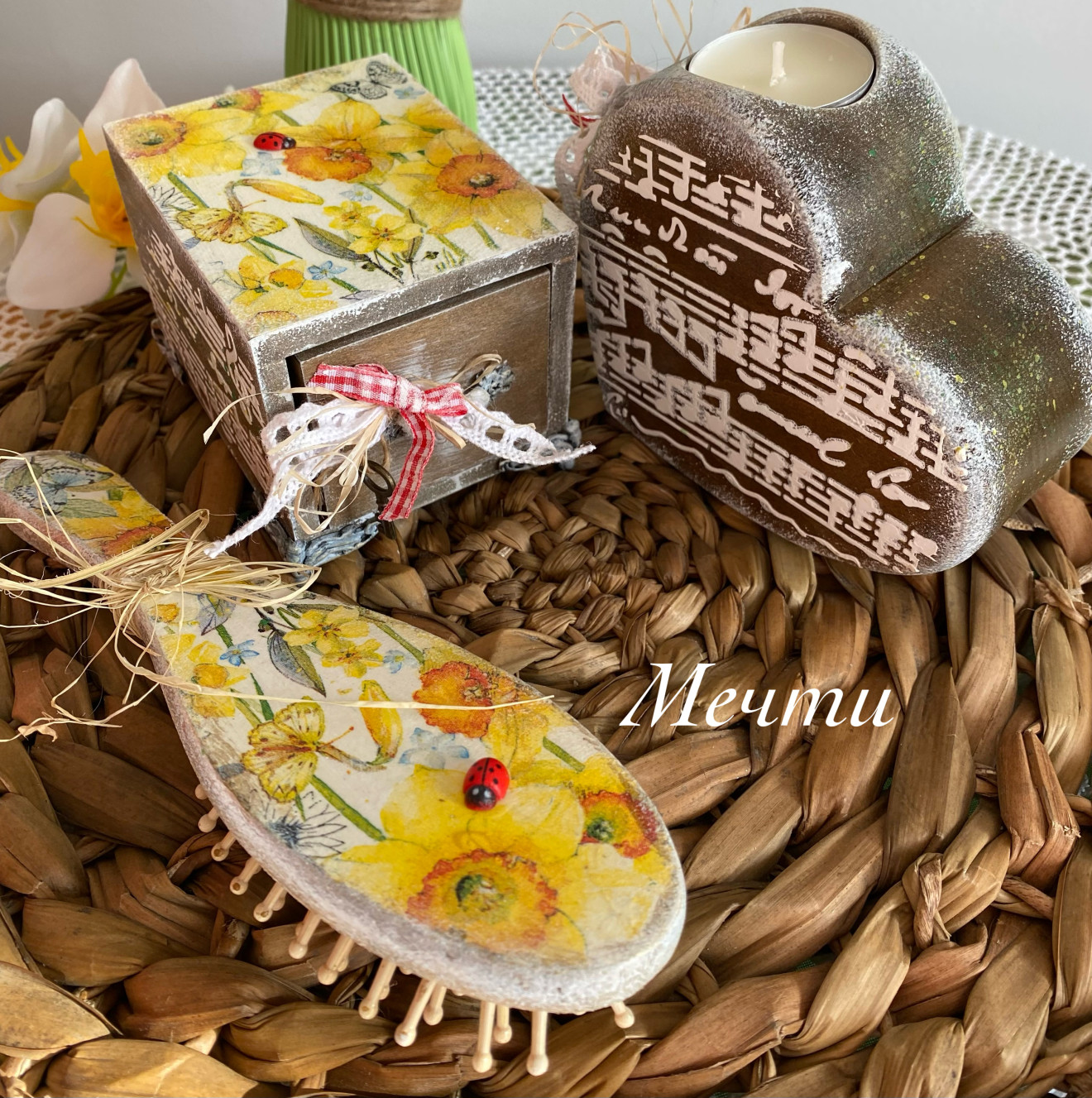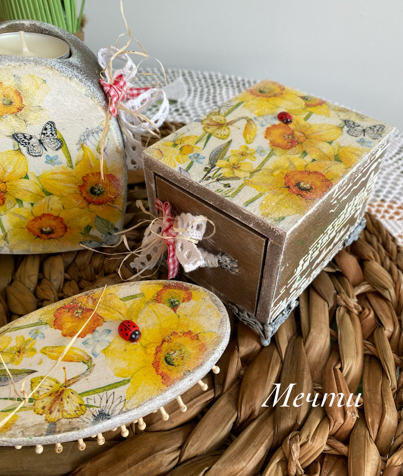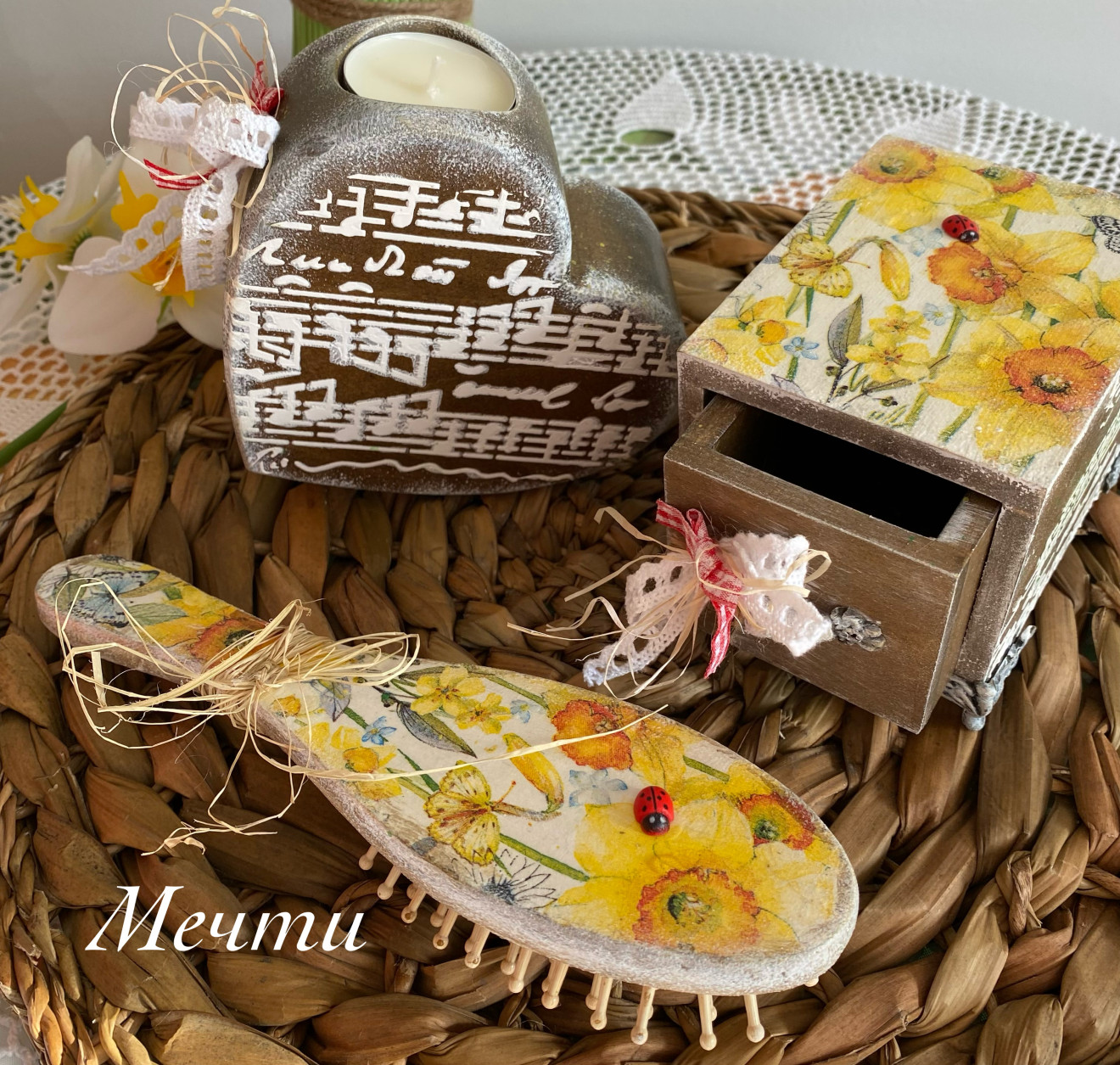 Нарциси, нарциси, нарциси… Кутийка от липа, декорирана с декупаж, дантела, рафия, метални елементи. Размери; 10см/8 см./7см. Свещник и четка за коса със същите мотиви. Свещник-25лв. Четка-20лв.