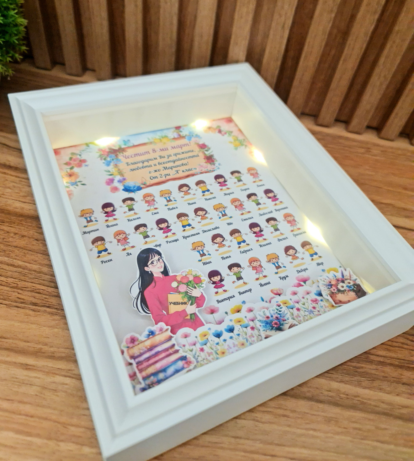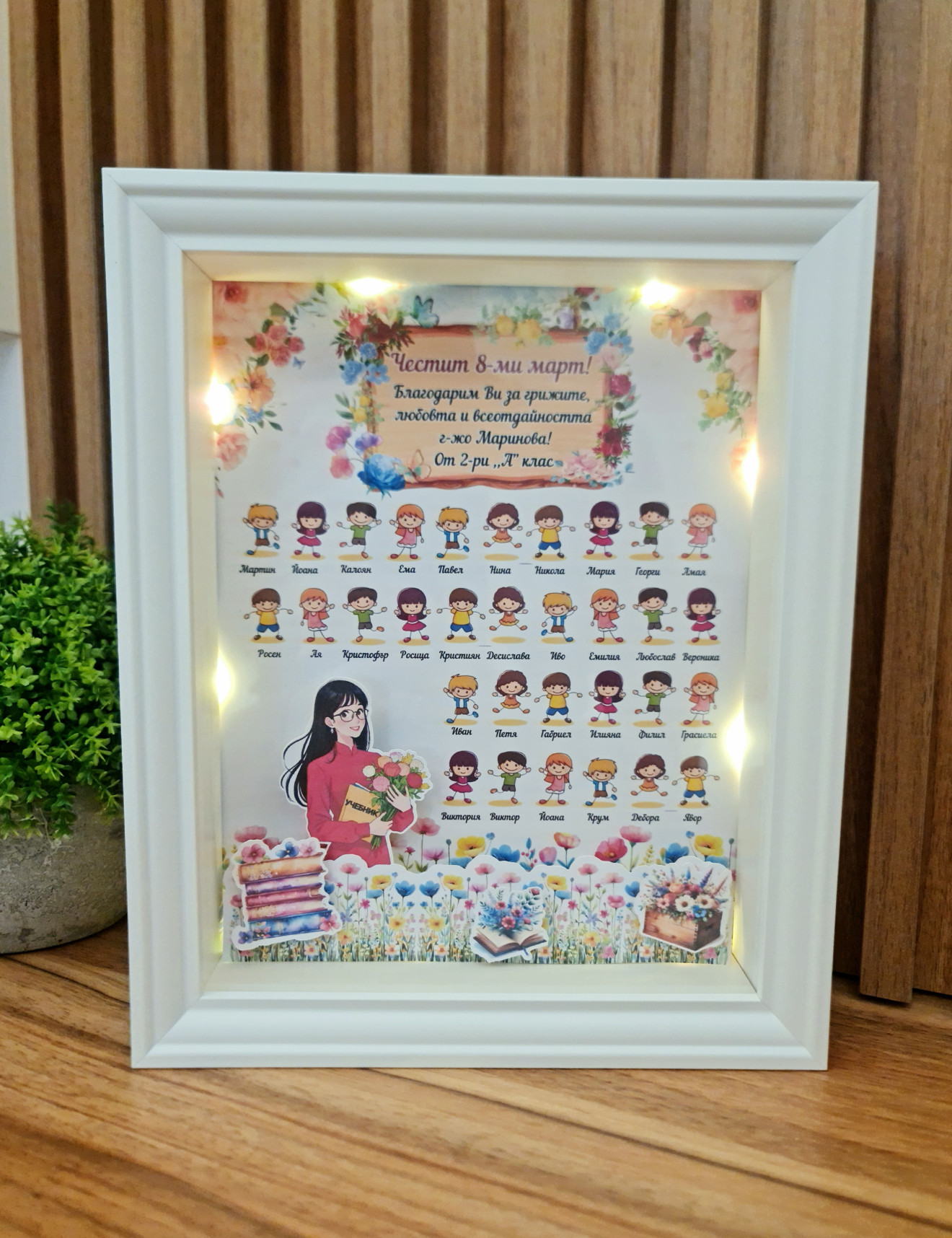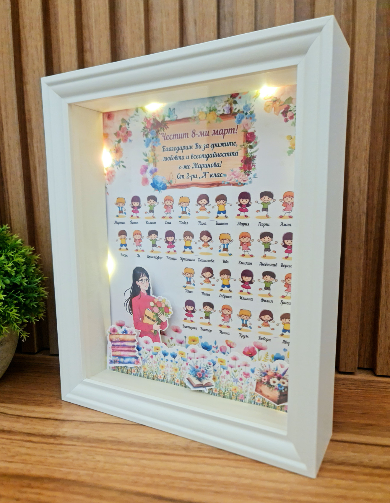 ? Специален подарък за 8-ми март – Светеща 3D рамка за учители! ?✨ Покажете признателността си към любимите учители с уникален подарък, който ще им напомня колко са ценни! Нашите светещи 3D рамки се изработват с имената на децата, пожелание за учителя или със снимка и дизайн по Ваш избор. ? С нежна LED светлина – идеална за класната стаята или нощна лампа ? Размер 23/28 и дълбока 6см Подарете нещо наистина специално този 8-ми март! ❤️ ? Поръчайте сега и не оставяйте за последният момент на лично съобщение или 0877434509