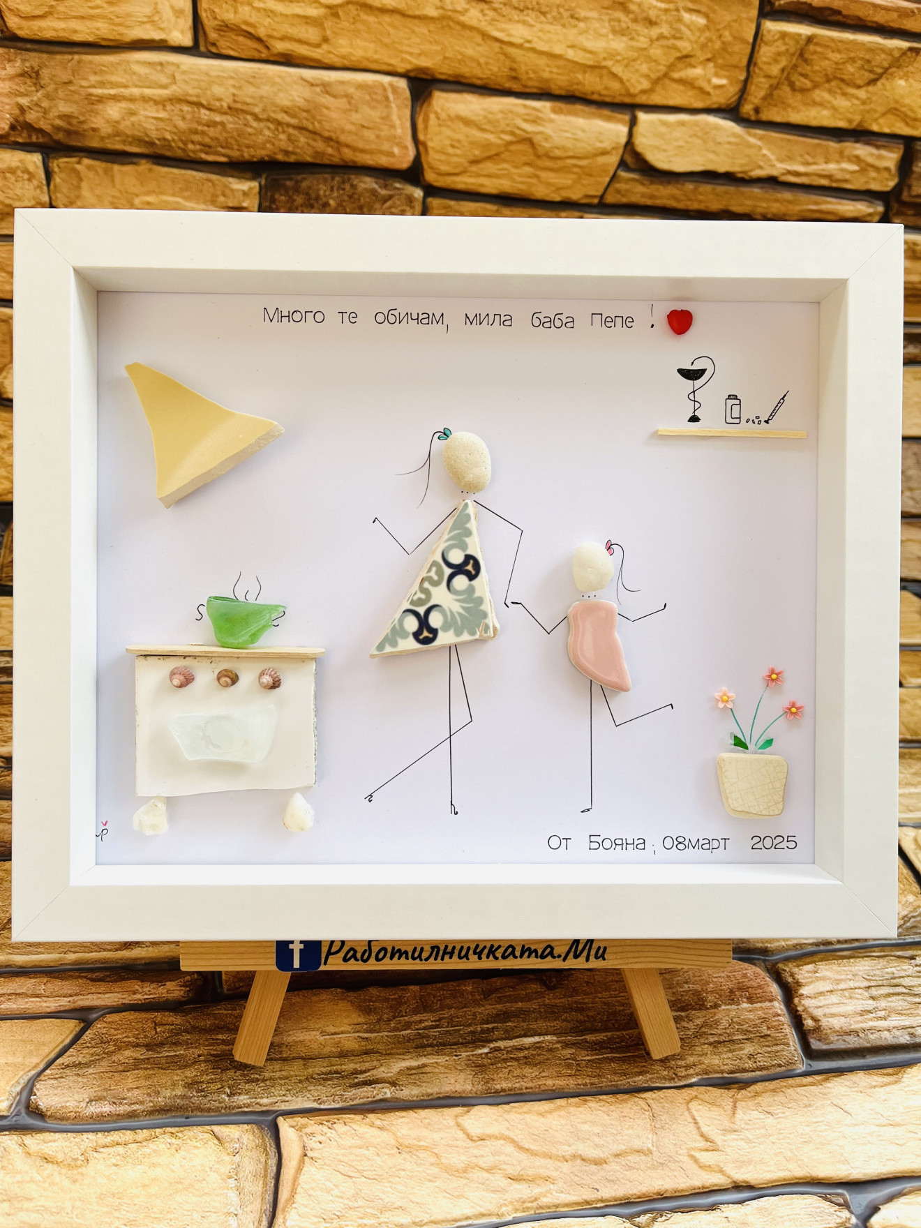Здравейте, вие избирате ? Цени за пана: 15/20 см – 40 лв 20/25 см – 50 лв 20/30 см (А4) – 60 лв 20/40 см – 70 лв 30/40 см – 80 лв 40/50 см – 100 лв Това от снимката е 20/25 Рамката е включена в цената Време за изработка към момента е около 10дни ?