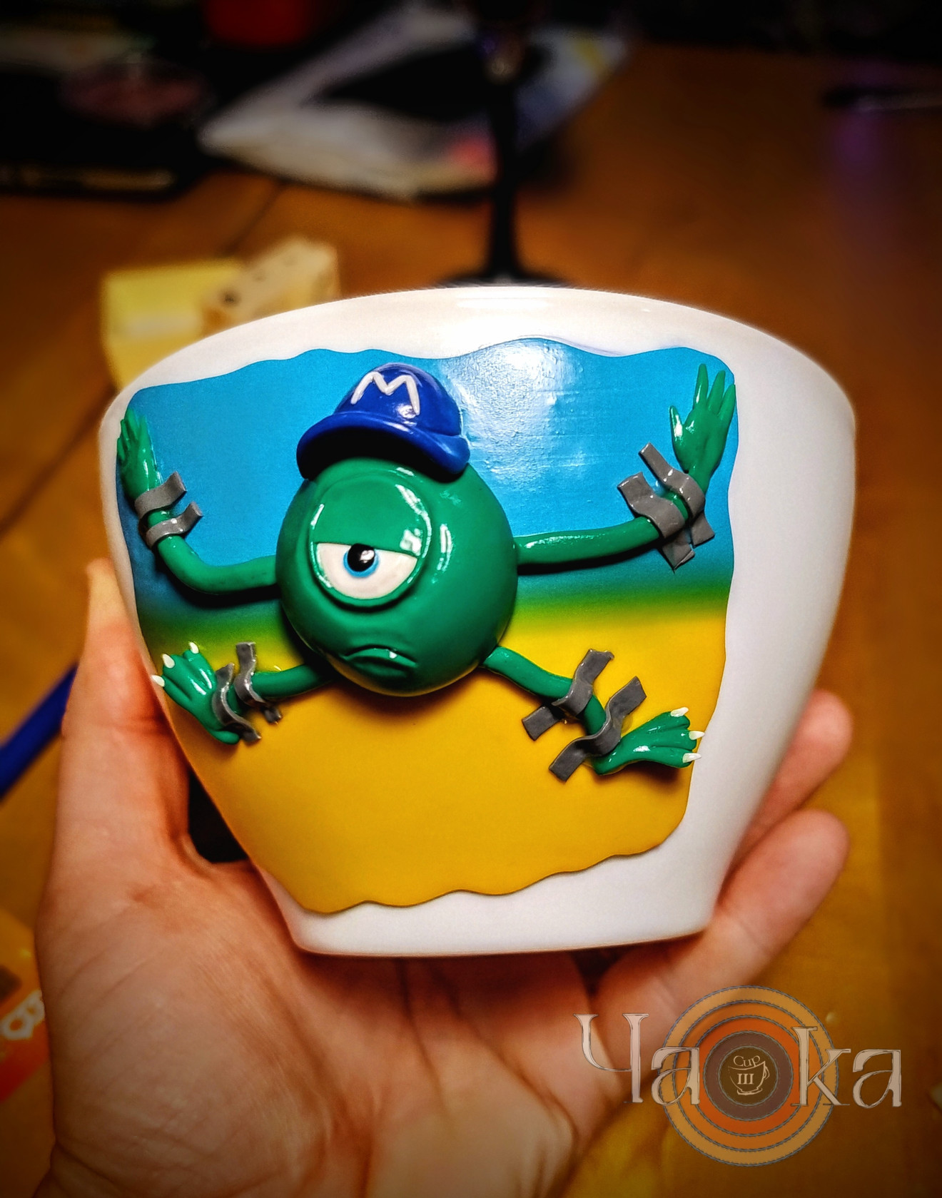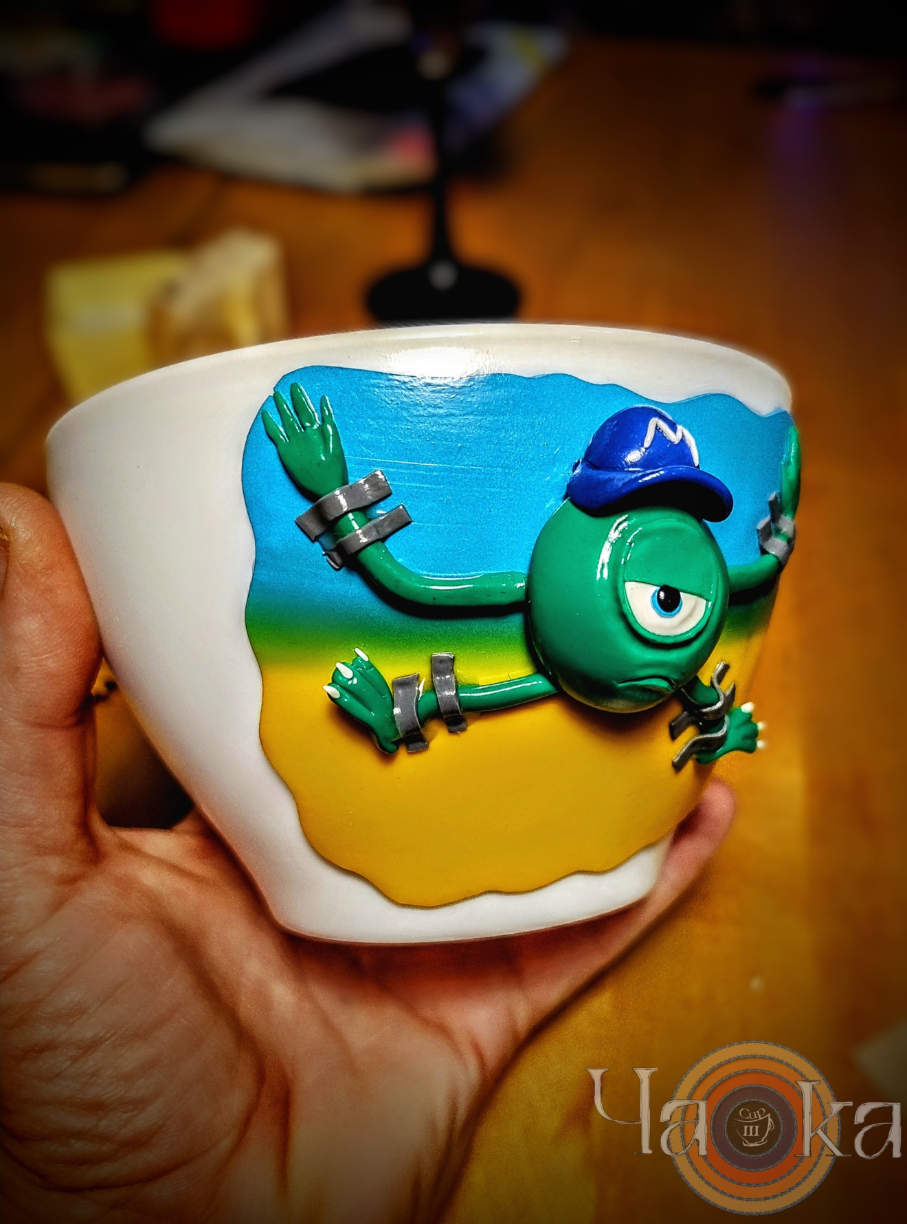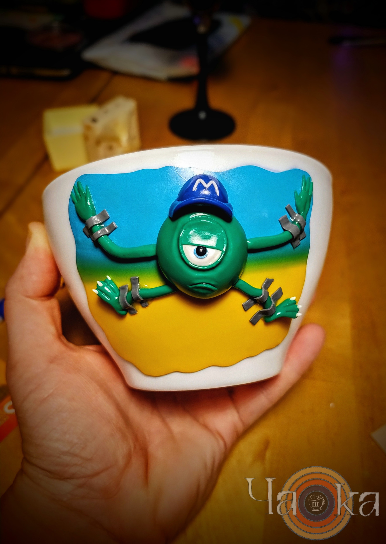 Представям ви една забавна купичка с анимационния герой Майк Вазовски, моделиран от полимерна глина.