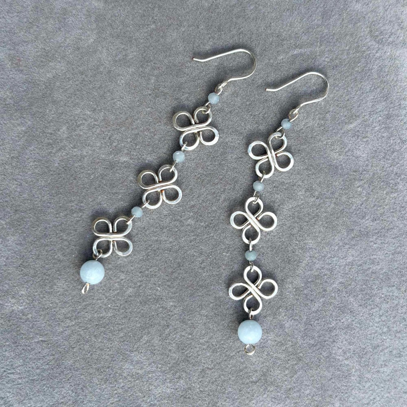 Ръчно изработени дълги флорални обеци с аквамарин. Всяка обеца е украсена с три нежни цветя, като всяко цвете е поставено с по три 3мм фасетирани аквамаринови камъка и завършва с един 6мм естествен камък аквамарин. Изработени от посребрена медна тел, те са леки и елегантни, идеални както за ежедневието, така и за специални поводи. Основни характеристики: Ръчно изработени обеци с три цветя Камъни естествен аквамарин - 6 мм и 3мм Лек и изискан дизайн, подходящ за всеки ден Посребрена медна тел Идеални за подарък или специален повод Тези обеци са перфектният избор за любителите на уникалното, натуралното и ръчно изработеното бижу. По желание могат да бъдат изработени изцяло от сребро или с други камъни.