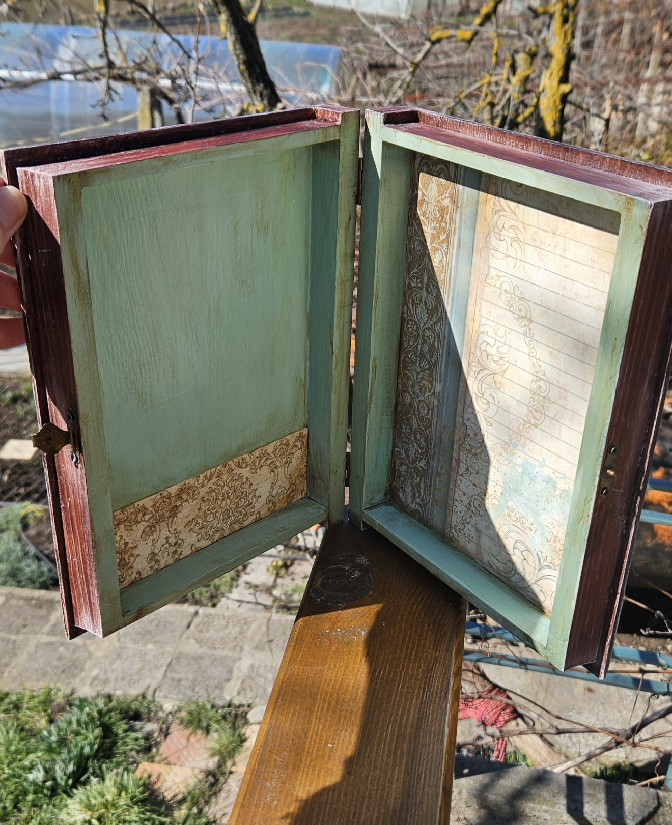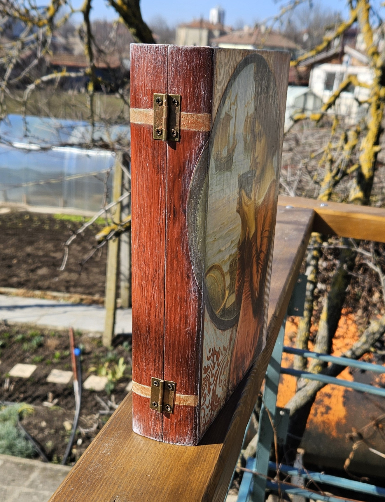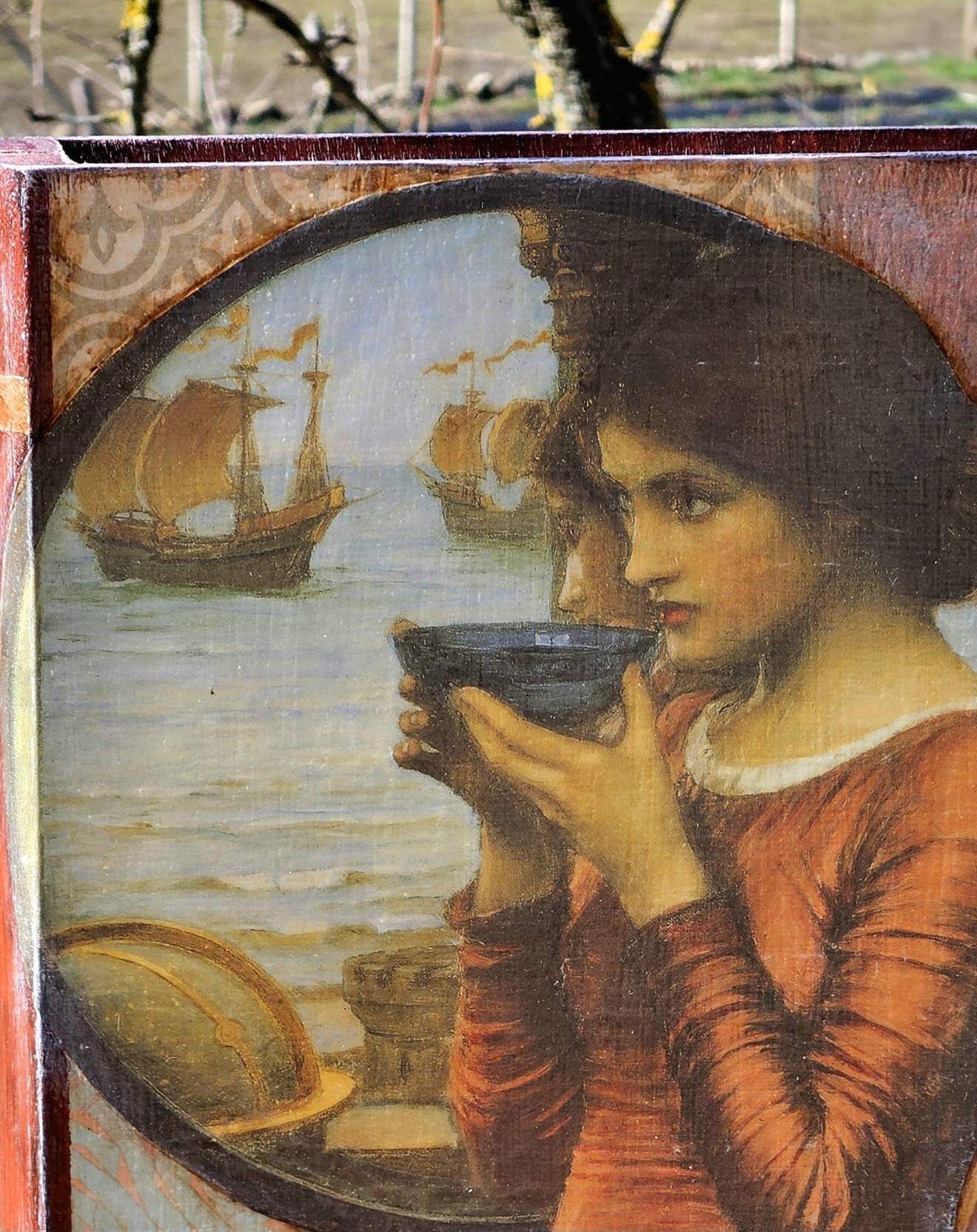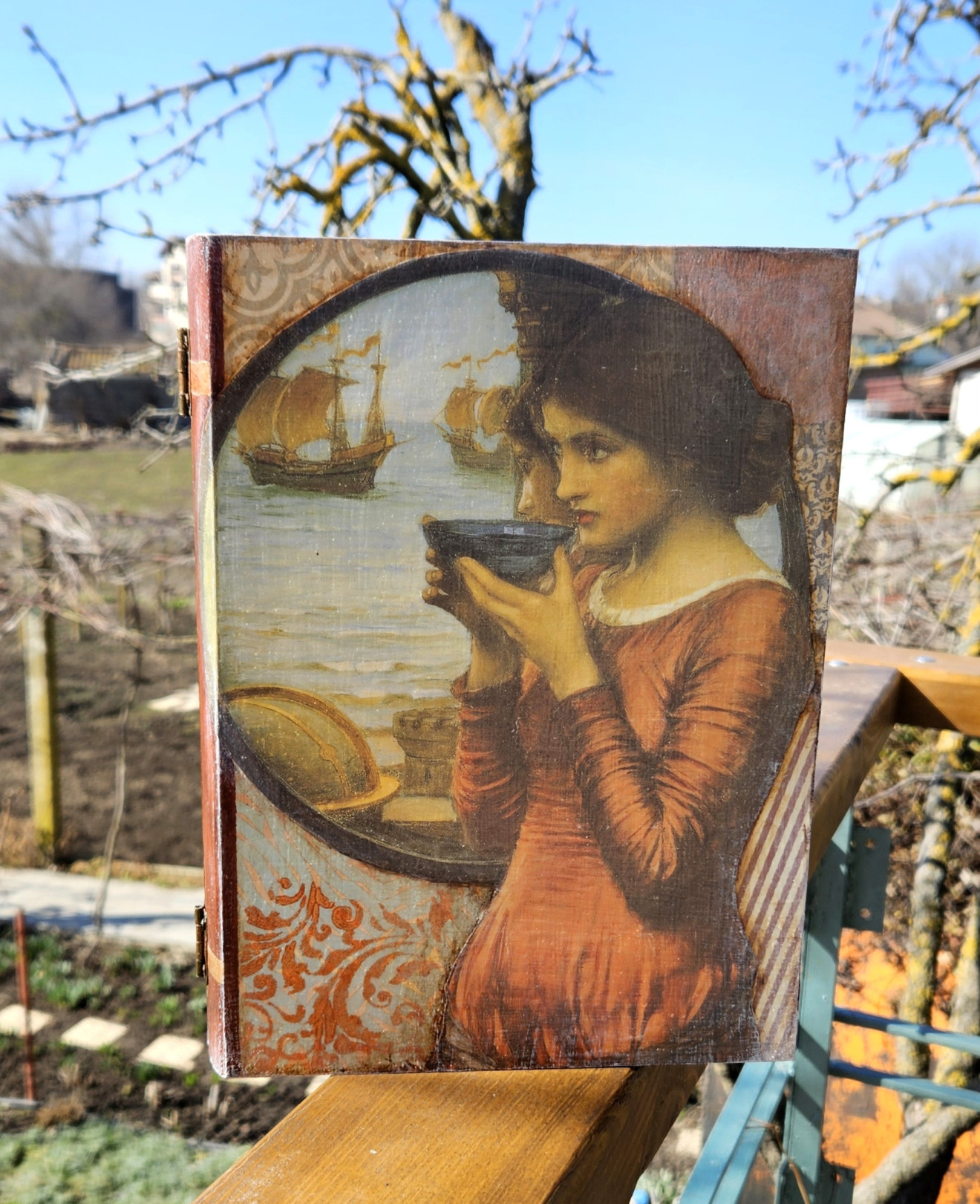 Дървена кутия за бижута, ключове, спомени... Корицата е по мотиви от картина на Джон Уотърхаус, от където е и наименованието. Използвах хартии, акрилни бои и лак на водна основа. Единствена бройка.