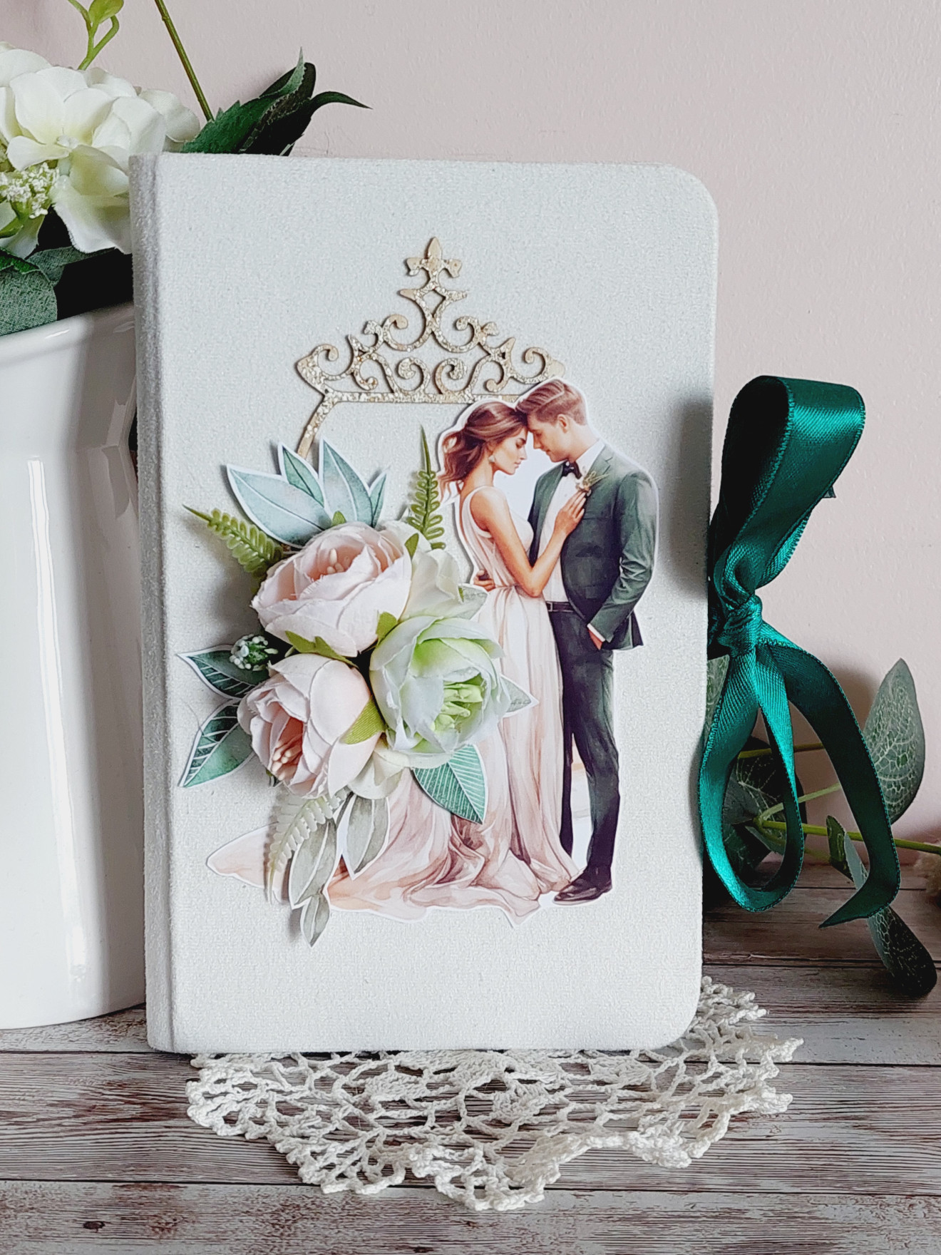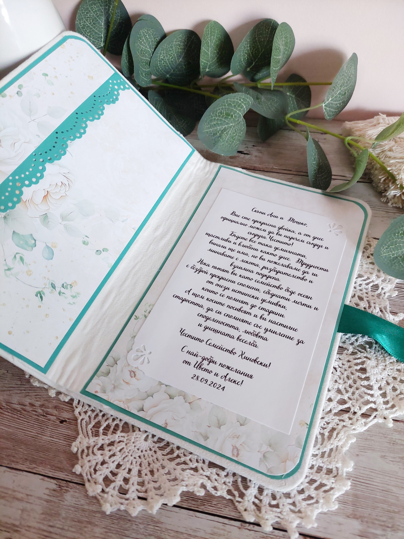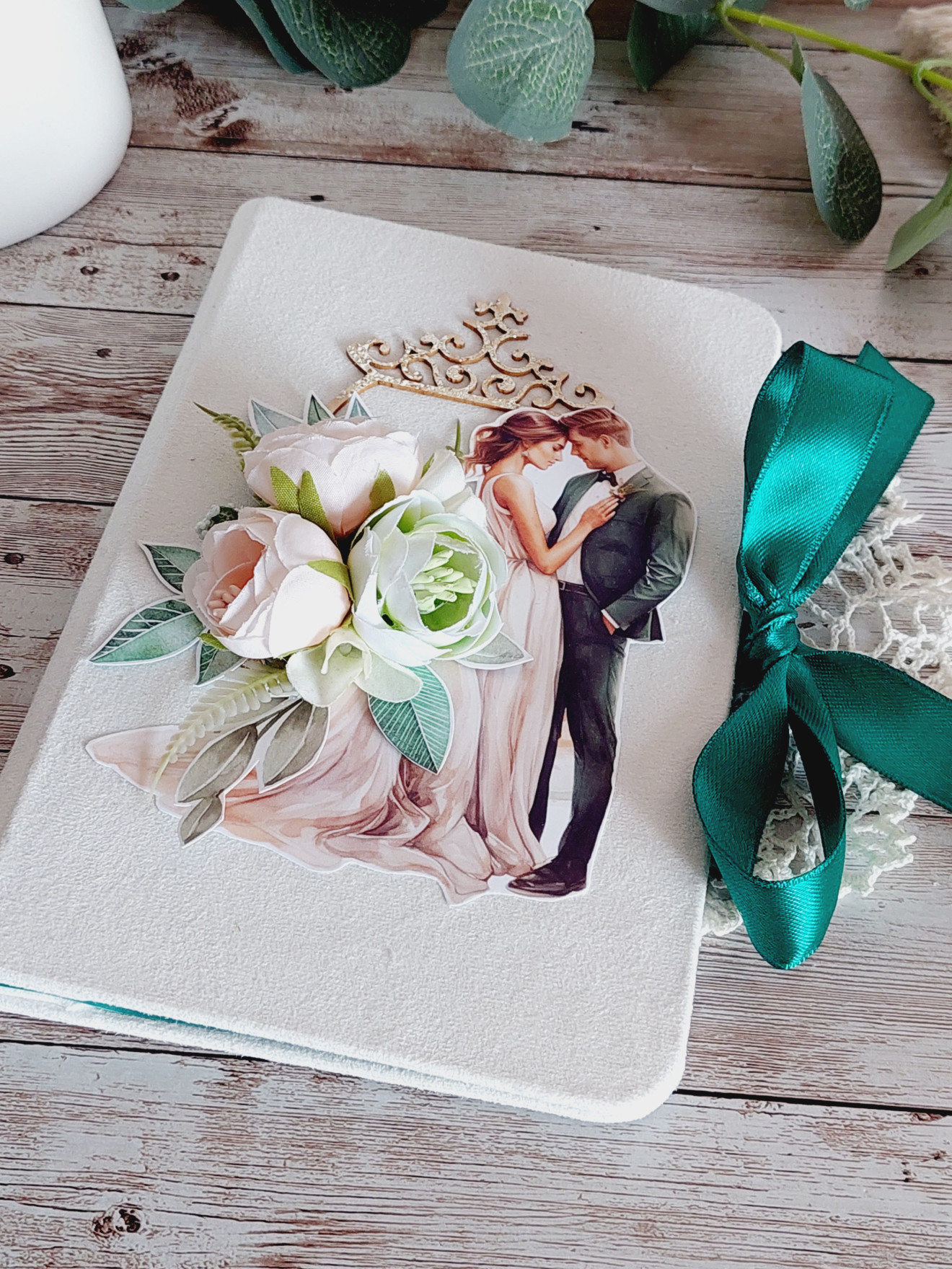 Луксозен сватбен плик за паричен подарък ? ? Корици, облечени във велурен плат ? Място за пожелание ? Джоб за пари Може да се изработи и в други цветове и да бъде съобразен с темата на празника!