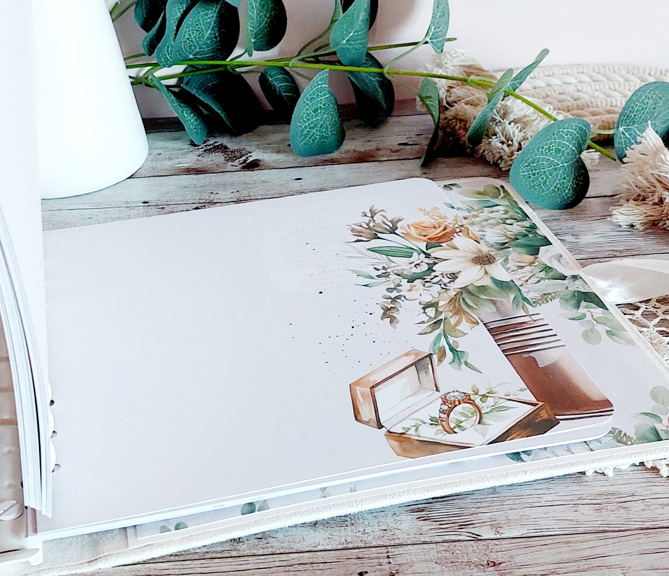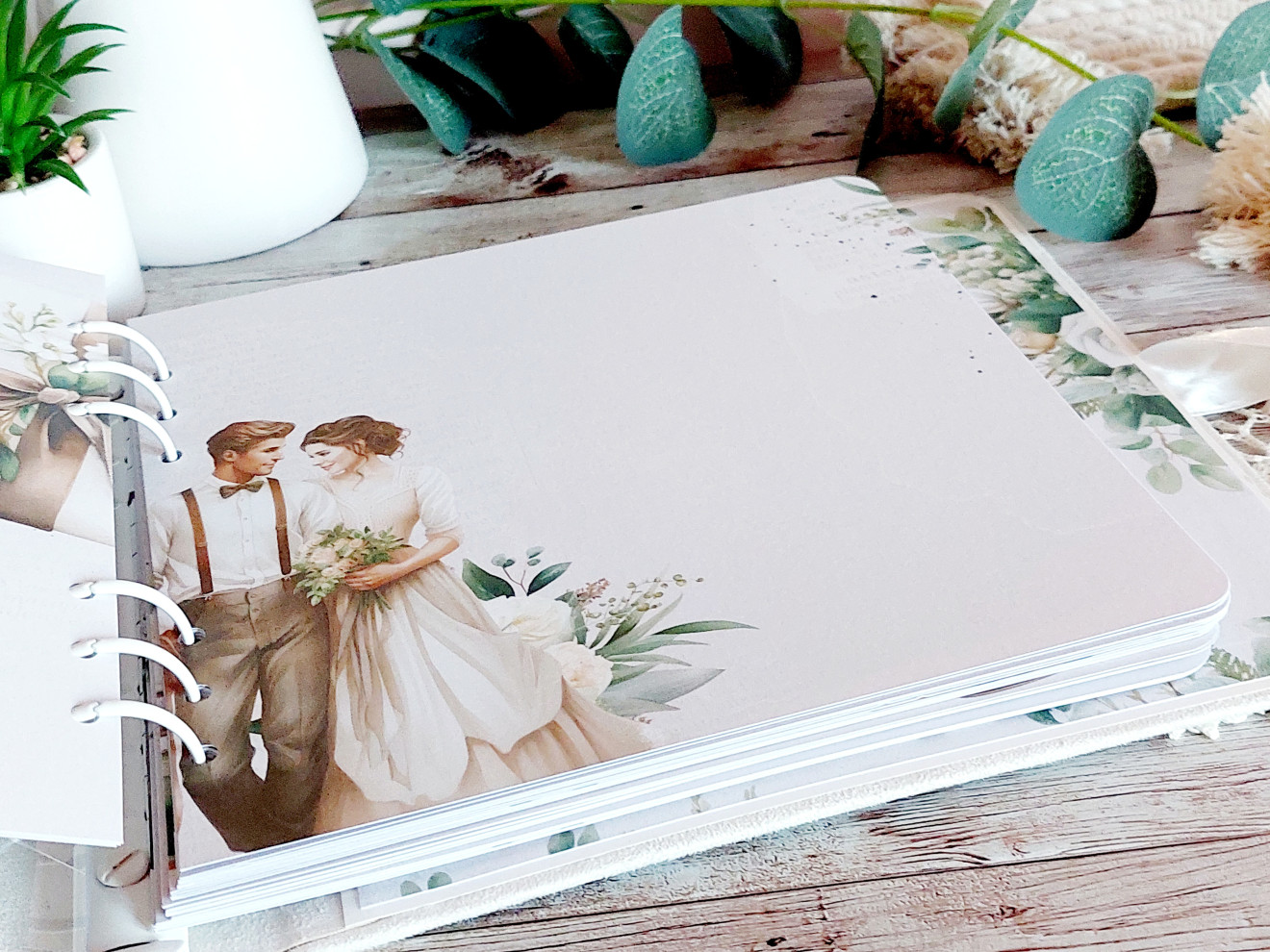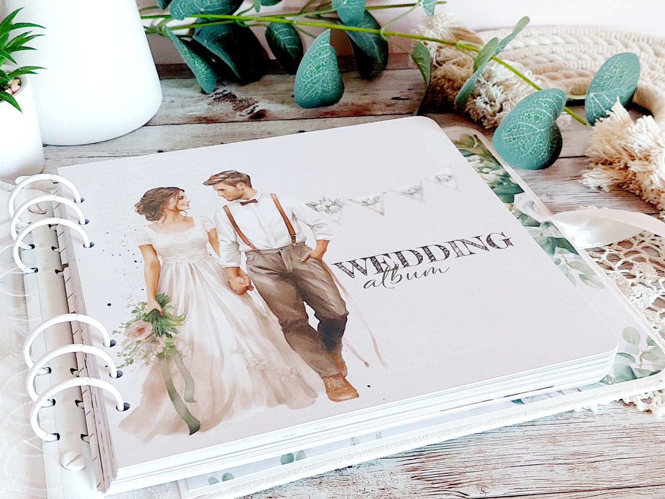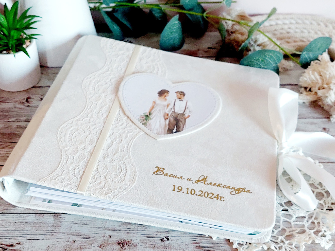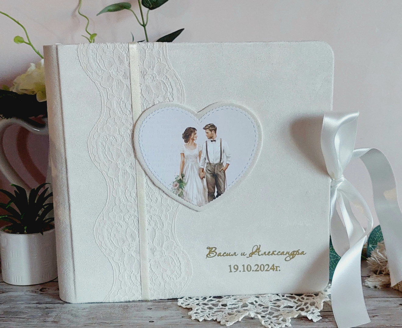 Сватбен албум... ? Облечен в нежен велурен плат ? С ринг механизъм ? 60 страници ? Може да съхрани около 60-120 снимки с размер 9х13 и/или 10х15см ? Размер на албума 23х22см Албумът може да се комбинира с плик за паричен подарък. Поръчки се изпълняват само при предварително преведено капаро 50%