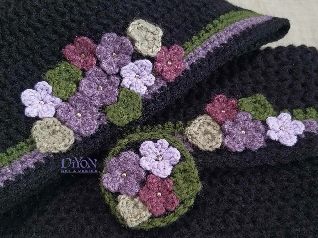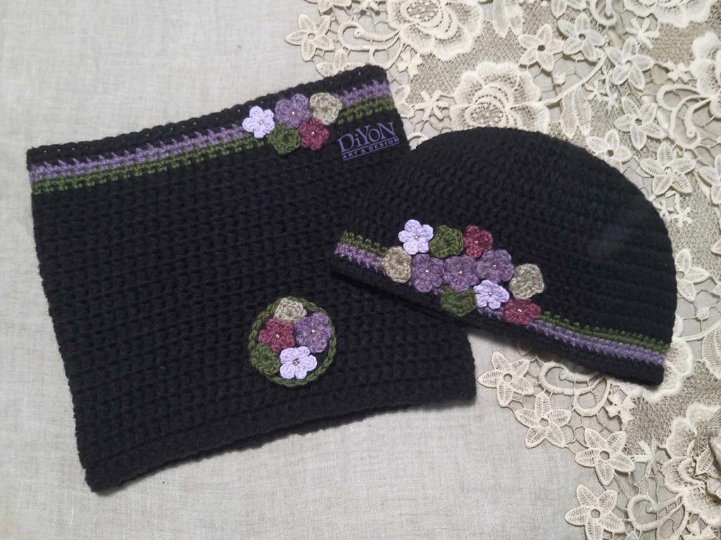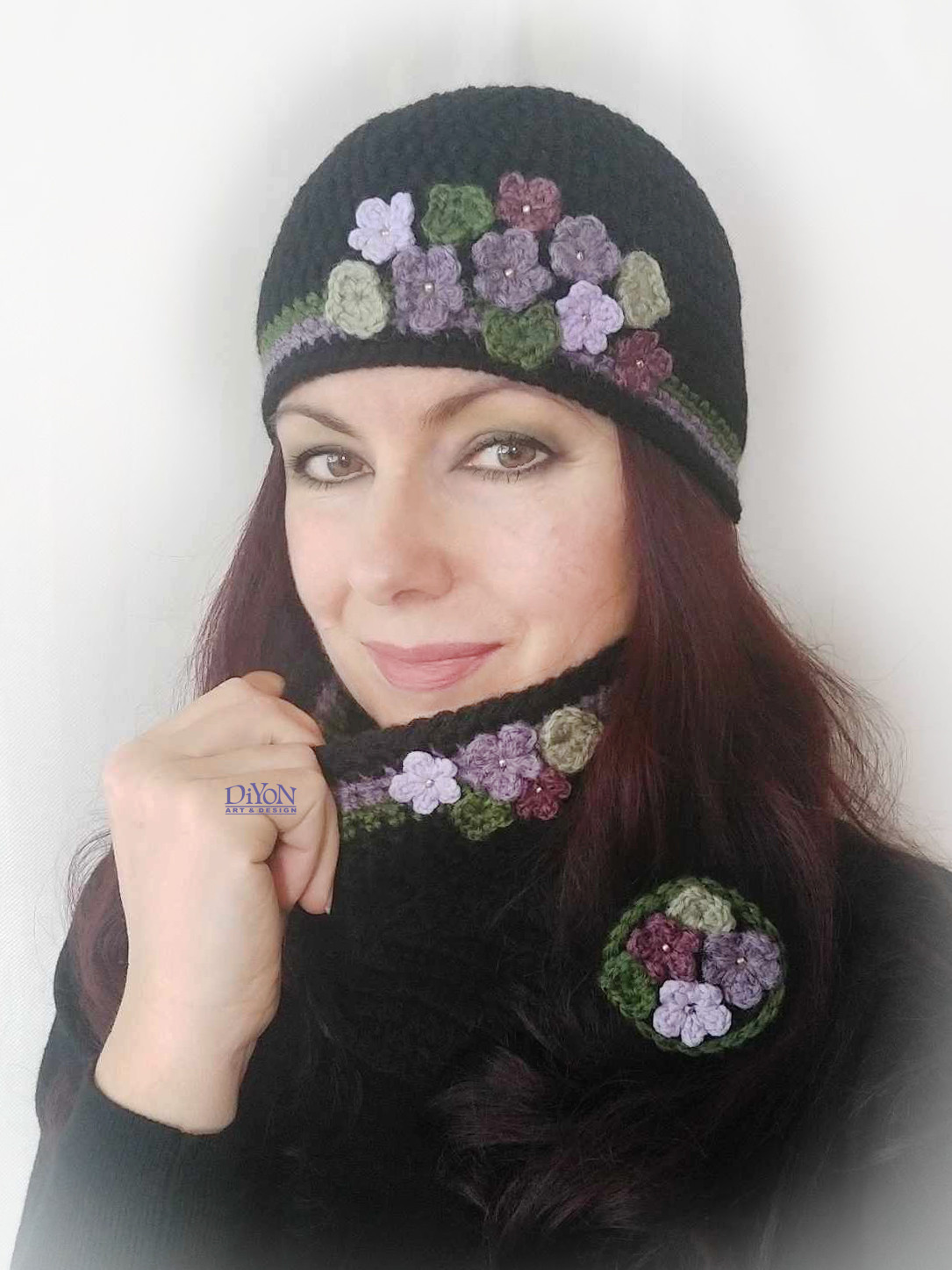 Романтичен ръчно плетен комплект от вълна и акрил в черно, с много богата декорация от теменужки в различни лилави нюанси. Класическа шапка по главата, шал - яка и брошка, която може да се носи и като шнола. Възможност аксесоарите от комплекта да се поръчват и поотделно, а също и с ръкавици.