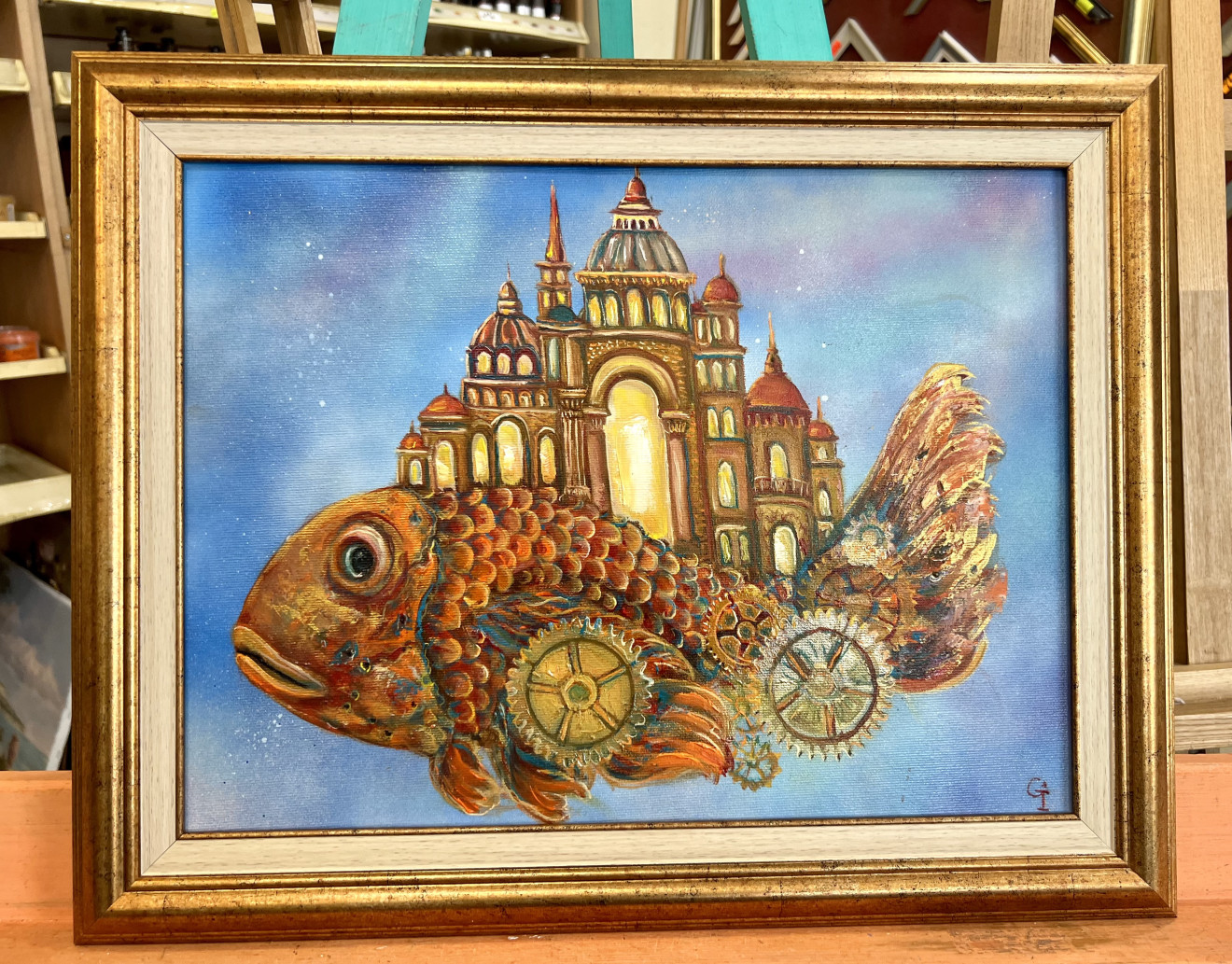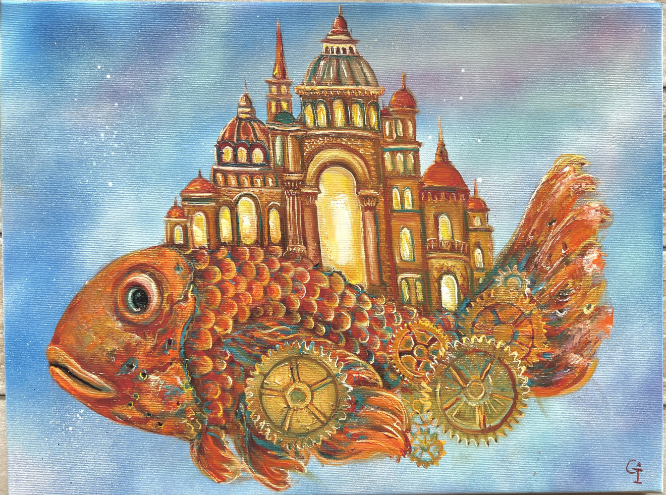 Акрилни и маслени бои. Чрез текстурирани слоеве боя steampunk техниката създава усещане за старинност. Същество от фантастичен свят – нещо антично, но все още функциониращо и устойчиво, скитник носещ своята история през времето и пространството.