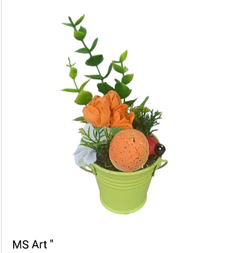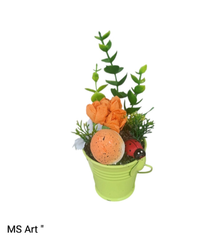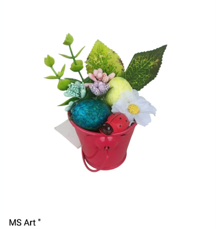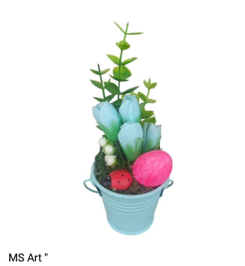 #Мини #декоративни #кашпи с #цветя " Малки #декоративни #пролетни #сувенири в #метални #кашпи, #ръчно #декорирани с #изкуствени #цветя, #зеленина, #яйца от стиропор, #камъчета, #калинки и други елементи, единични бройки на цена от 7 лв за брой.