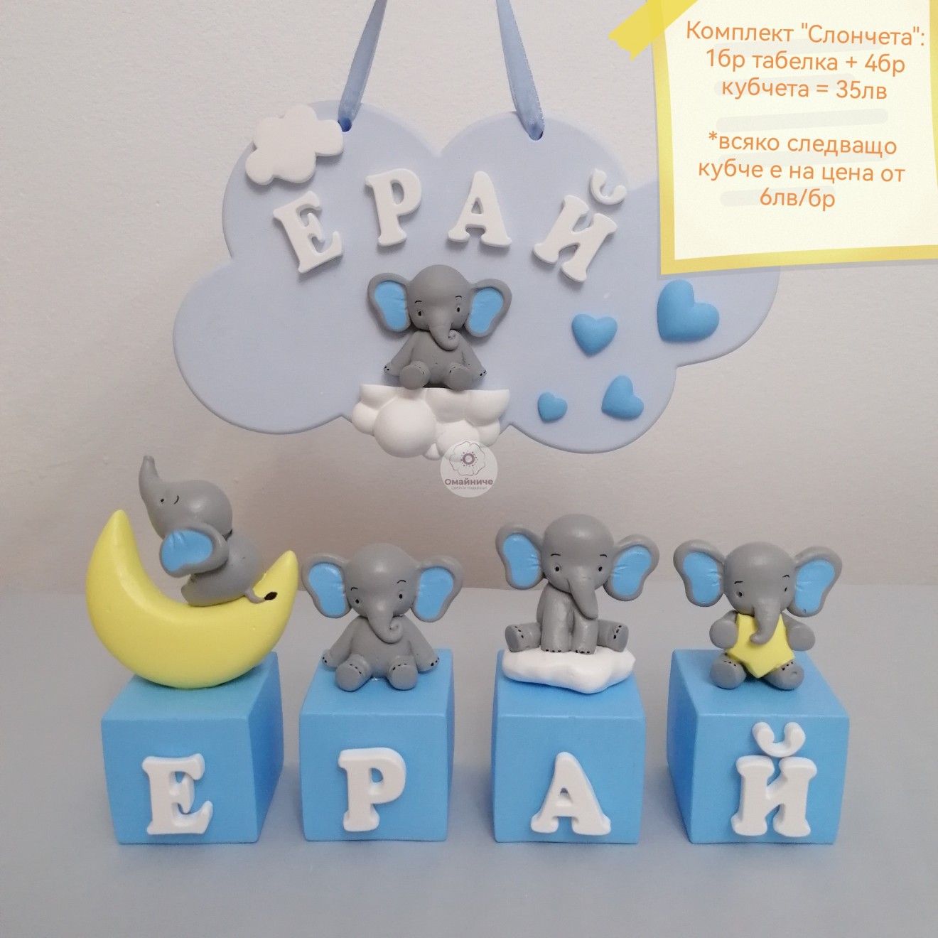 Подаръчен комплект "Слончета" включва: 4бр кубчета 1бр табелка Изработват се в цветове по Ваш избор. При добавяне на допълнителни декорации, надписи, рождени данни, кубчета, осветление, се калкулират като добавка към промо цената на съответния комплект.