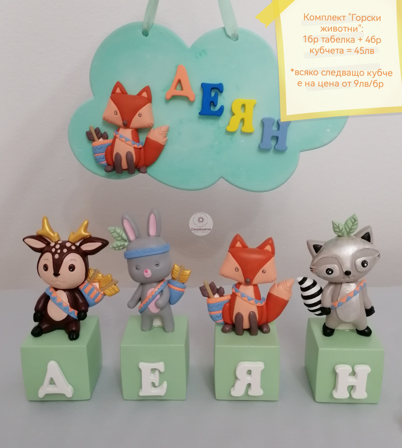 Подаръчен комплект "Горски животни" включва: 1бр табелка 4бр кубчета Изработват се в цветове по Ваш избор. Всяко следващо кубче е на цена от 9лв/бр. При добавяне на допълнителни декорации, надписи, рождени данни, кубчета, осветление, се калкулират като добавка към промо цената на съответния комплект.