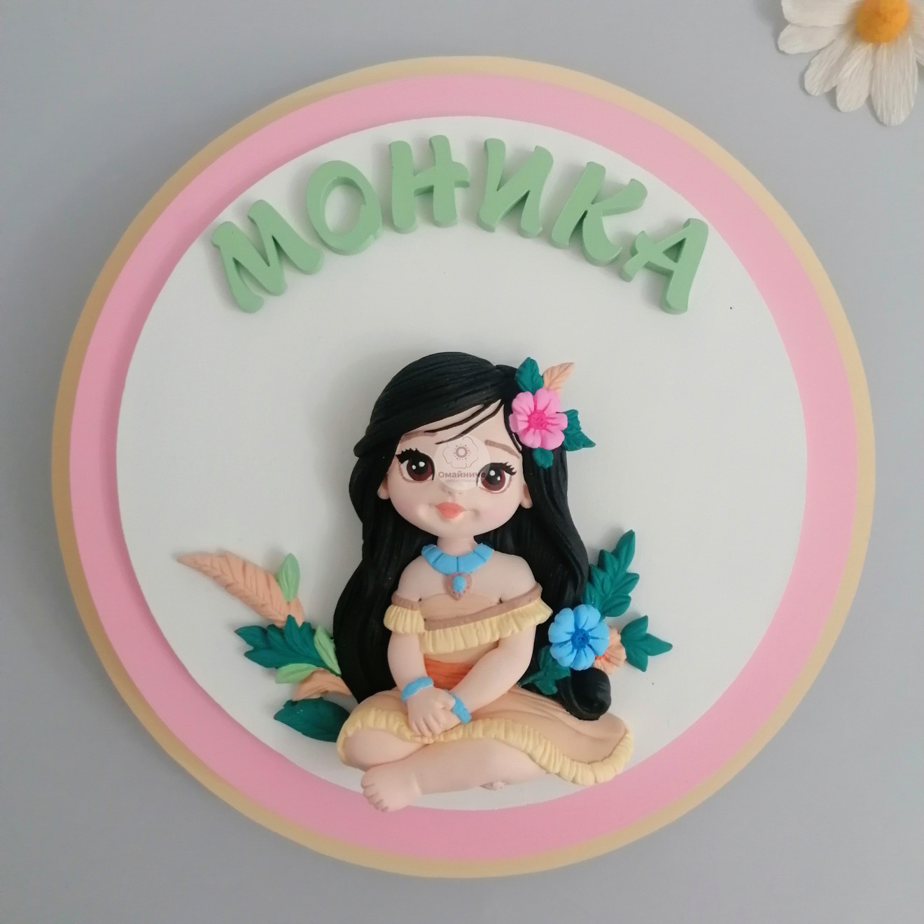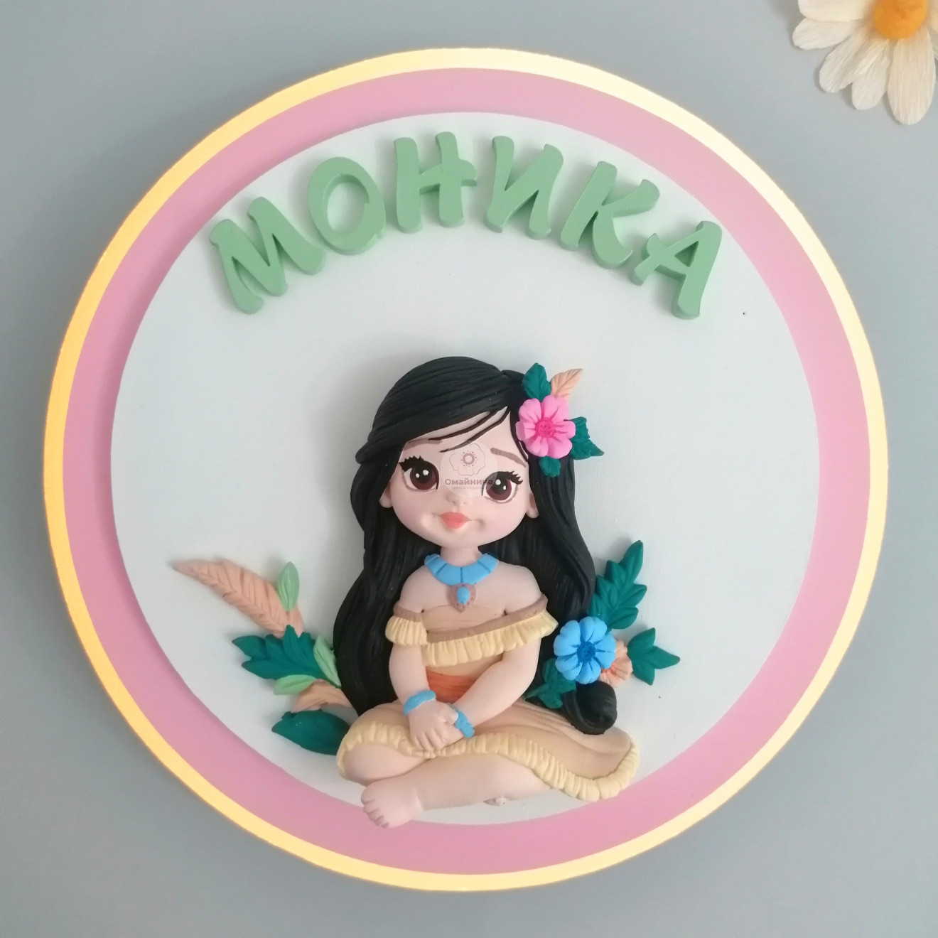 Нощна лампа за детска стая с 3D ефект. Изработена от МДФ основа, с диаметър 25см (външен кръг) и гипсокерамични елементи. Свети с бяла LED светлина, на батерии (включени), с вградена закачалка. Изработва се в цветове по Ваш избор.