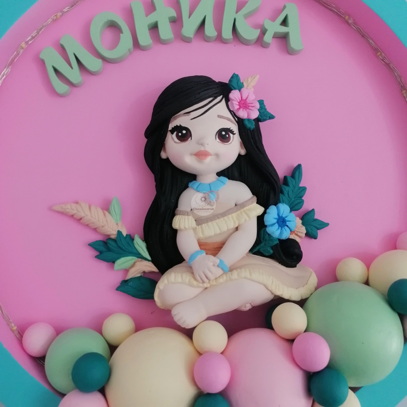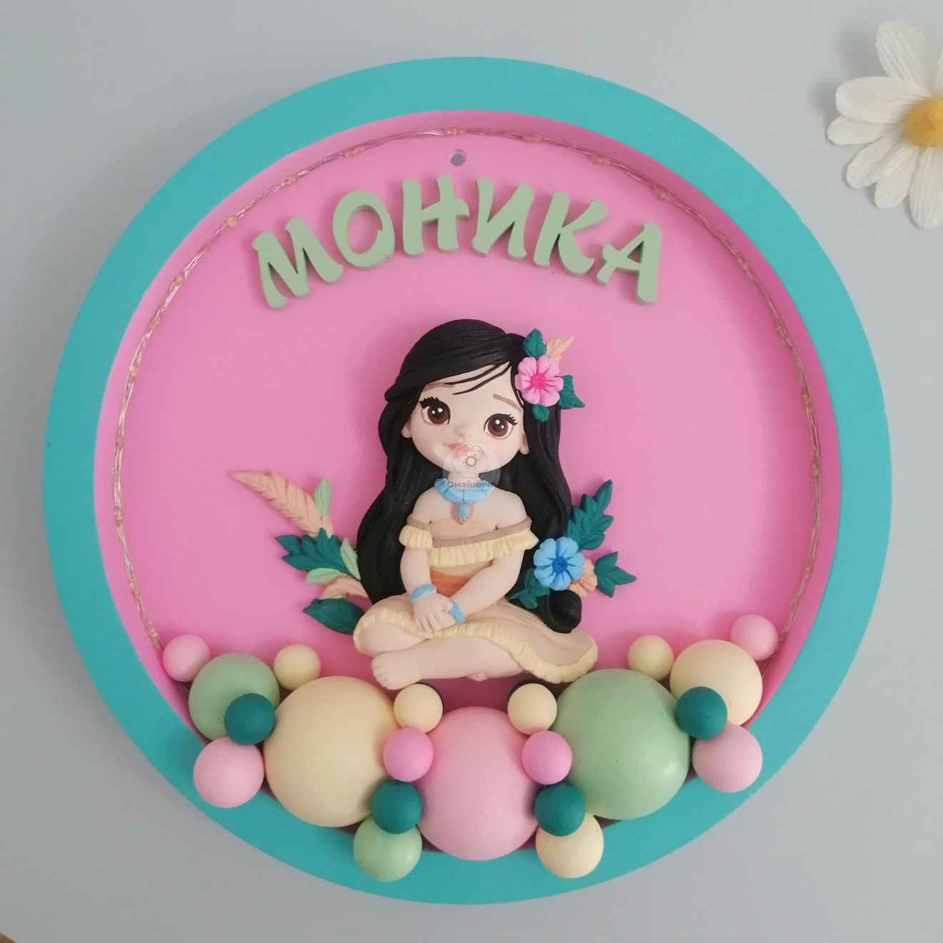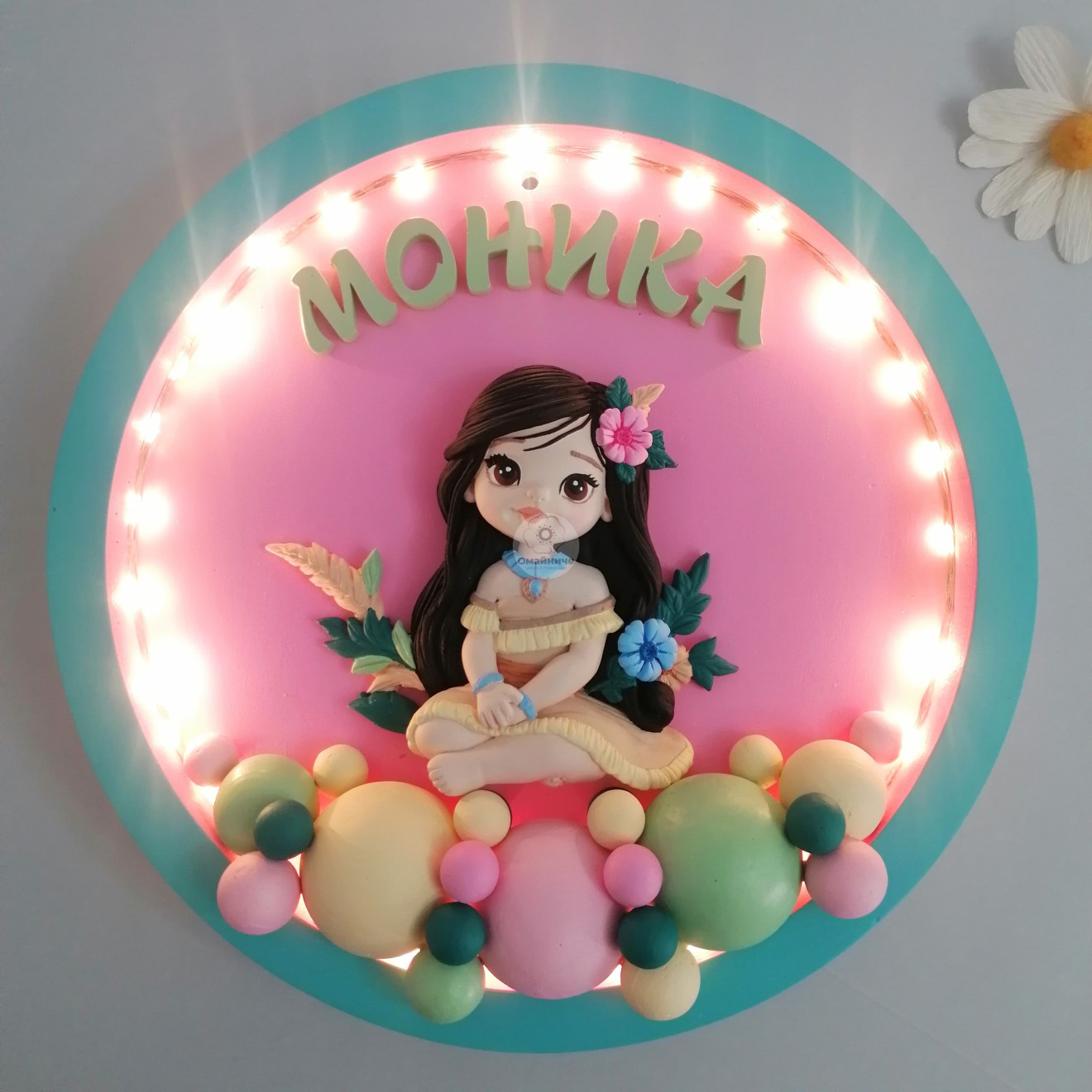 ?Нощна лампа за детска стая с МОАНА. ?Гипсокерамична основа, с диаметър 25см. ?Гипсокерамични елементи, оцветени по Ваш избор с акрилни бои. ?Свети с бяла LED светлина, на батерии (включени). ?Открито осветление, което е подходящо дори за четене на приказка за лека нощ.