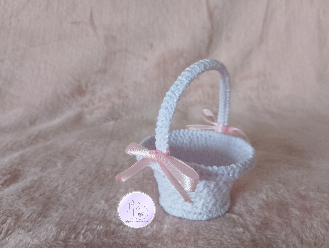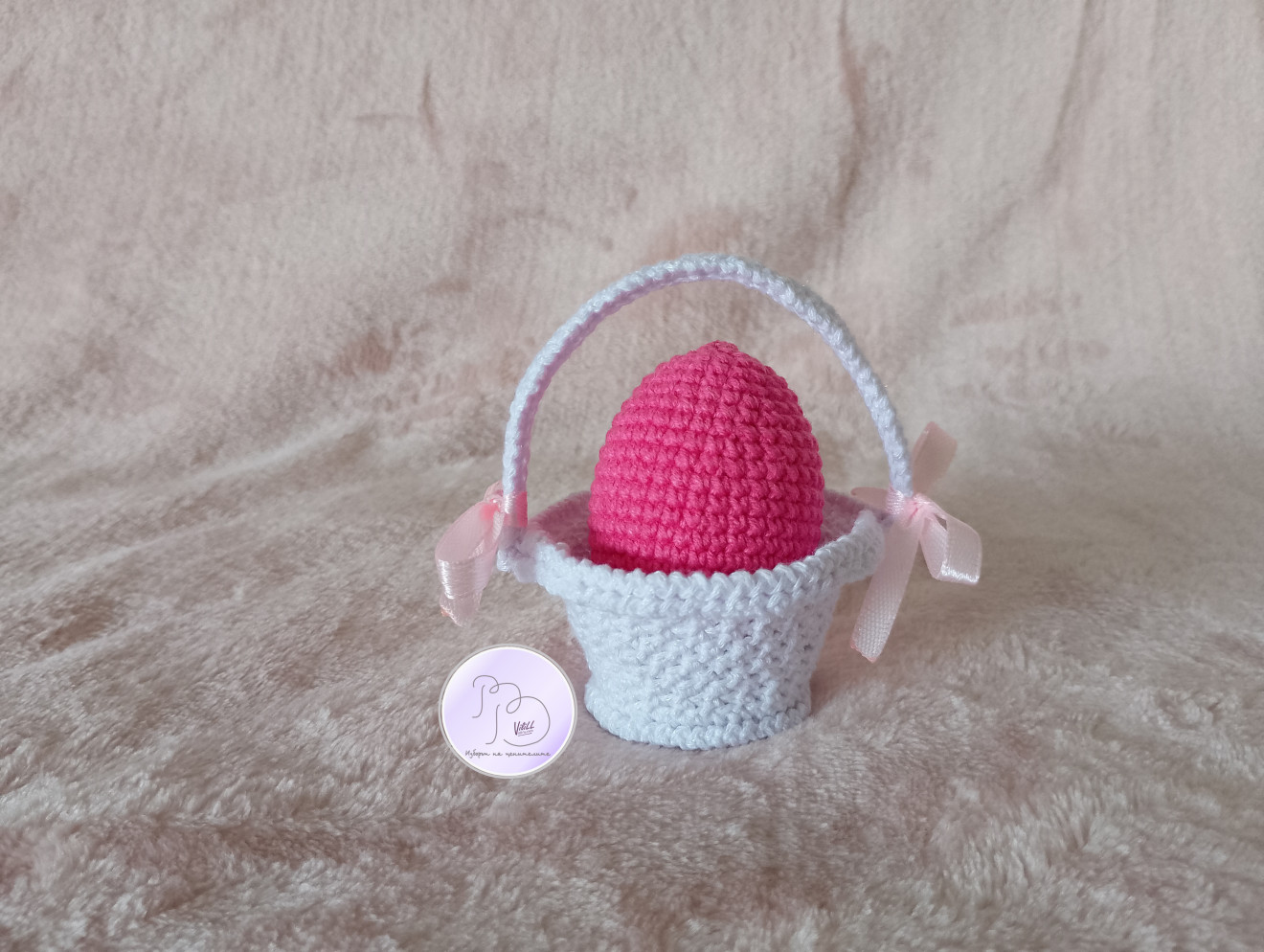 Декоративна кошничка, подходяща за различни поводи- Великден, подарък, сватба/ брачни халки или според Вашите цели. Приблизителни размери: -диаметър на дъното- около 4.5см. -диаметър в горната част- около 7 см. -височина на тялото- около 3 см. -височина с дръжката- около 9 см. Материал: 1.кошничка: -прежда- 90% Памук, 10% Полиамид. -сатенена панделка. 2.яйце: – прежда- смес от акрил и памук. -силиконов пълнеж. Може да се изработят и в други цветове и размери според желанието на потребителя. Цена: 1.комплект кошничка+ яйце:12.00лв. 2.по отделно: -кошничка:10.00лв./1 брой. -яйце: 4.50лв./1 брой. Доставка до офис на Еконт за сметка на получател или чрез лично предаване в границите на моя град.