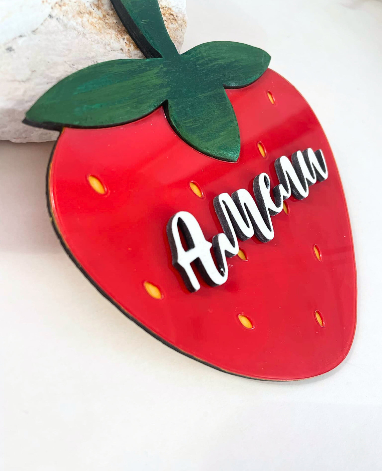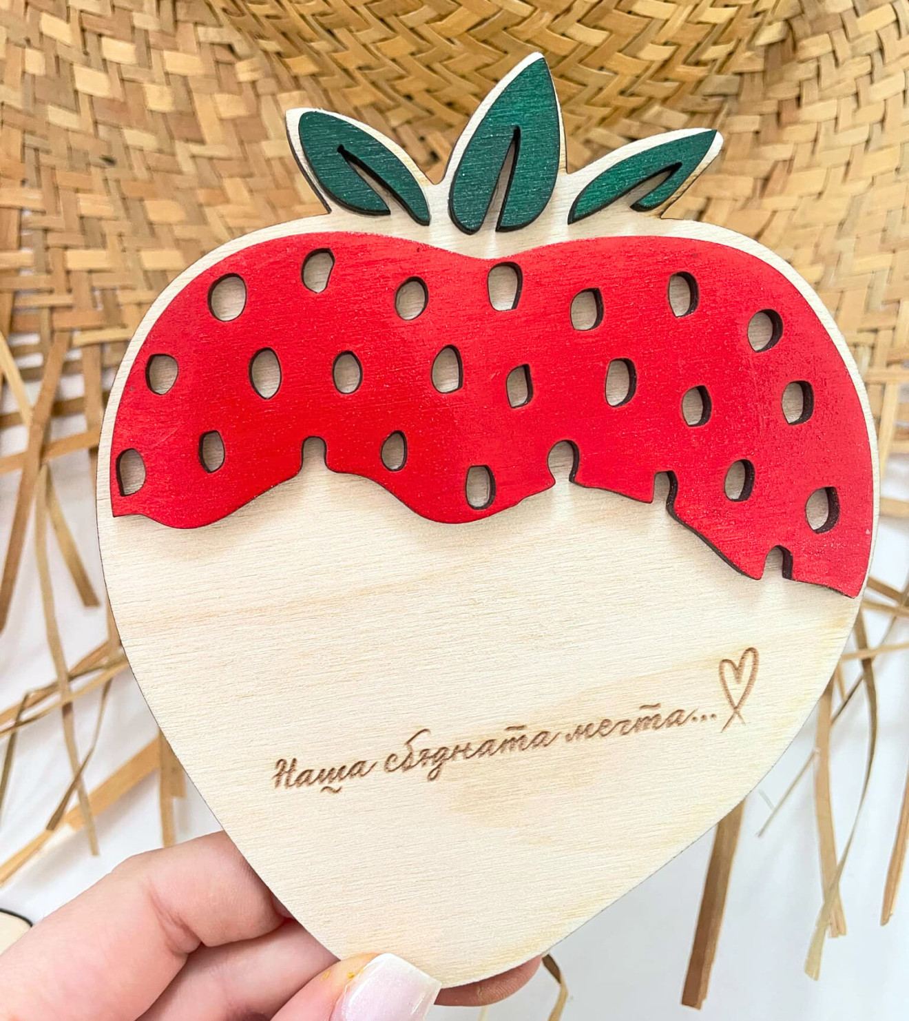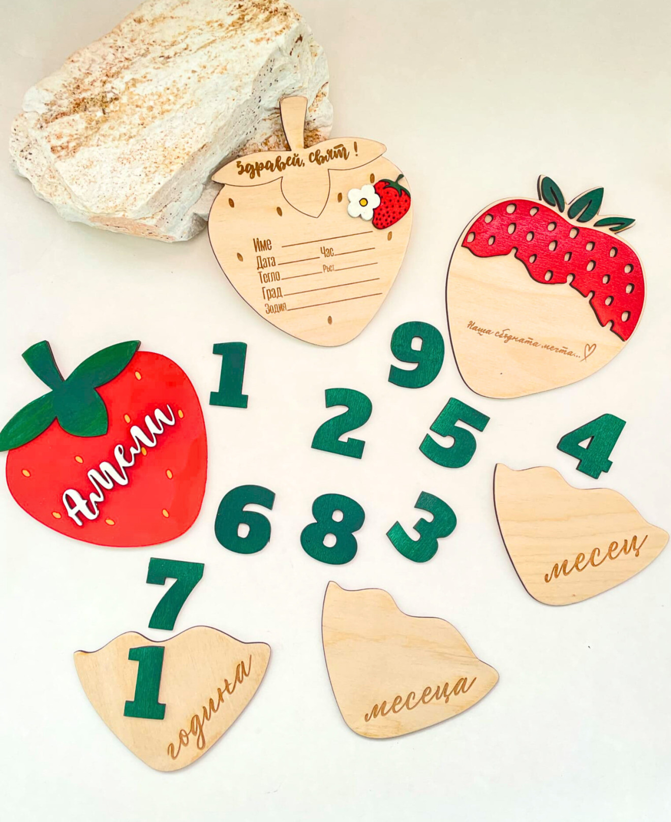 Месечинки за бебе „Ягода“ – идеален начин да запазите спомена за първата година от живота на вашето дете. Също така, те са чудесен начин да следите развитието на бебето си и да видите колко бързо расте и се развива. Комплект месечинки „Ягода“ Съдържа: 3 бр. дървени карти ръчно изработени – ягоди, от които 1 бр. карта/визитка ягода „Здравей, свят!“ – с място за попълване на данни 14/12 см. 1бр. ягода със скрит текст „Наша сбъдната мечта…“14,5/12 см. (при желание на ваш текст, моля напишете в полето за персонализация) 1 бр. ягода с име , също така и 3 бр. сменящи се думи – „месец“ , „месеца“ , „година“ – около 11/7,5 см. от 1 месец до 1 година числа във зелен цвят – около 3, 4 см. Изработка: 3-5 раб дни.