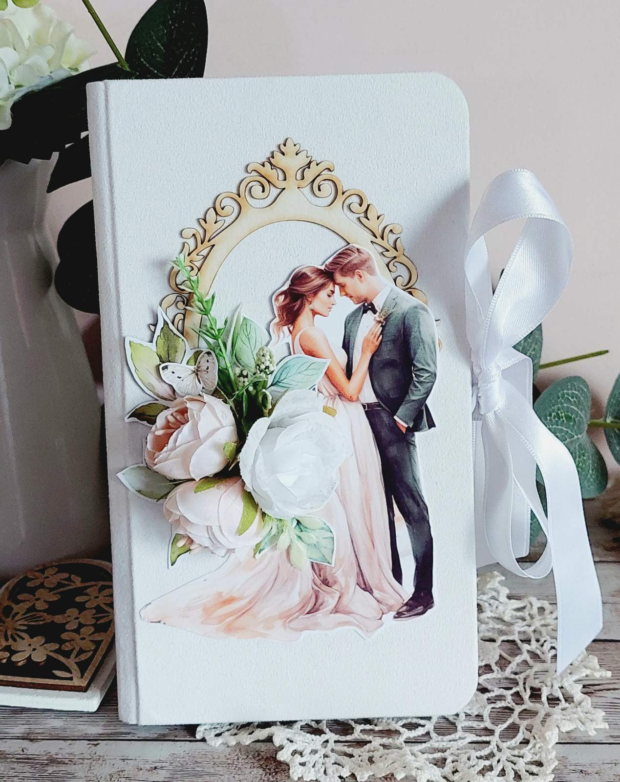 Луксозна сватбена картичка ? ? Корици, облечени във велурен плат ? Място за пожелание ? Джоб за пари Може да се изработи и в други цветове и да бъде съобразен с темата на празника!