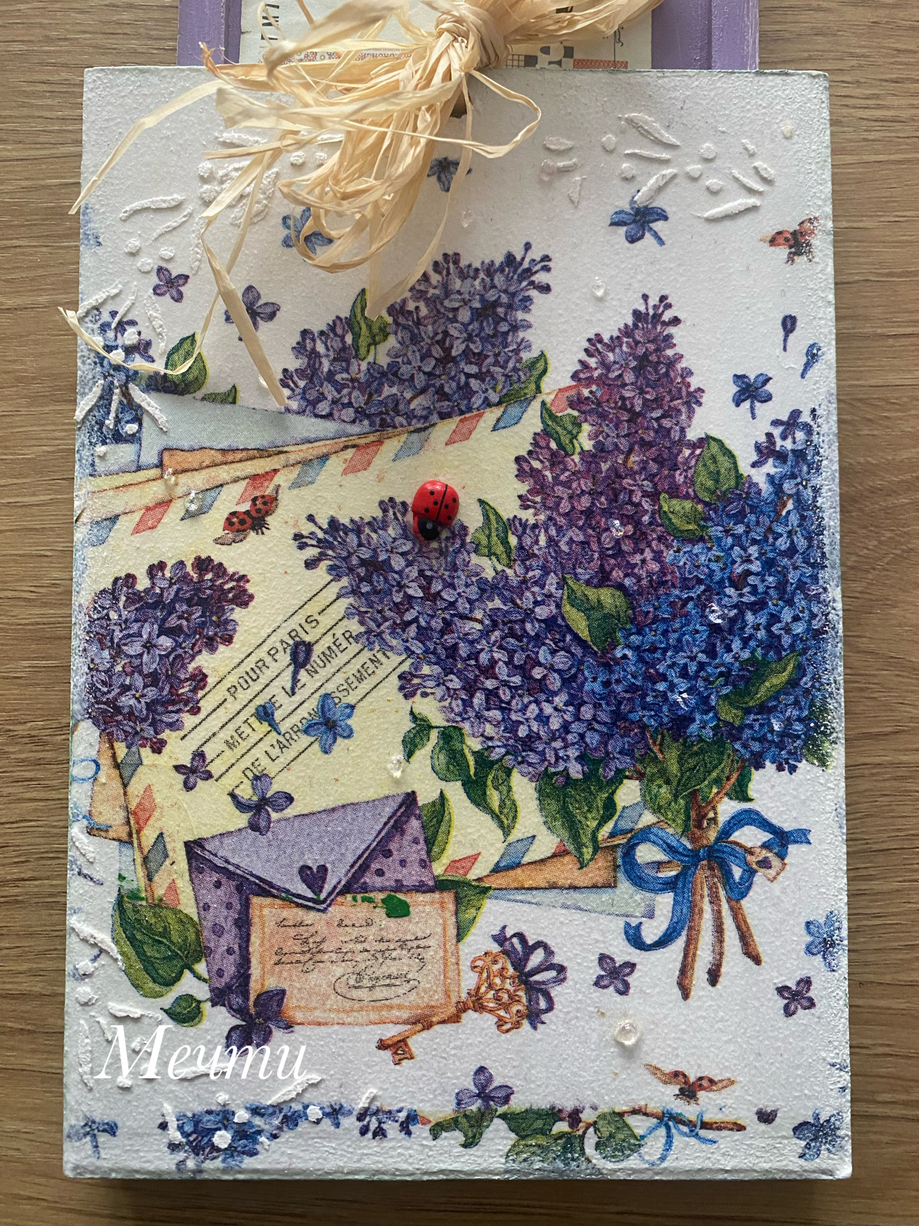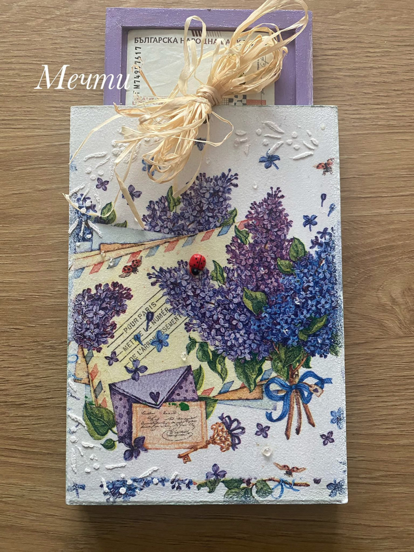 Плик от МДФ, декориран с декупаж, шаблони, структурна паста, капки дъжд, рафия. Размери;19см./13см. #handmade #ръчнаизработка #пролет #люляк #картичка