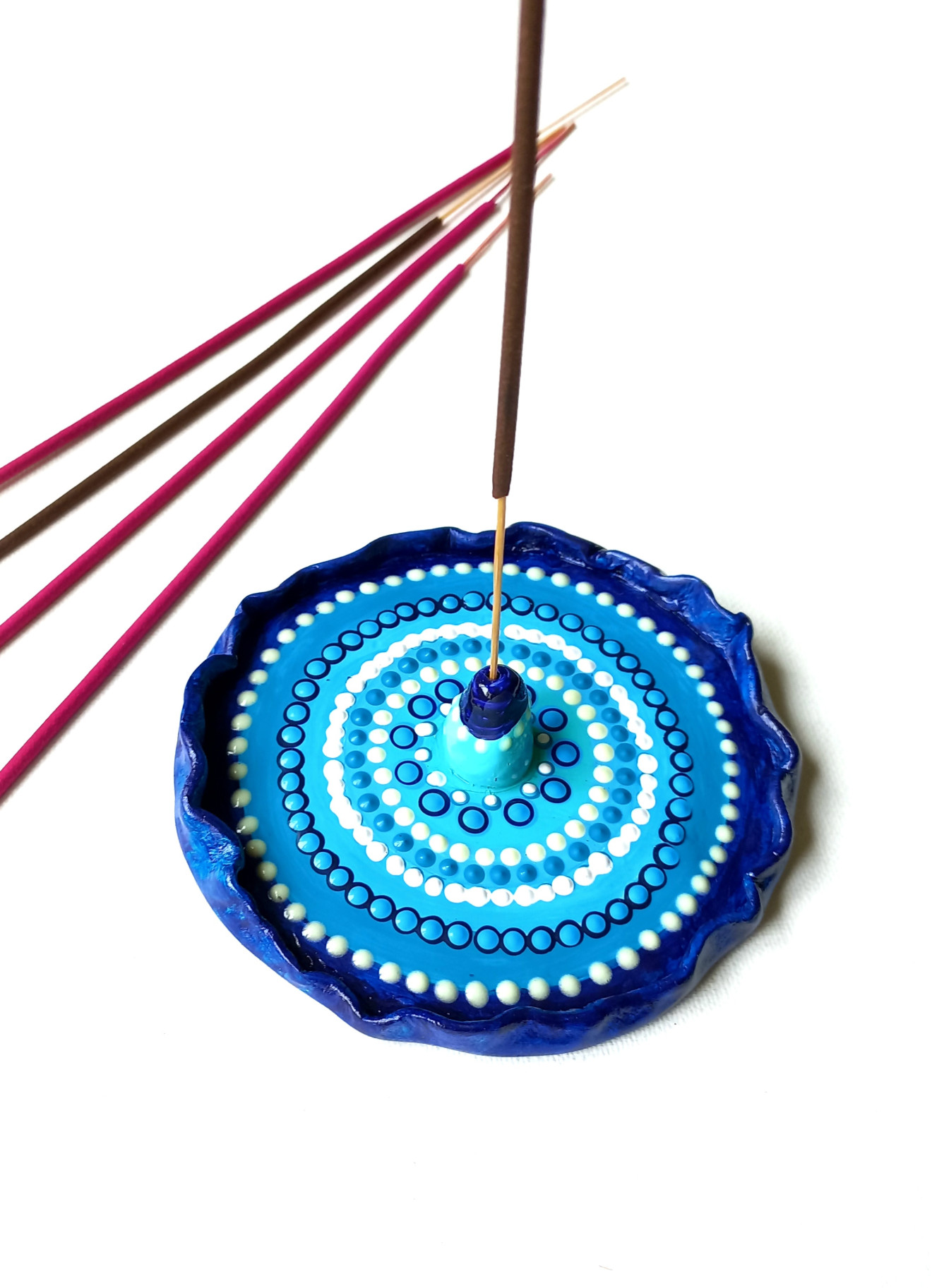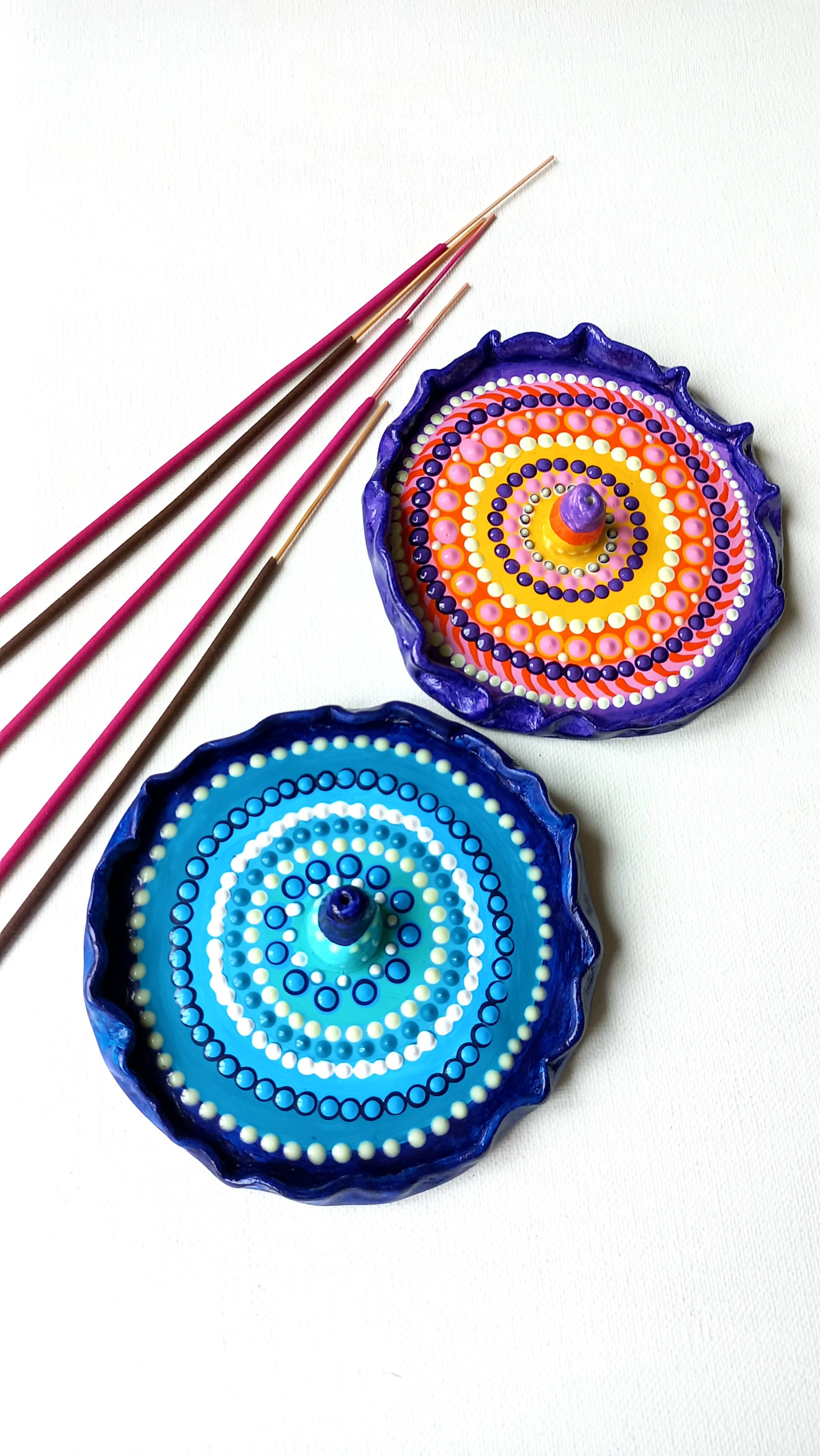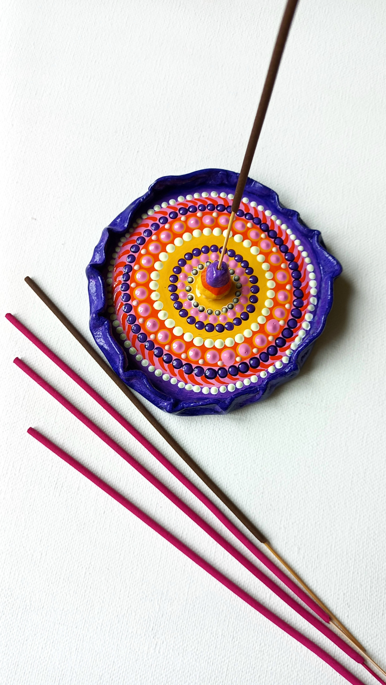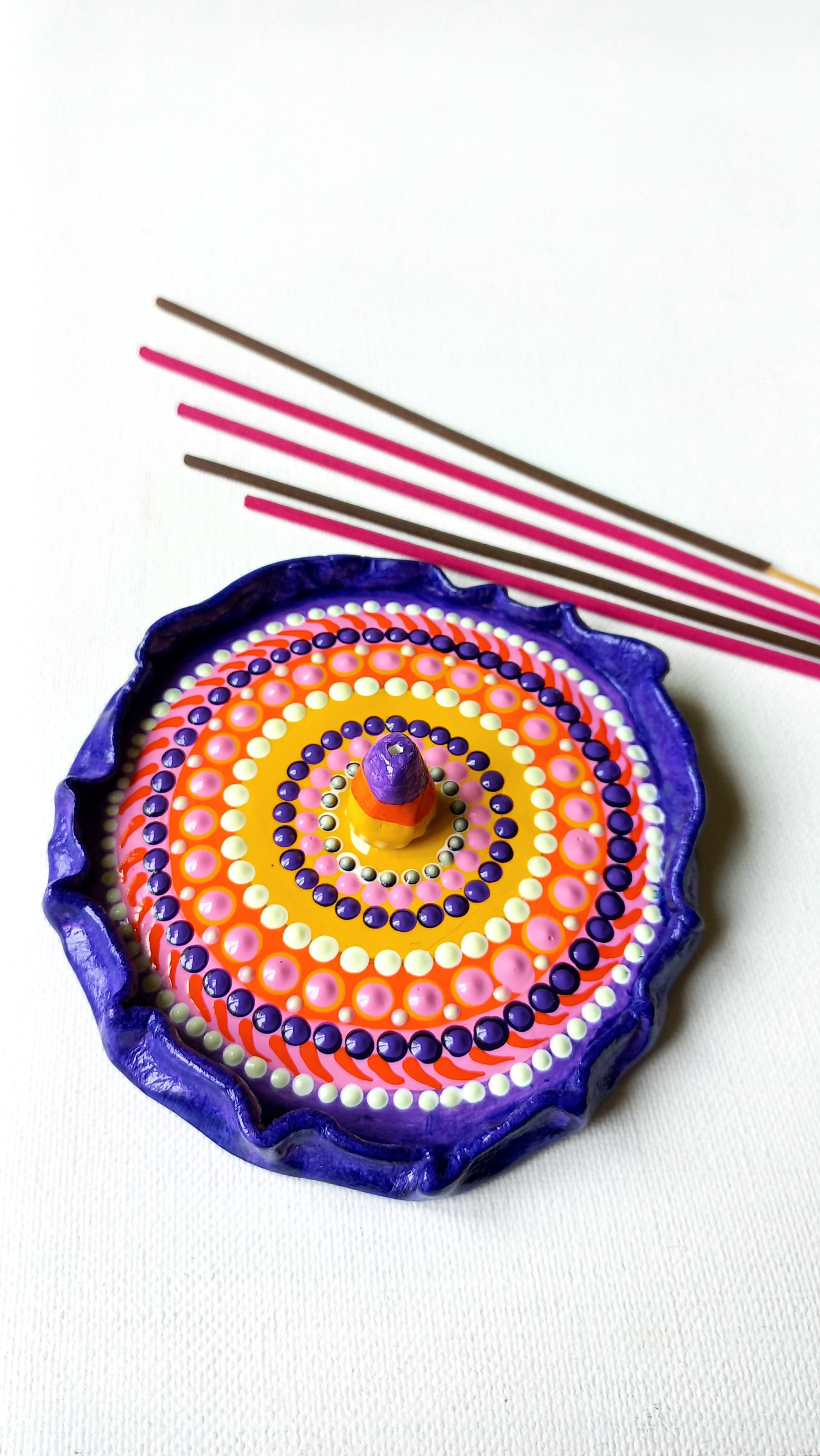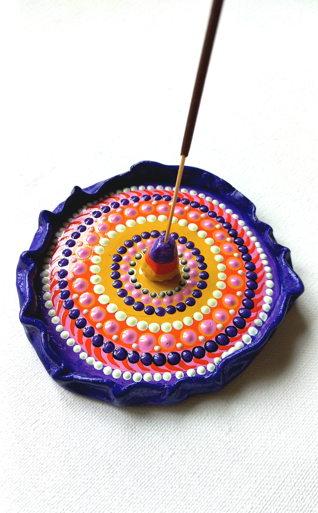 Представяме ви уникална ръчно изработена поставка за индийски пръчици с мандала, която не само краси, но и носи дълбок символизъм. Диаметър около 13 см. Тази великолепна творба е изработена изцяло ръчно от глина и е проектирана да свети в тъмното, придавайки на вашето пространство уникална и успокояваща атмосфера. Ръчно рисуваната мандала, която украсява поставката, е вдъхновена от древни традиции и е символ на хармония и баланс. Цветовете, използвани в мандалата, имат специално значение: Бяло – символ на чистота и ново начало. Оранжево – носи енергия и радост, стимулира креативността. Жълто – символизира щастие и оптимизъм, вдъхва увереност. Екрю – свързано със спокойствието и стабилността, създава уютна атмосфера. Лилаво – олицетворява духовност и интуиция, насърчава вътрешния мир. Индиго – символ на дълбочина и мъдрост, подобрява концентрацията. Розово – носи любов и нежност, добавя топлина и романтика. ?Синьо – представлява спокойствие и мир, вдъхновяващо за медитация. Тюркоазено – цветът на хармонията и баланса, който носи позитивна енергия. Тъмно-синьо – символ на дълбочината и мъдростта, насърчаваща вътрешния мир. Светло синьо – цвят на вдъхновение и творчество, носещ лекота и радост. Екрю – топъл неутрален цвят, който създава уют и комфорт. Тази поставка не е просто функционален предмет, а и израз на вашата индивидуалност и стил. Подходяща е както за лична употреба, така и като изискан подарък за близки и приятели. Присъединете се към нас в пътешествието на създаване на уют и хармония в дома си с нашата уникална ръчно изработена поставка с мандала! За поръчки, пишете ми лично?