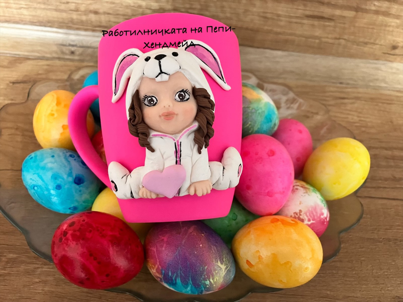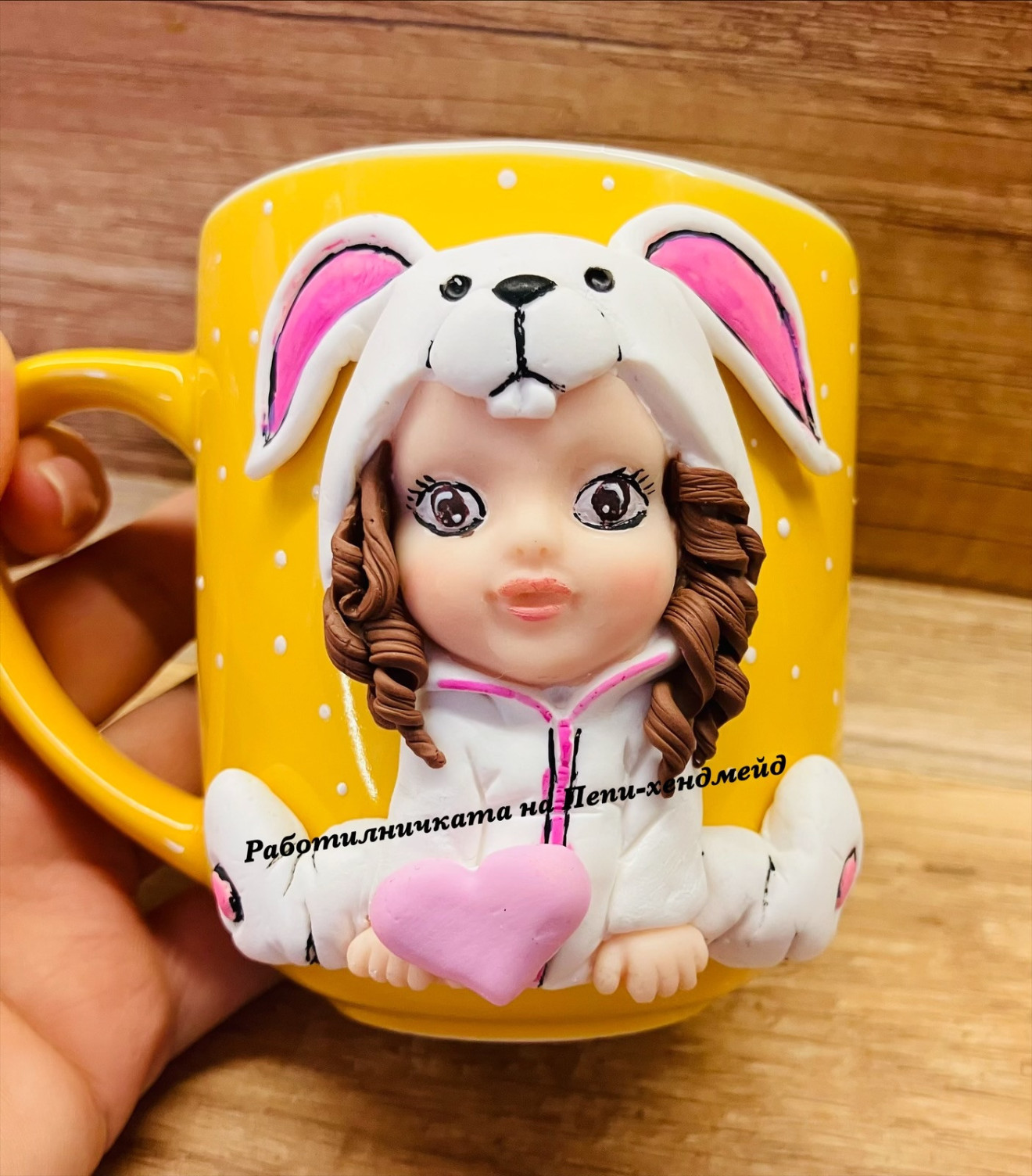 Керамична чаша с декорация от полимерна глина “Момиче със заешки уши”