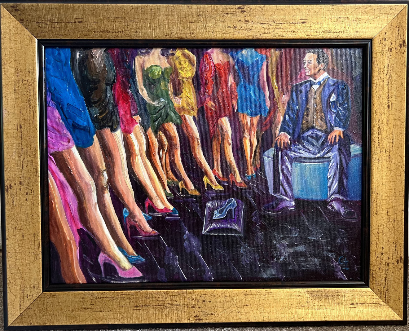 ‘ Без пепеляшка’, маслени бои в/у платно 47/37 см; В приказката за Пепеляшка, другата обувка подсъзнателно е сродната душа, за това и притежателката и е търсена и единствена сред многото. А живот без сродна душа превръща Ромео в Казанова.