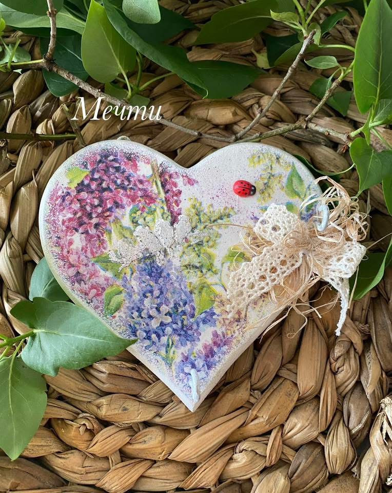 Дървено , декорирано с декупаж, дантела, рафия… С две кукички за закачане. Размери; 13см./12см.