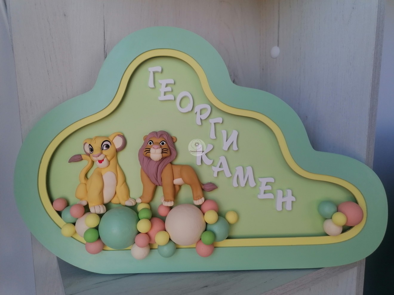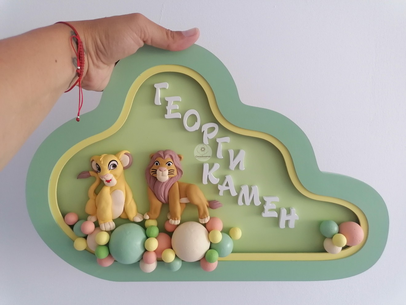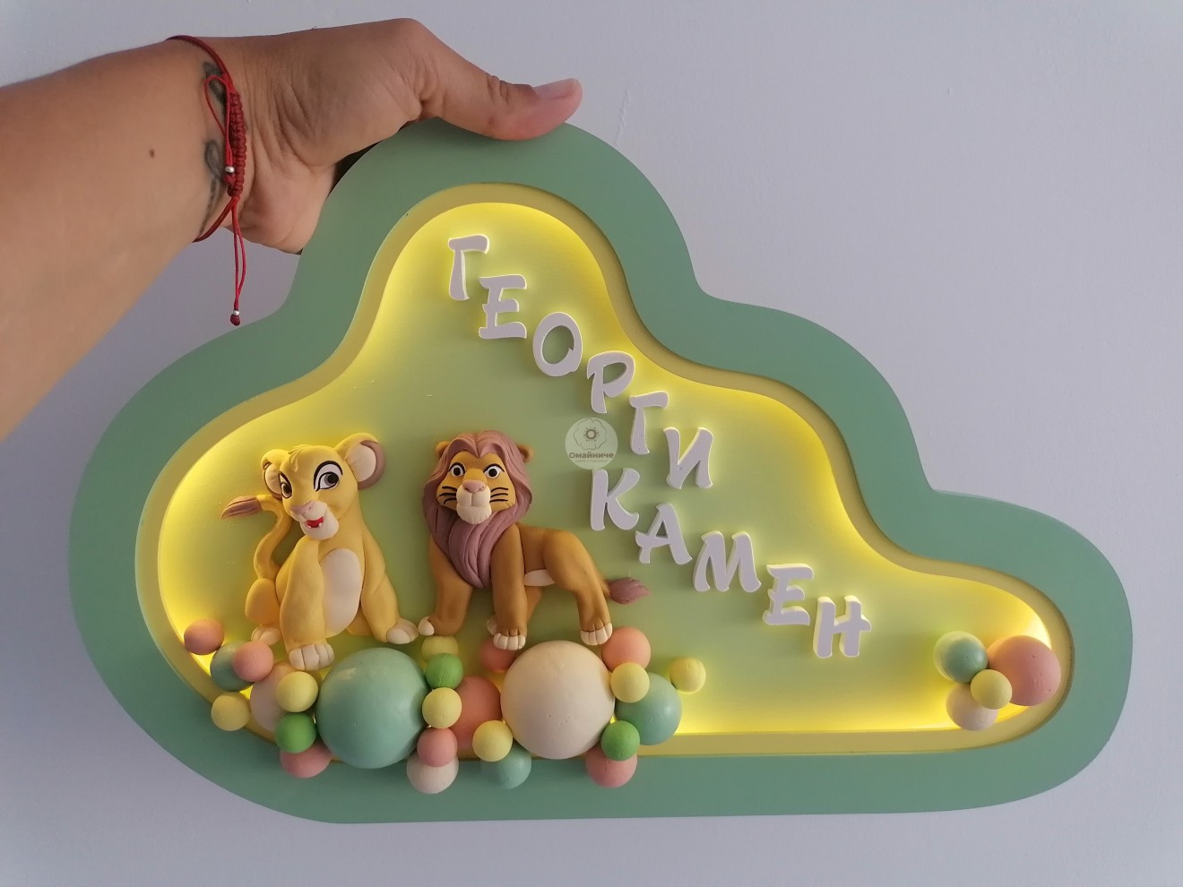 Стенна нощна лампа за детска стая "Симба". МДФ основа с ширина 40см и гипсокерамични елементи, оцветени с акрилни бои, в цветове по избор. Може да се добавят и рождени данни. Свети с бяла LED светлина, на батерии (включени).