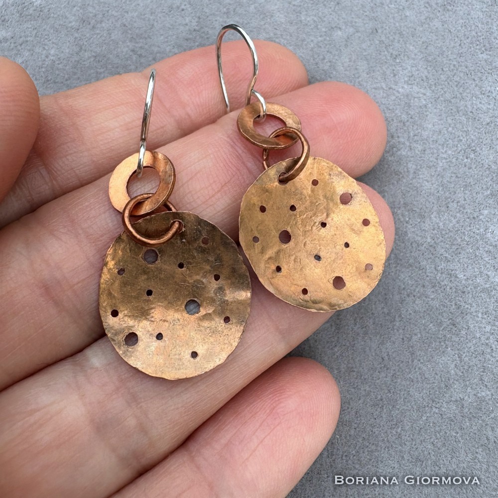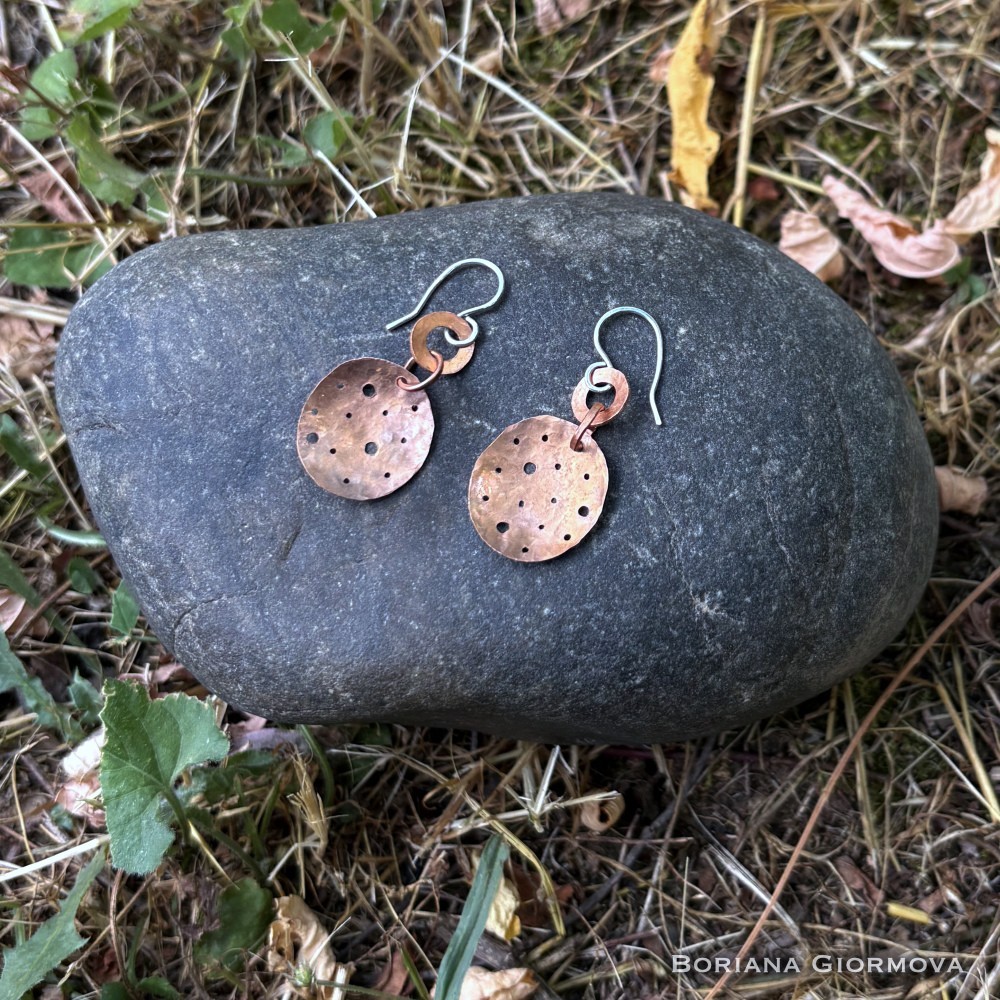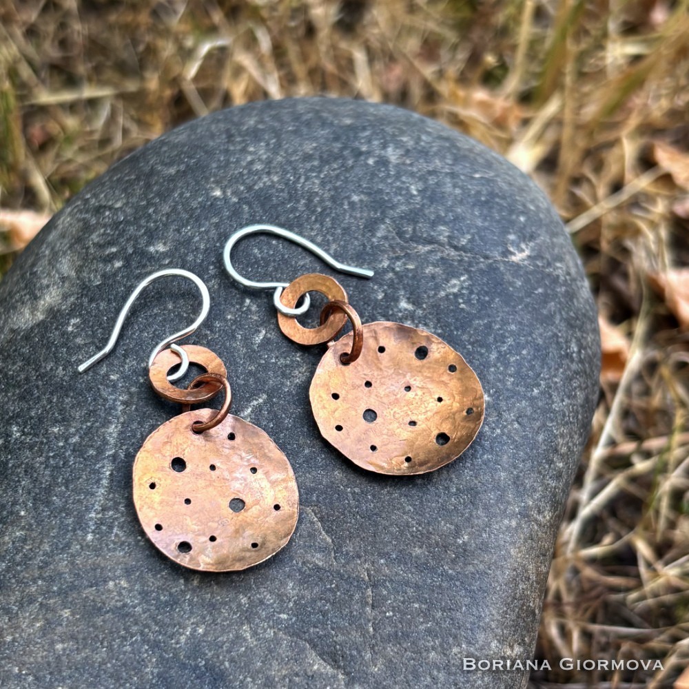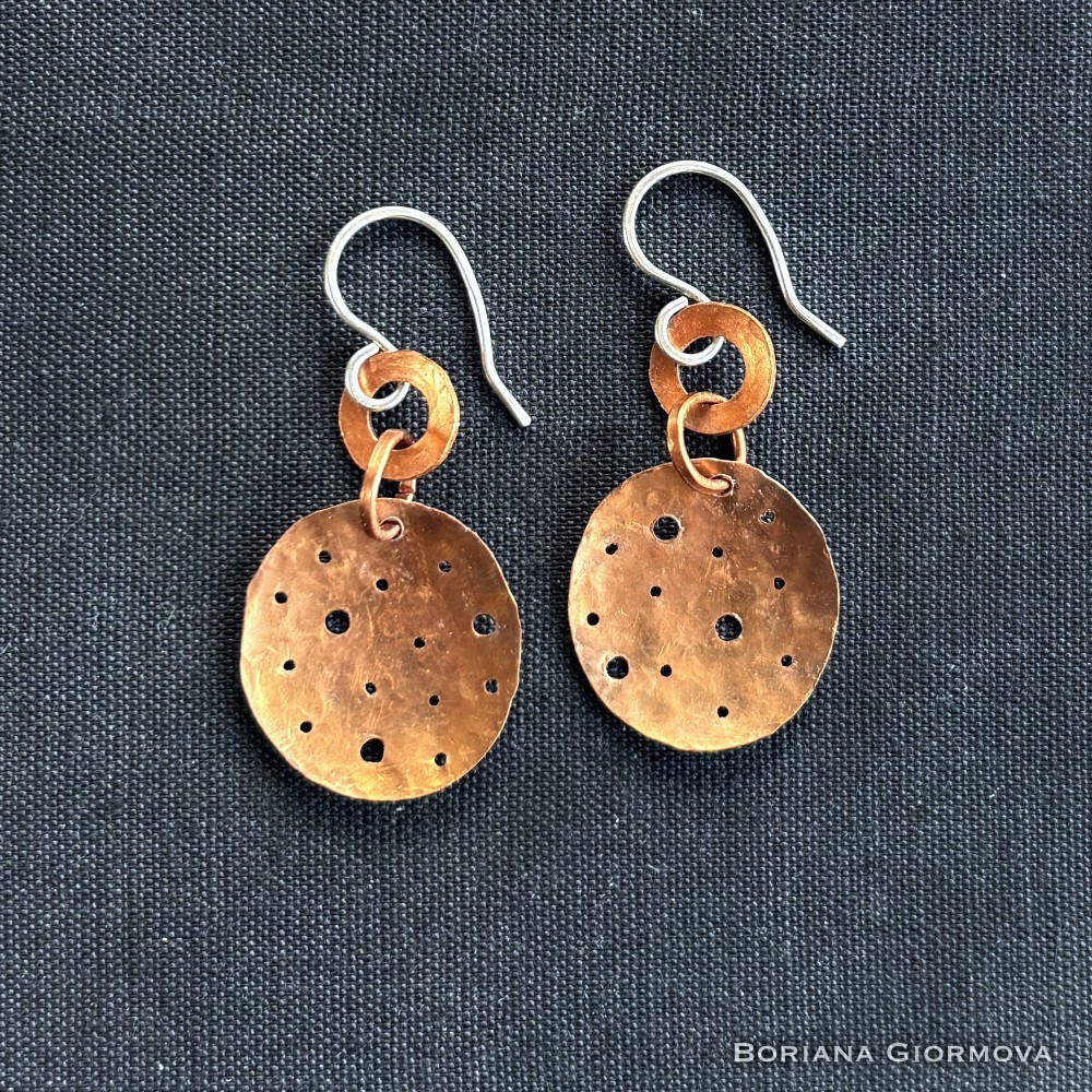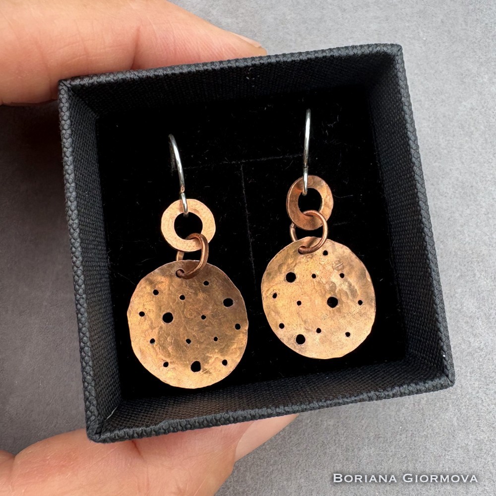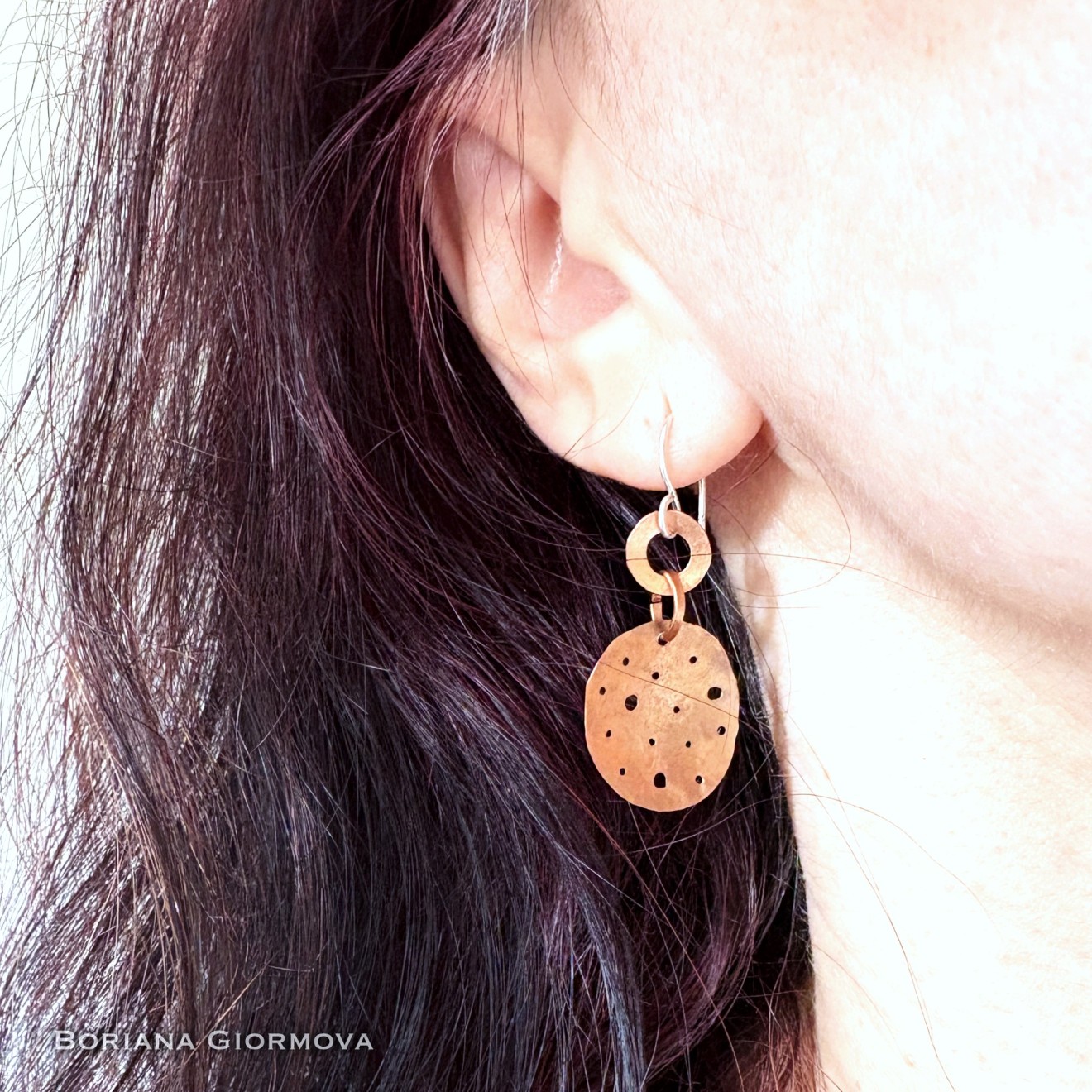 Леки и стилни обеци, изцяло ръчно изработени от оксидирана мед. С оксидиран меден диск и и дупчици с различен диаметър, които придават органично излъчване. Сребърните кукички (проба .925) ги правят хипоалергенни и удобни за целодневно носене, дори при чувствителна кожа. Подходящи са както за ежедневието, така и като артистичен акцент към всеки тоалет. Идеални за подарък – пристигат в кутийка за бижута, готови за поднасяне. Дължина: ~41 мм Материали: оксидиранa мед, сребро 925