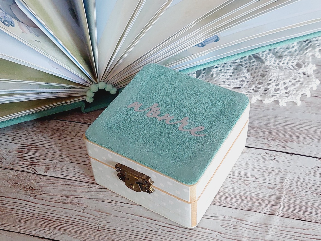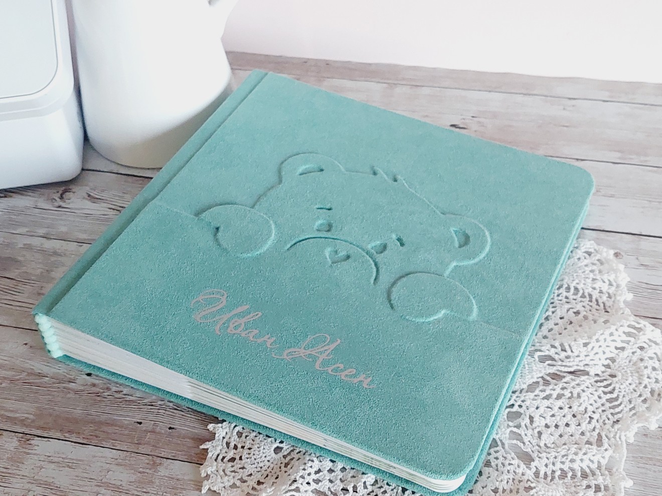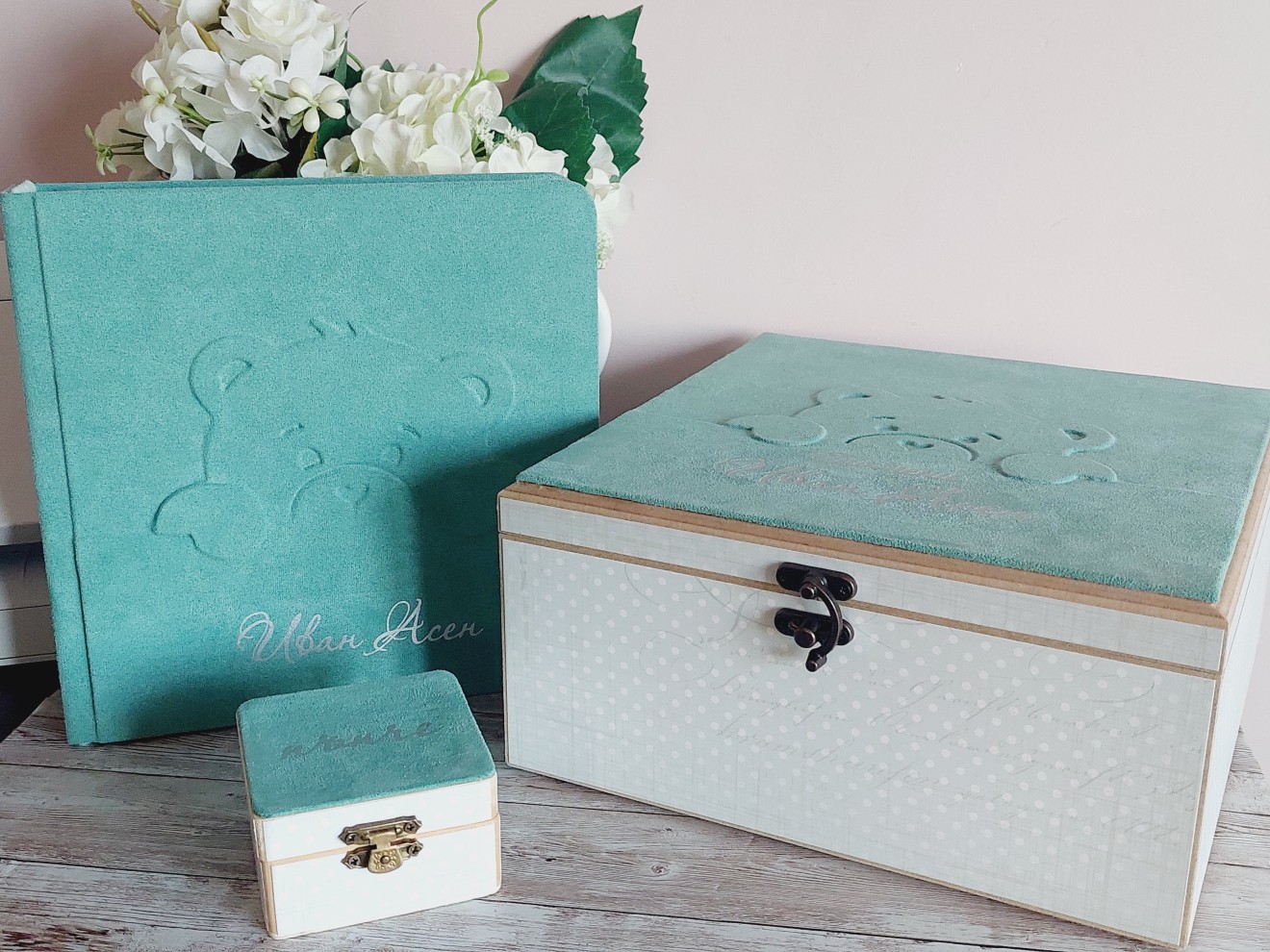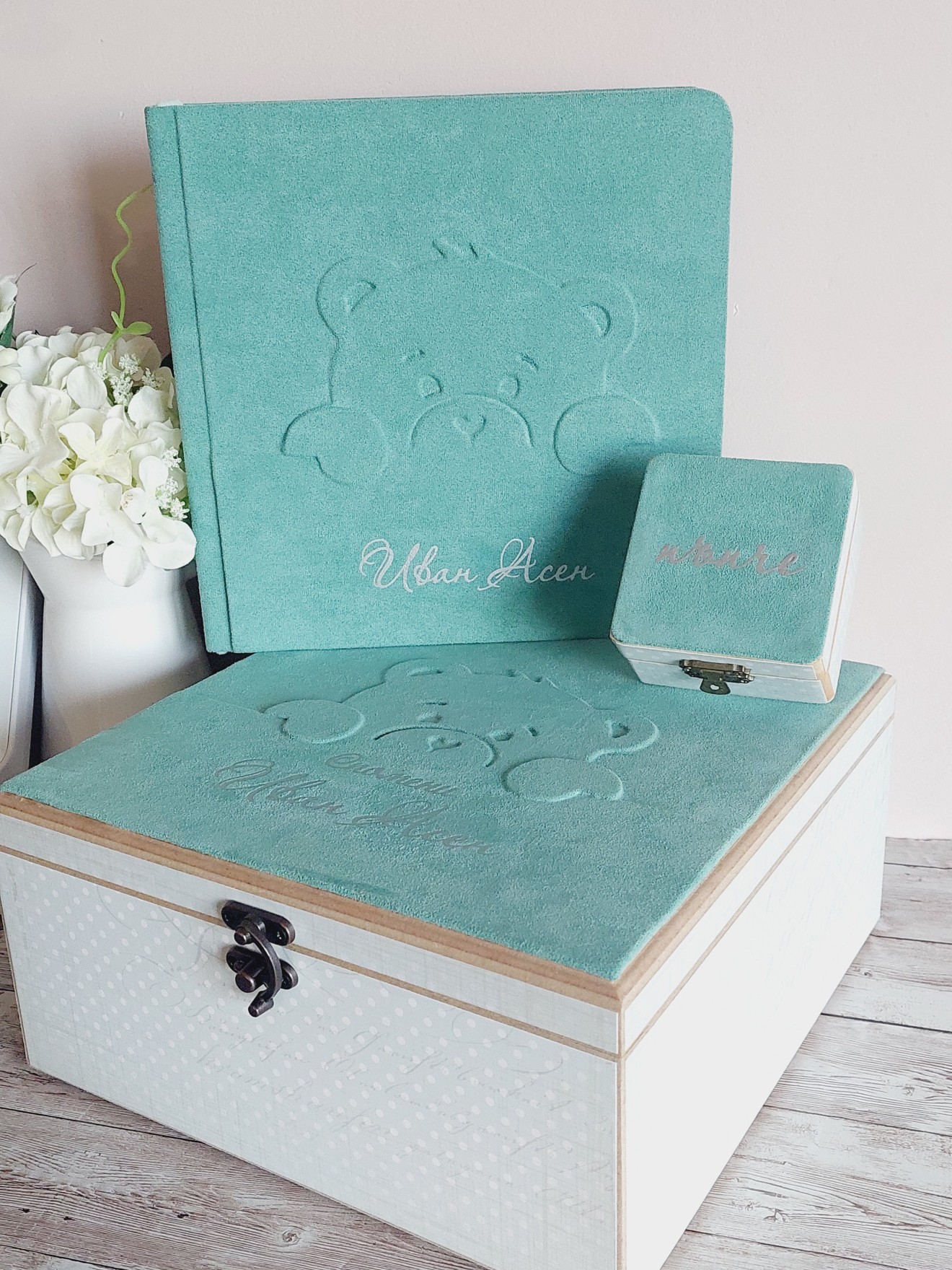 Бебешки комплект с релефно мече Включва: *Голяма кутия *Малка кутийка *Албум за снимки Може да се изработи в цвят по ваш избор. Поръчки се изпълняват само при предварително преведено капаро 50%