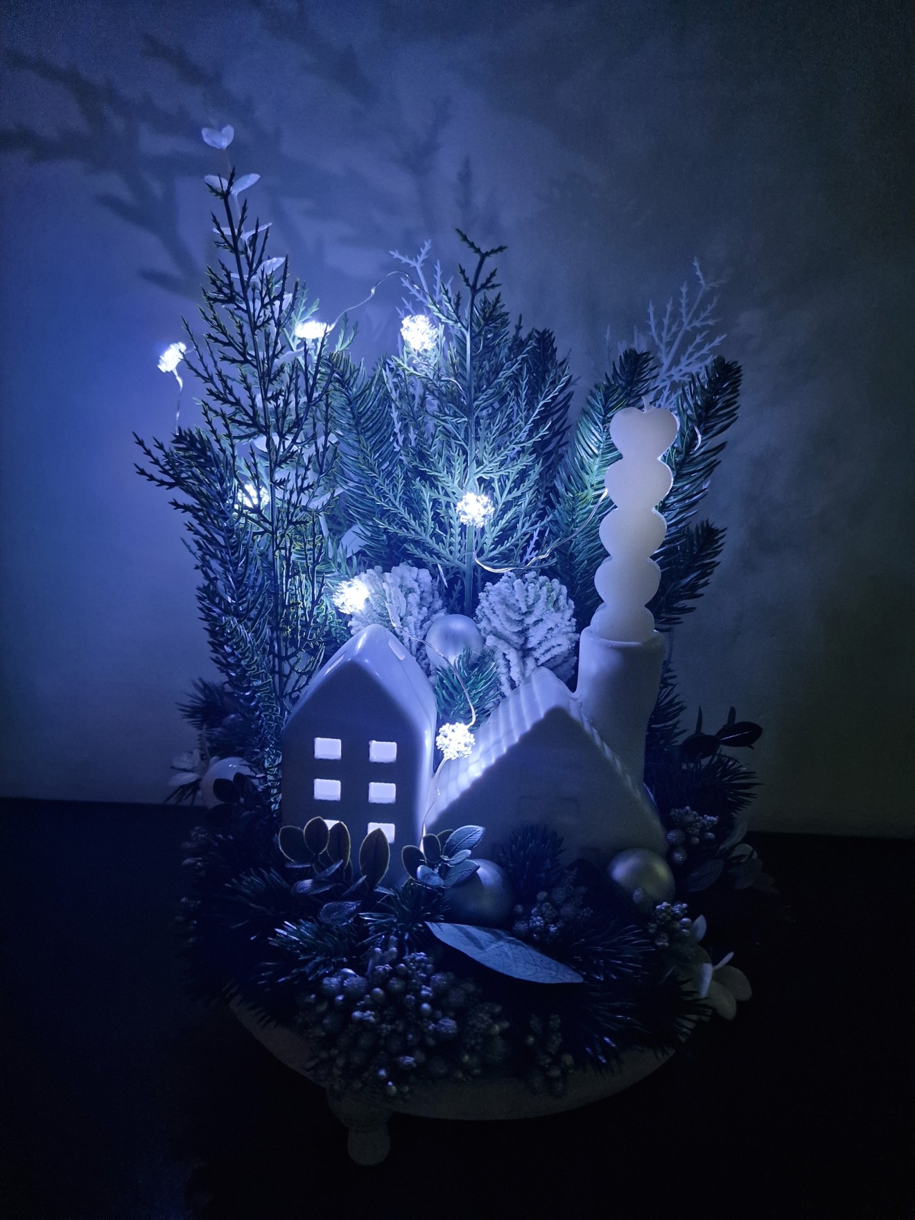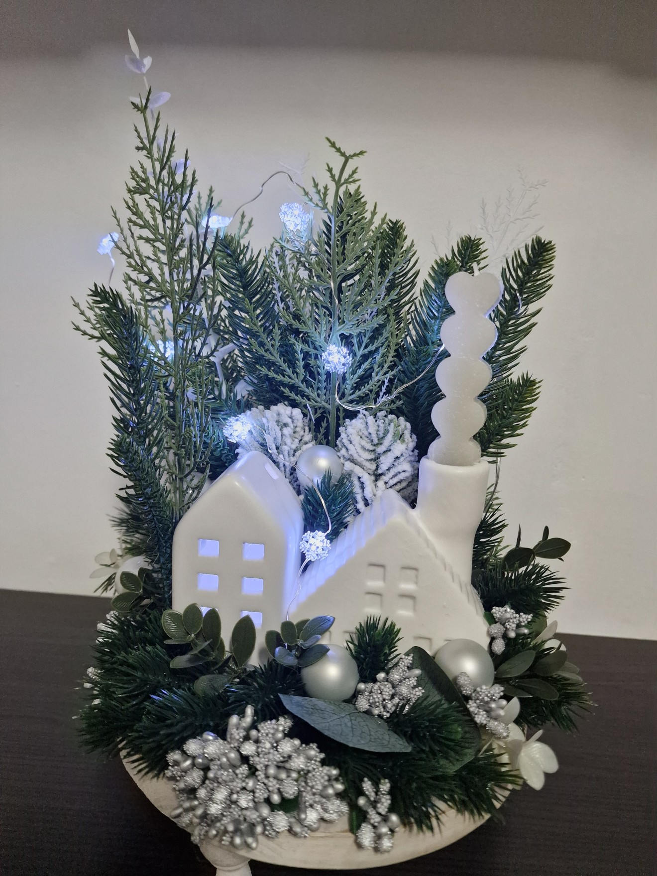 Композиция от бели керамични къщички, изкуствена зеленина, декоративни акценти и LED лампички. Нежното LED осветление придава топлина и създава усещане за уютен зимен пейзаж.
