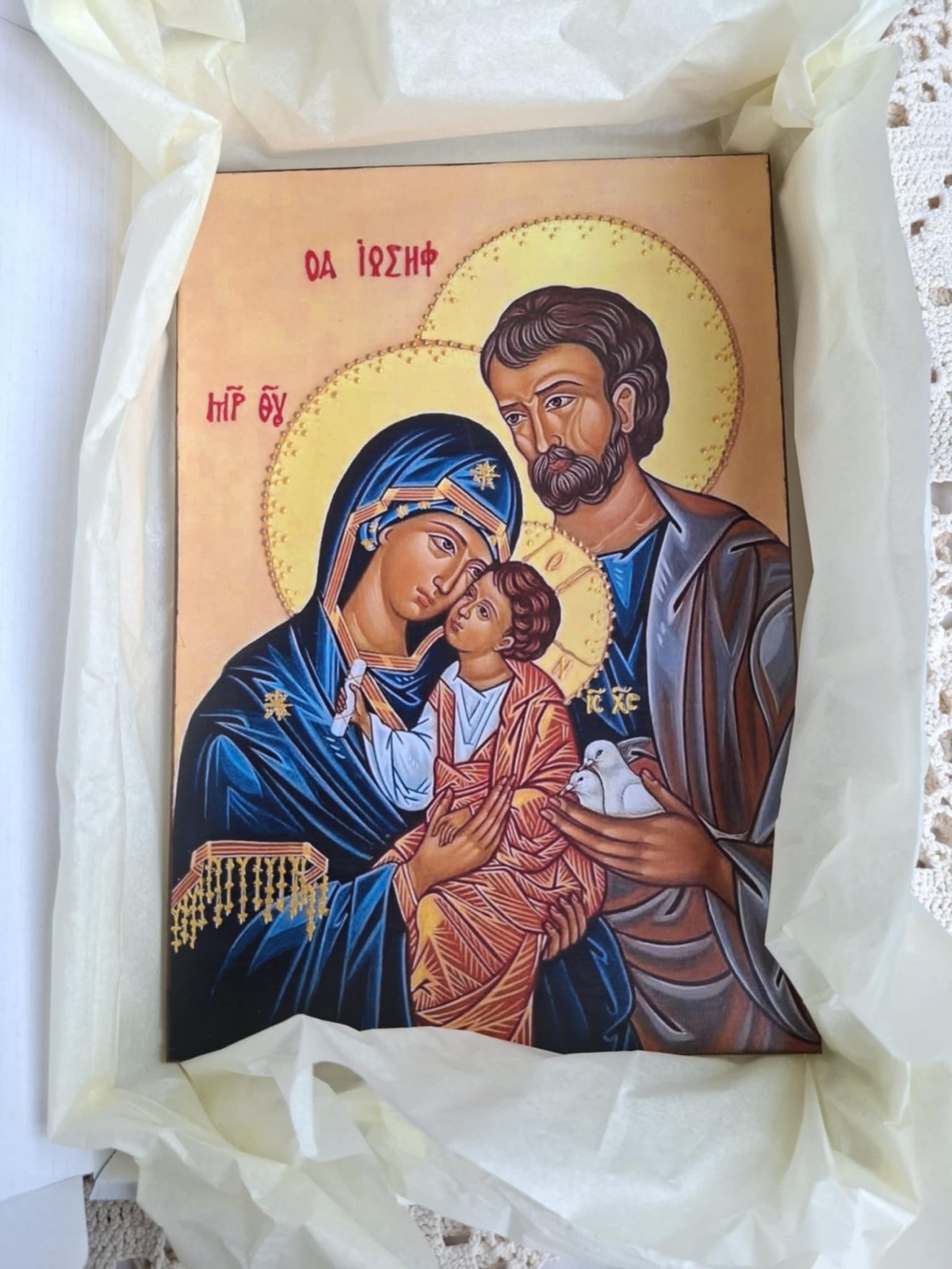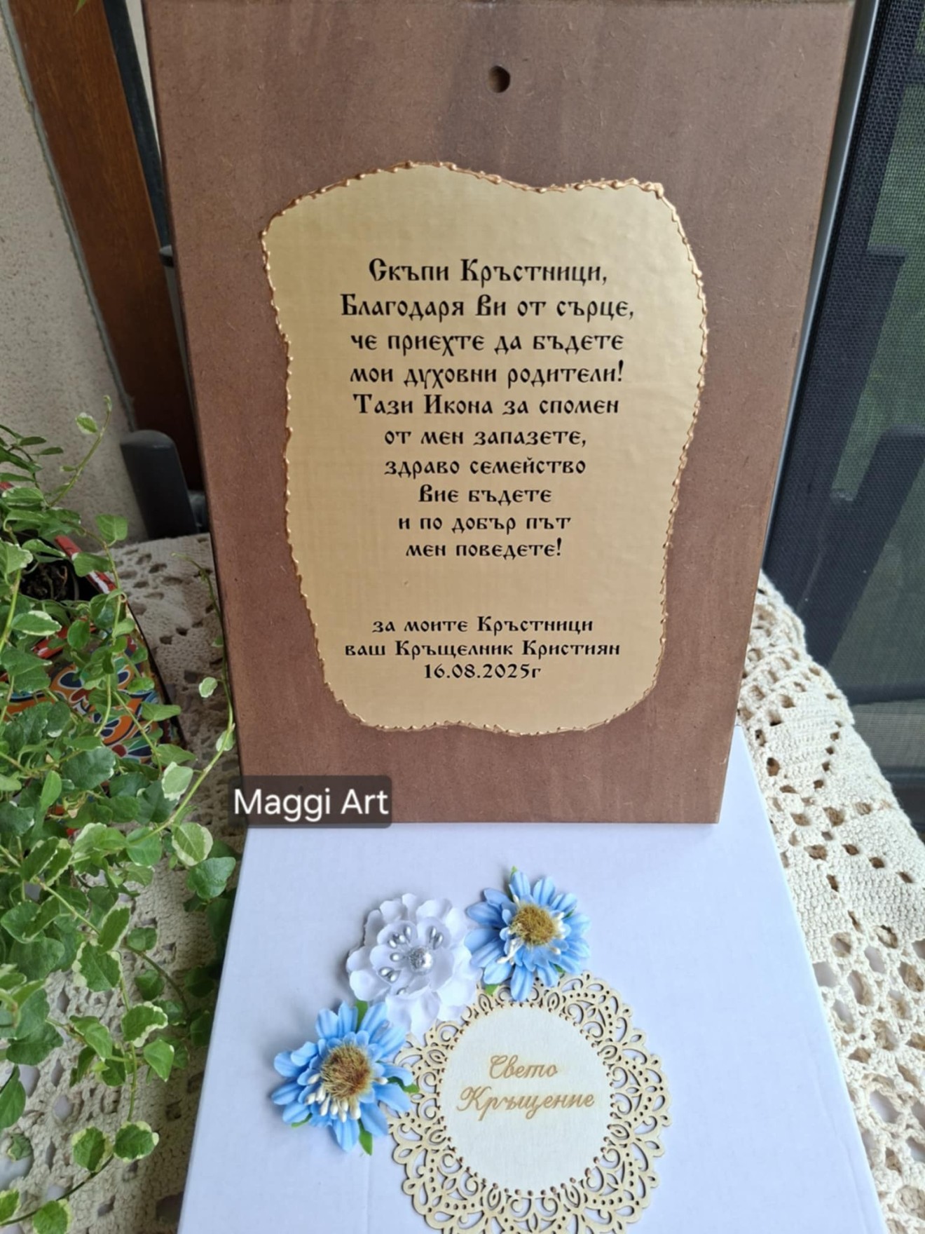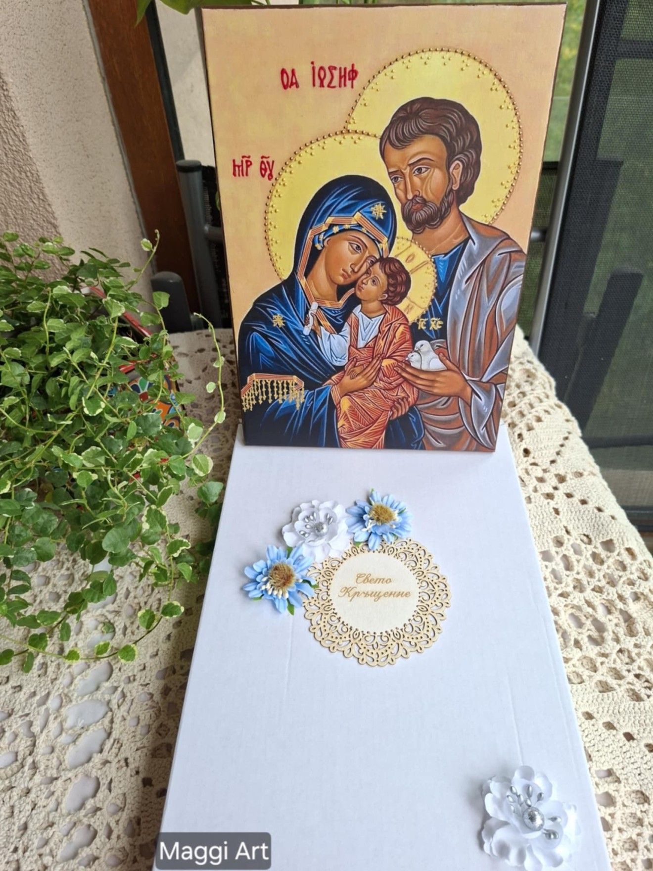 Икона на Светото семейство персонализирана с текст-пожелание подарък за Кръстници. Изработена с техника художествен декупаж,акрилни бои,байц,антични и битумни пасти,контури и пелен восък. Кутията е декорирана с цветя от сатен и хартия,фигурка от бирен картон и други елементи. Размер на Иконата 20/30/2см. Може да бъде изработена и в друг размер.