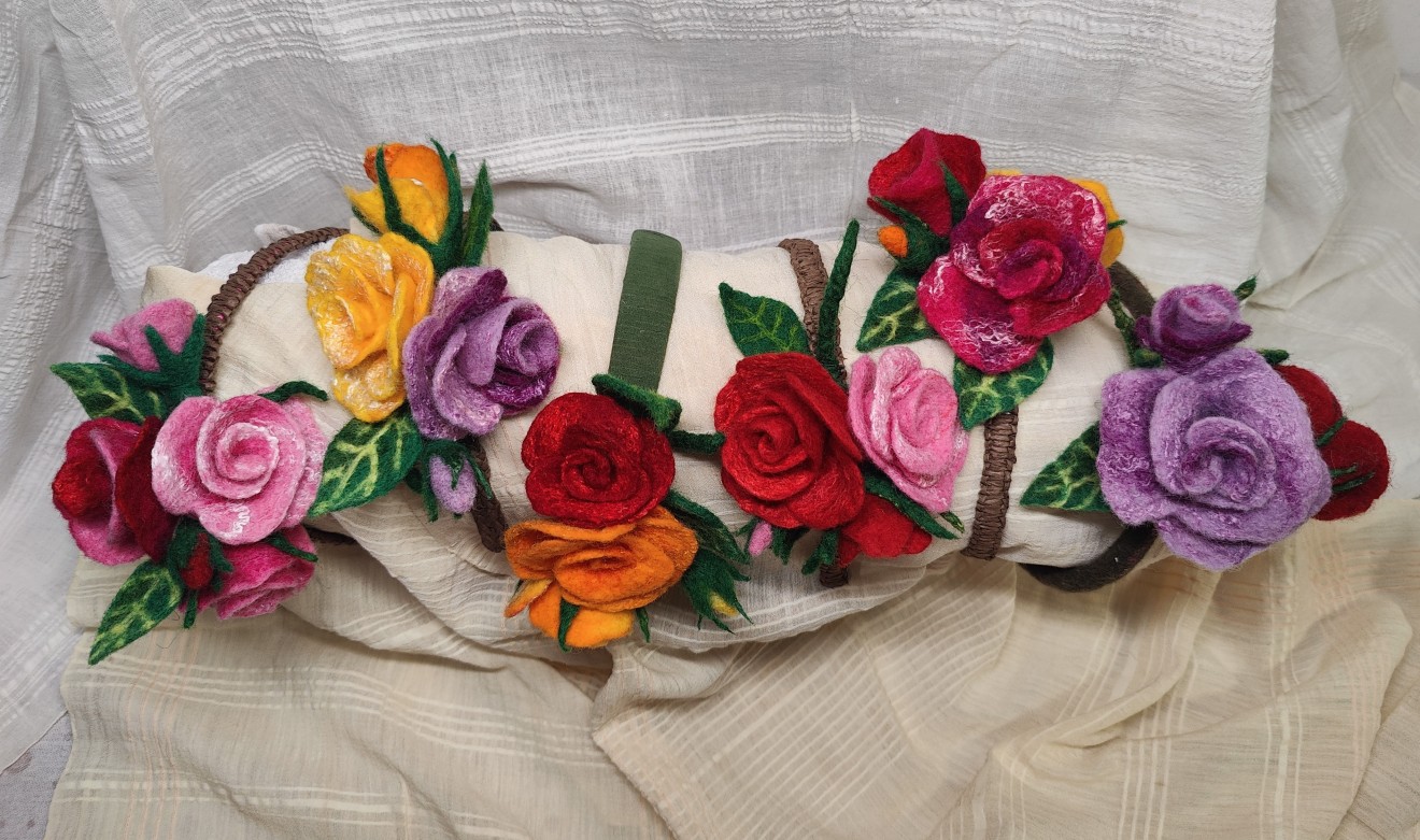 Диадеми, аранжирани с плъстени рози - смесена техника мокро и сухо валяне. Подходящи за аксесоар към народни носии.