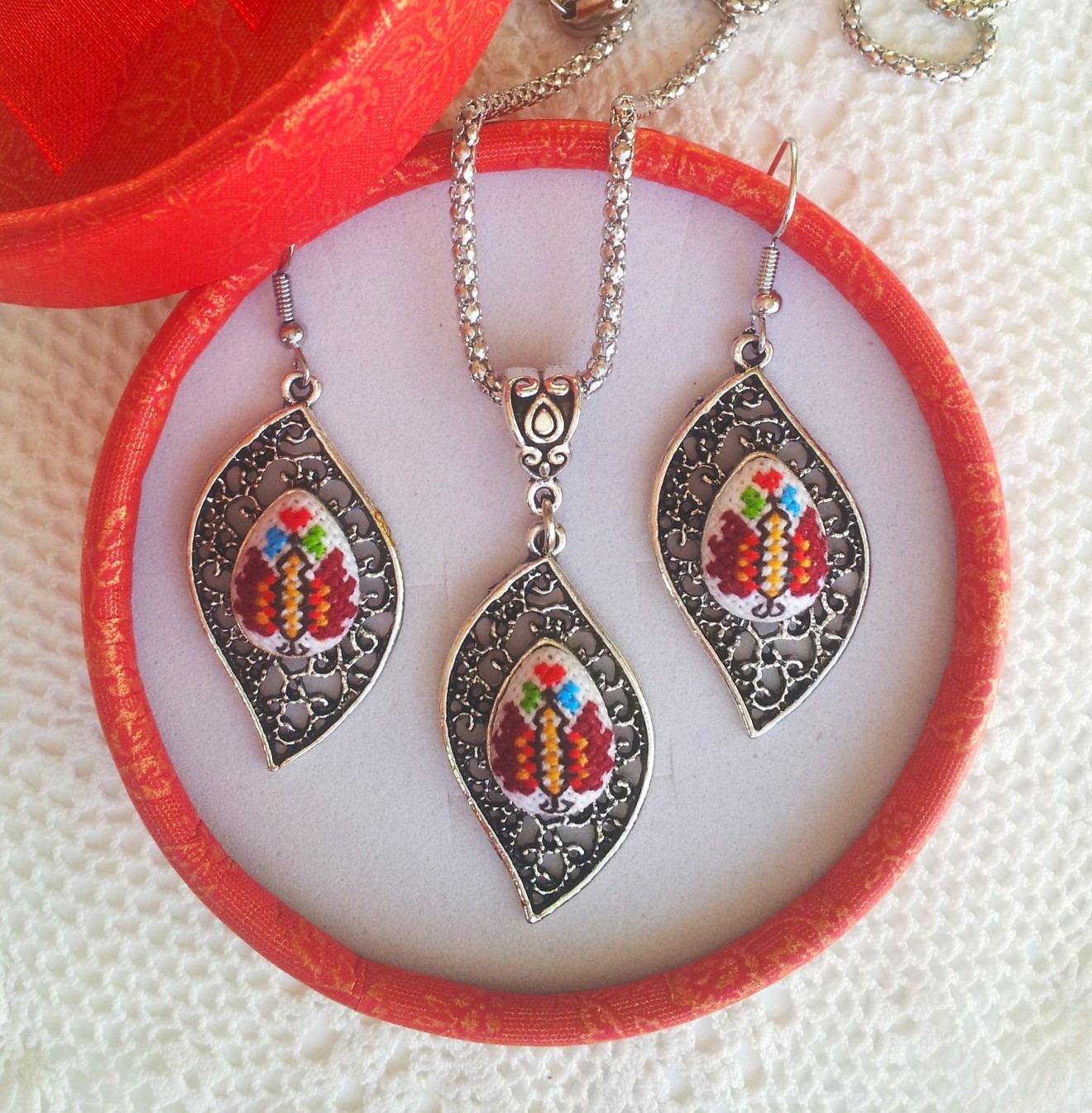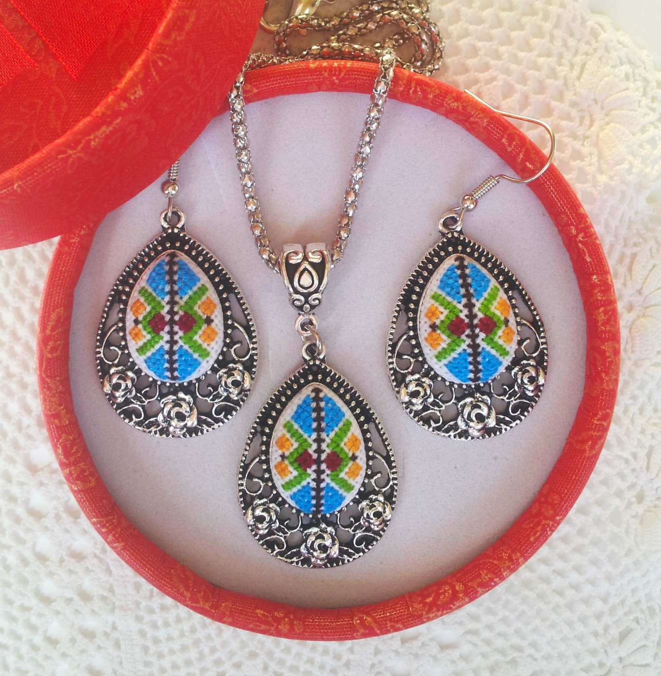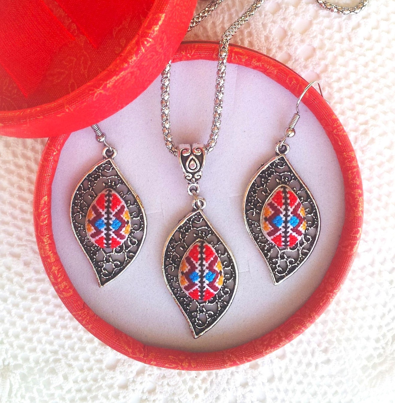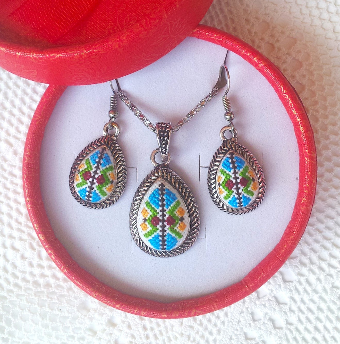 Комплект бижута с ръчно бродирани шевици. Обкова е от висококачествена бижутерска сплав.