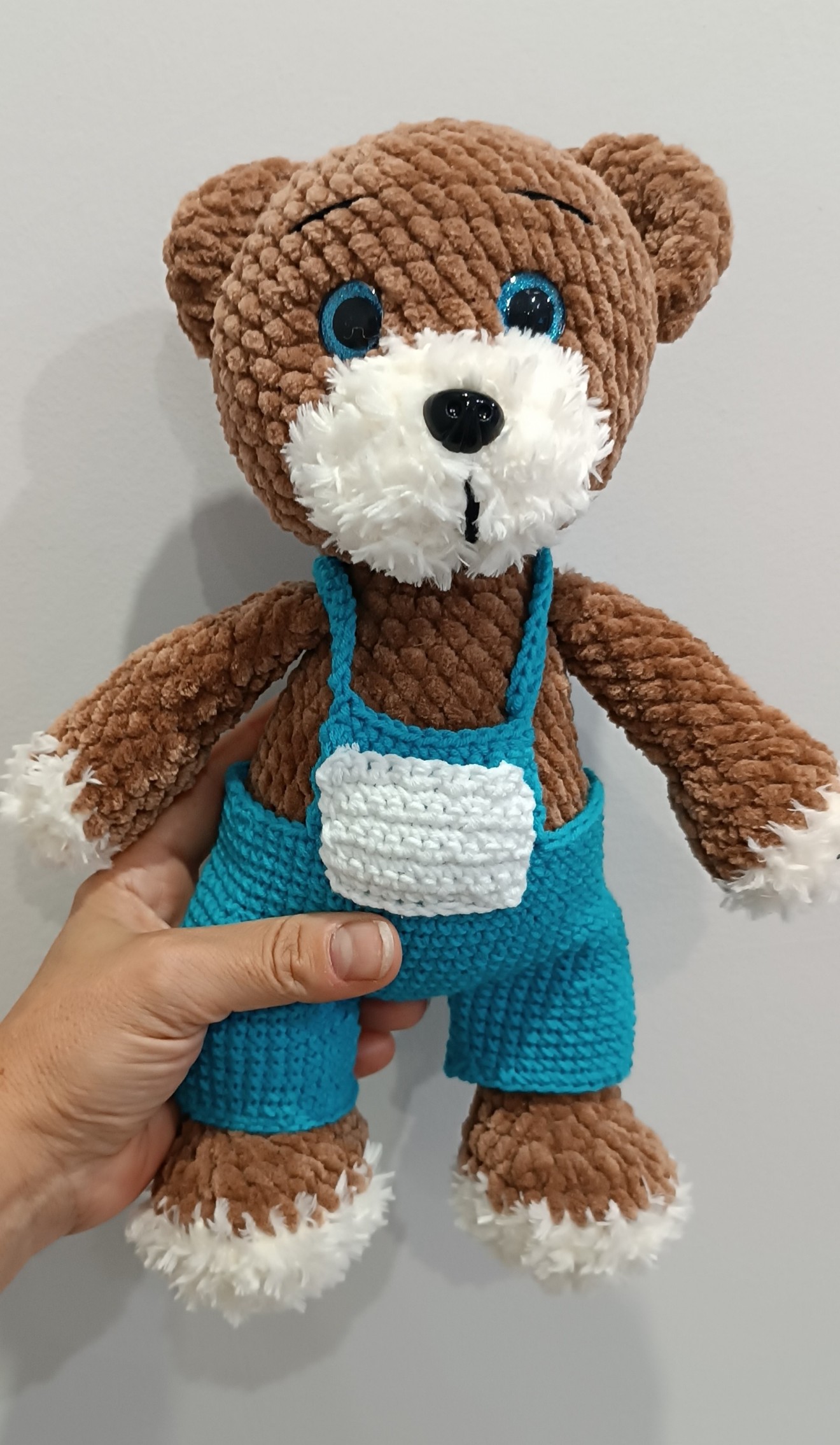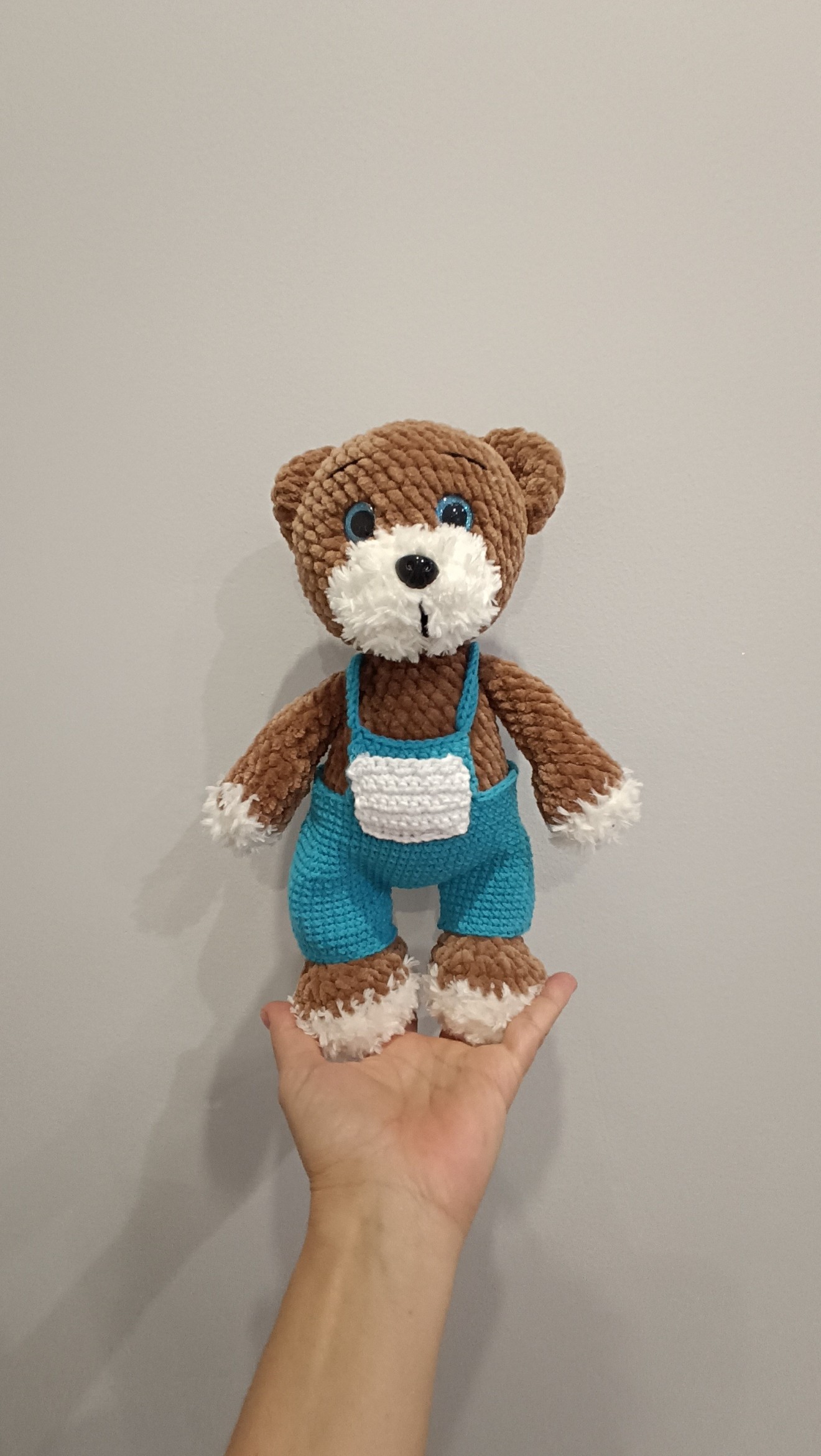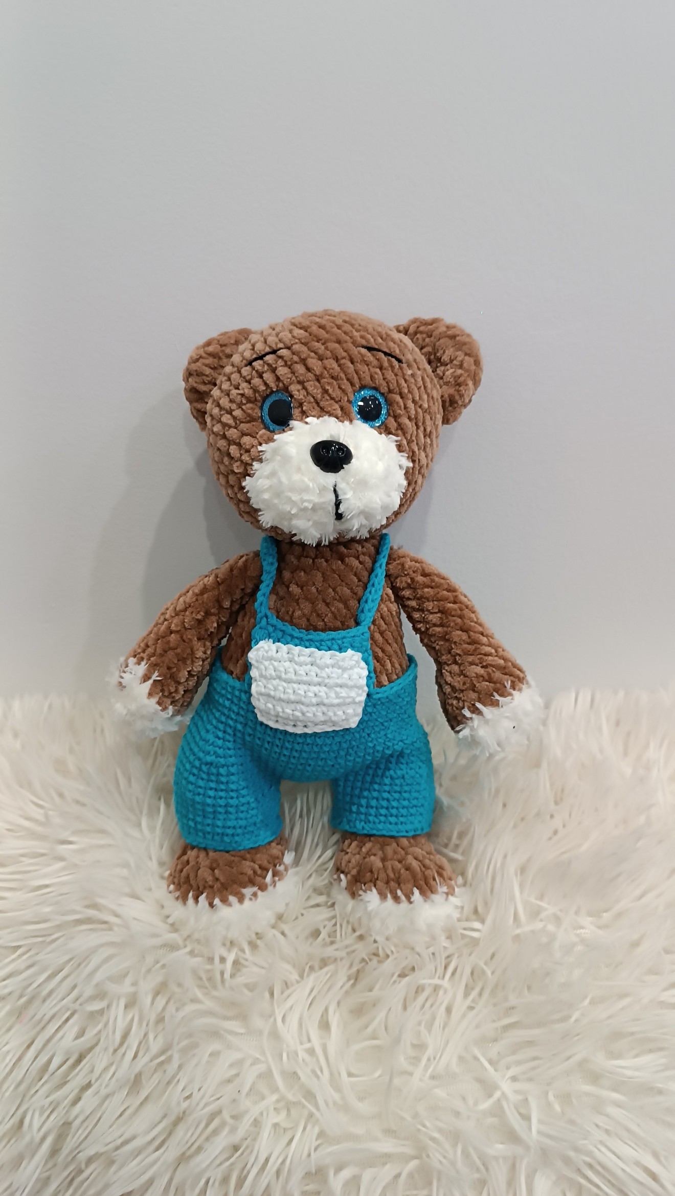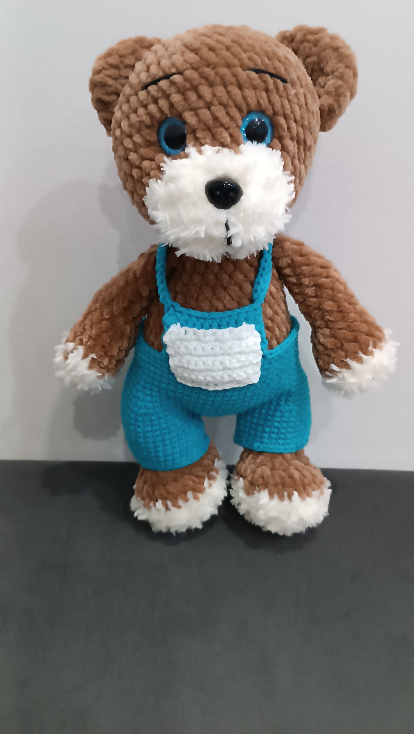 Ръчно плетено мече .Високо около 25см.Дрешките се свалят Силиконов пълнеж и предпазни очички