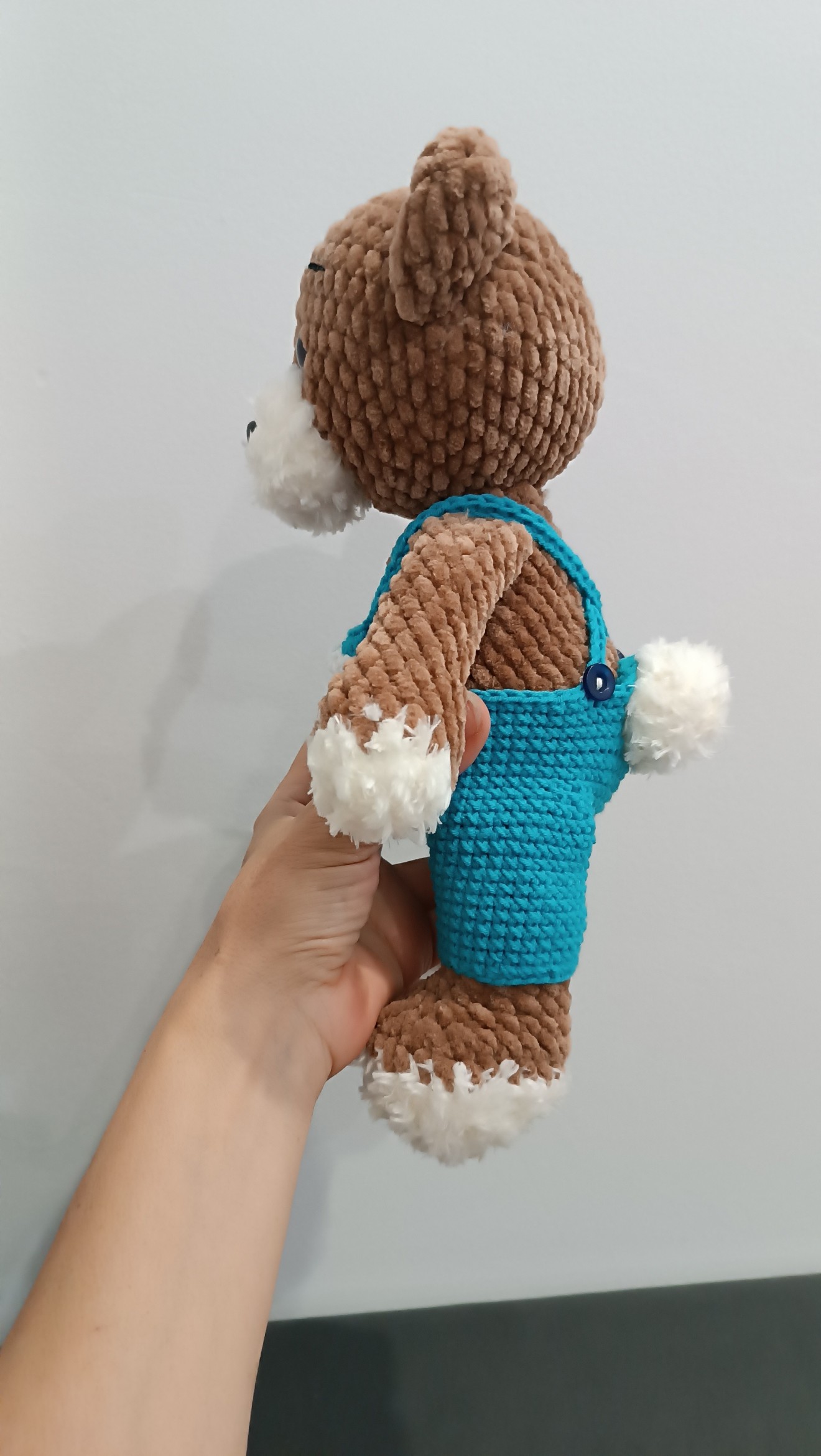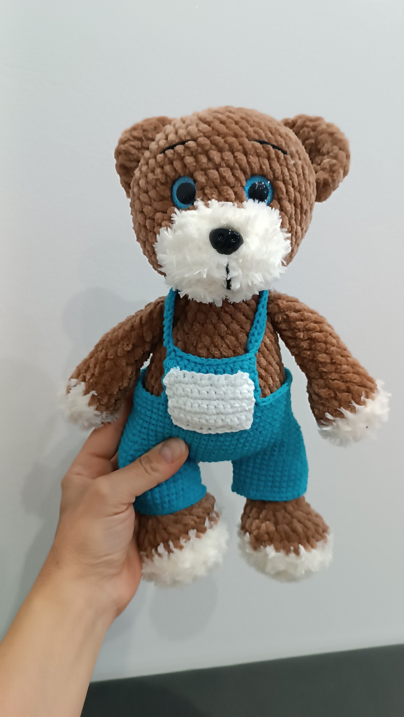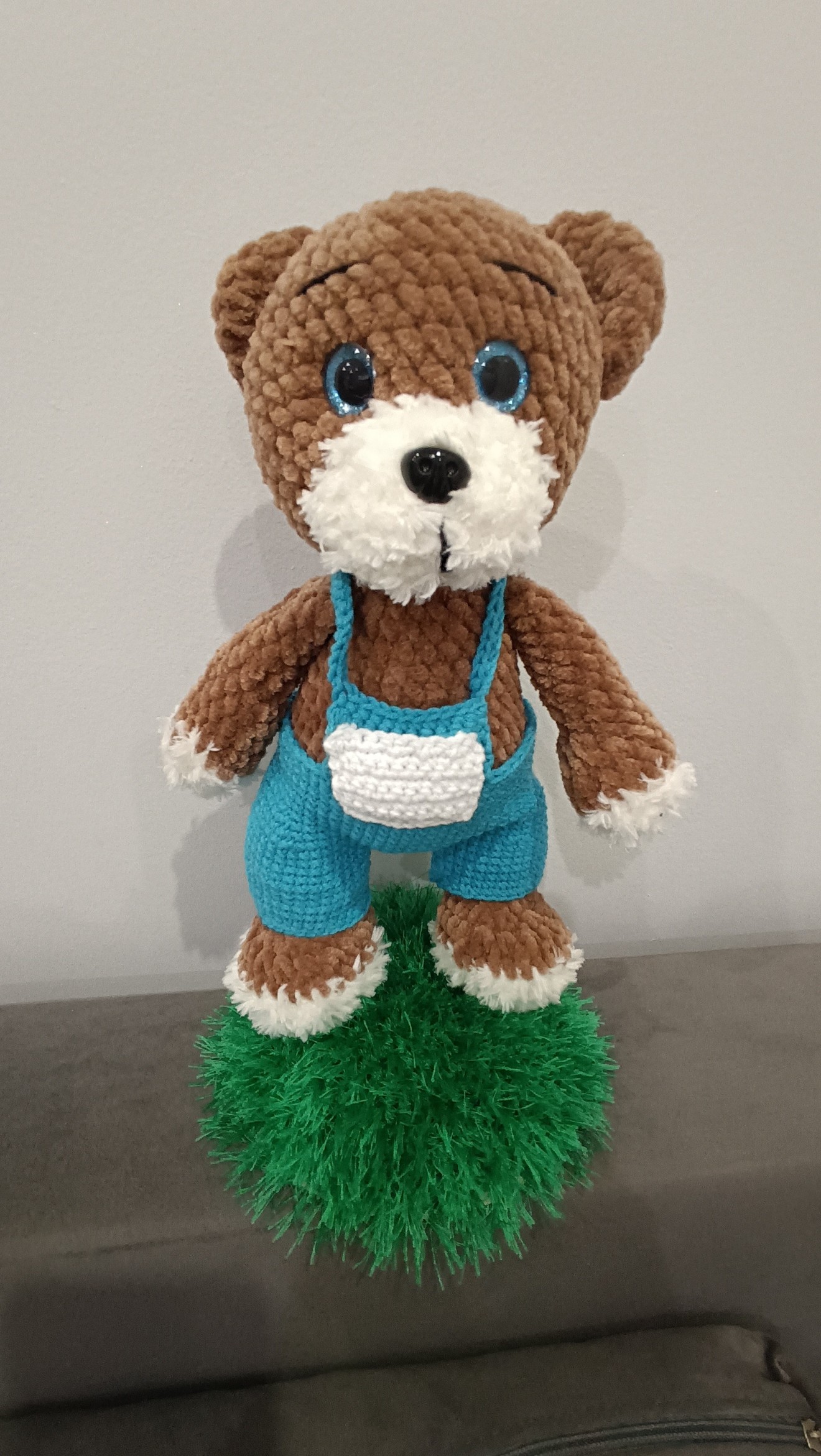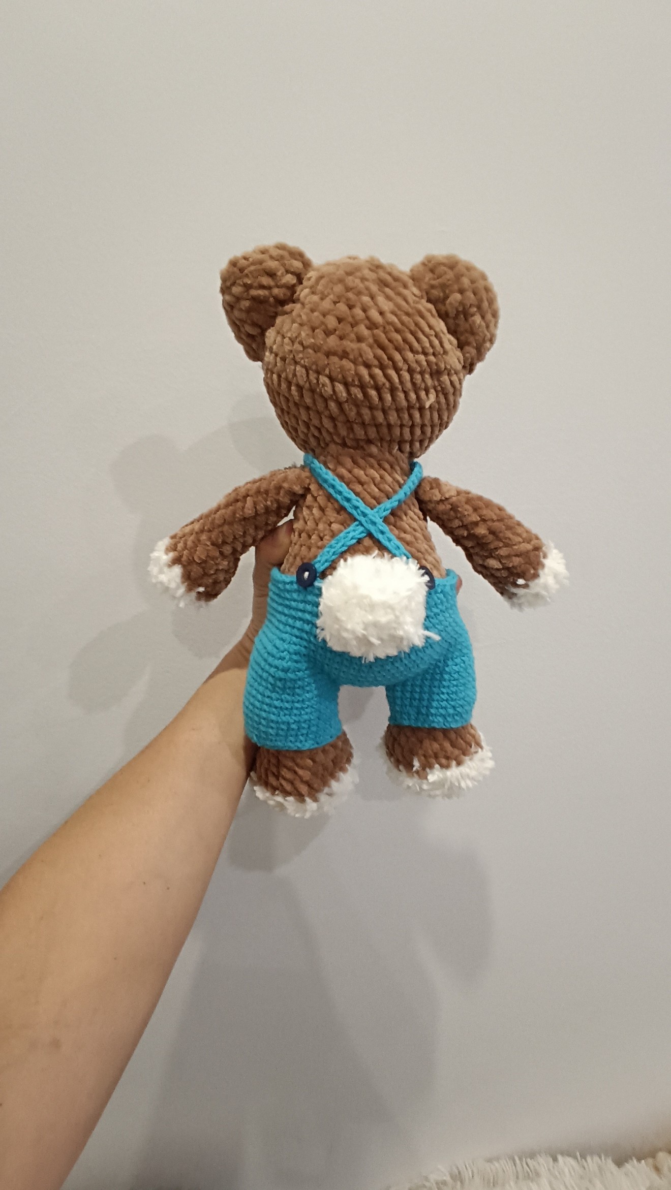 Ръчно плетено мече .Високо около 25см.Дрешките се свалят Силиконов пълнеж и предпазни очички
