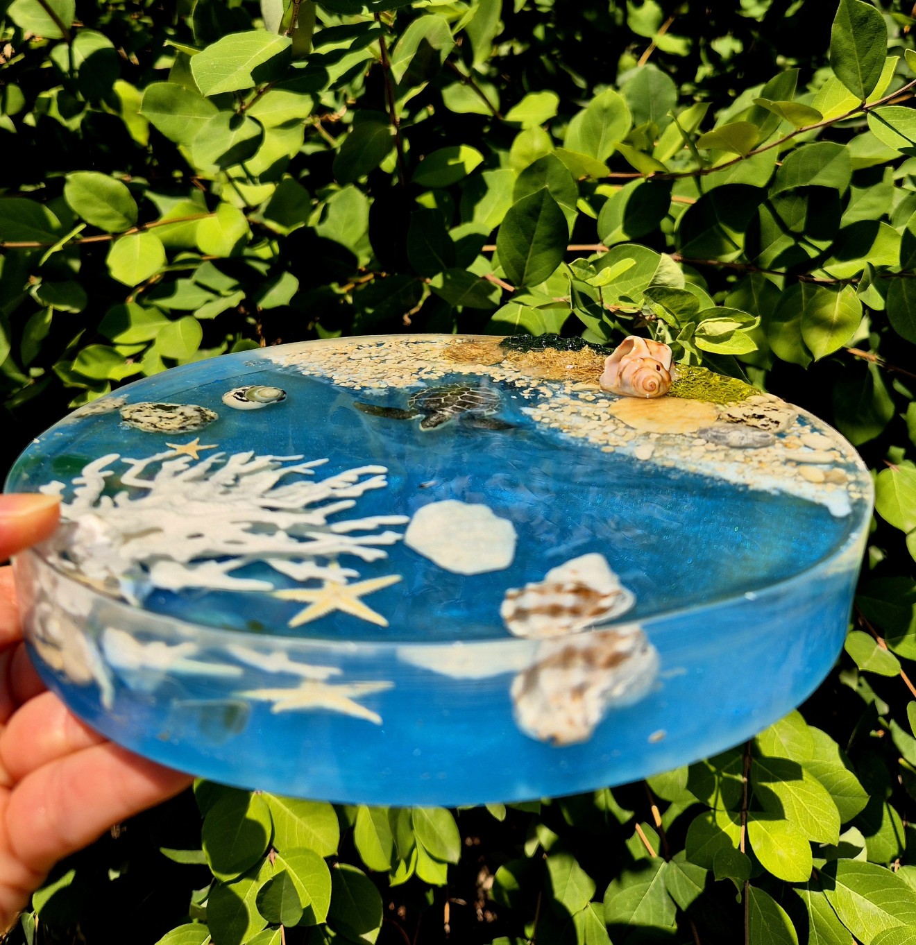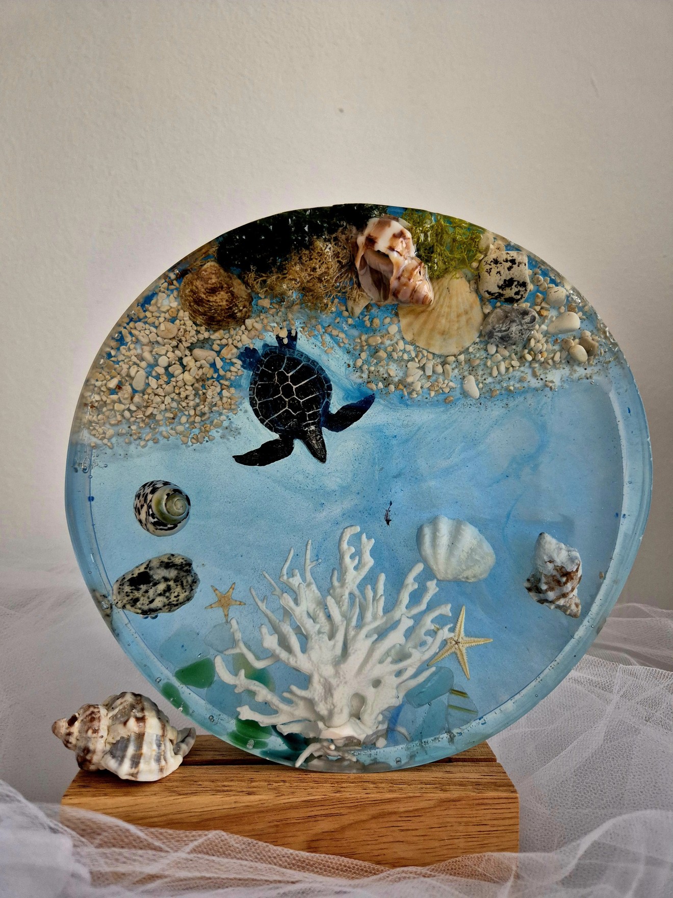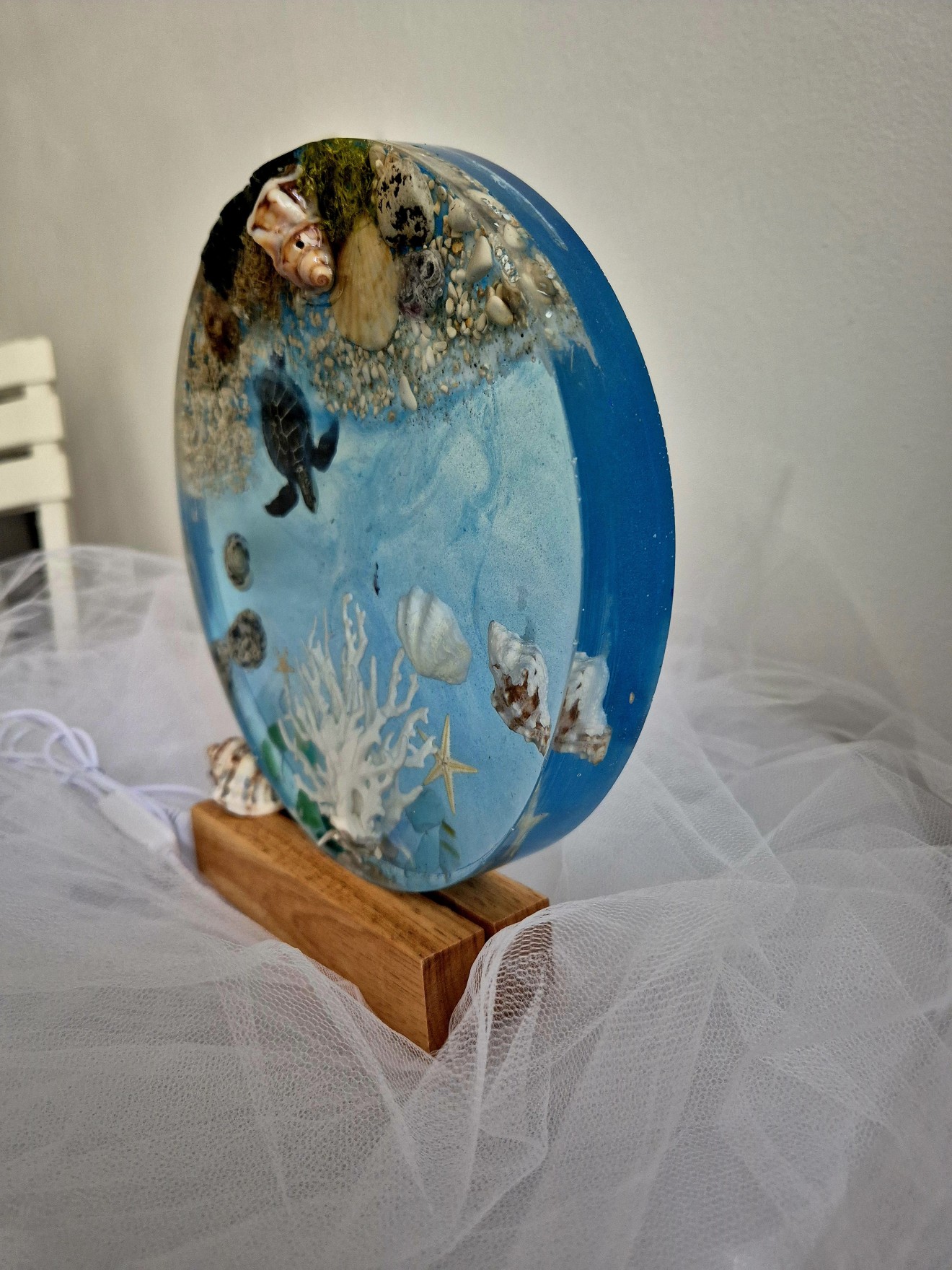 🌊 "Морски сън" - ръчно изработена декорация от епоксидна смола с LED осветление. Открийте тишината на подводния свят, събрана в една изумителна, ръчно изработена декорация, която сякаш носи дъха на морето. В центъра ѝ - елегантна морска костенурка, която се носи над бели корали, миди, раковини, звезди и морски пясък - всеки детайл е внимателно подбран и запечатан във вечността чрез прозрачната магия на епоксидната смола. Вграденото LED осветление с нежна бяла светлина, активирано чрез USB кабел, придава мек блясък, който озарява пространството и превръща декорацията в ефирен нощен акцент или артистичен елемент от интериора.