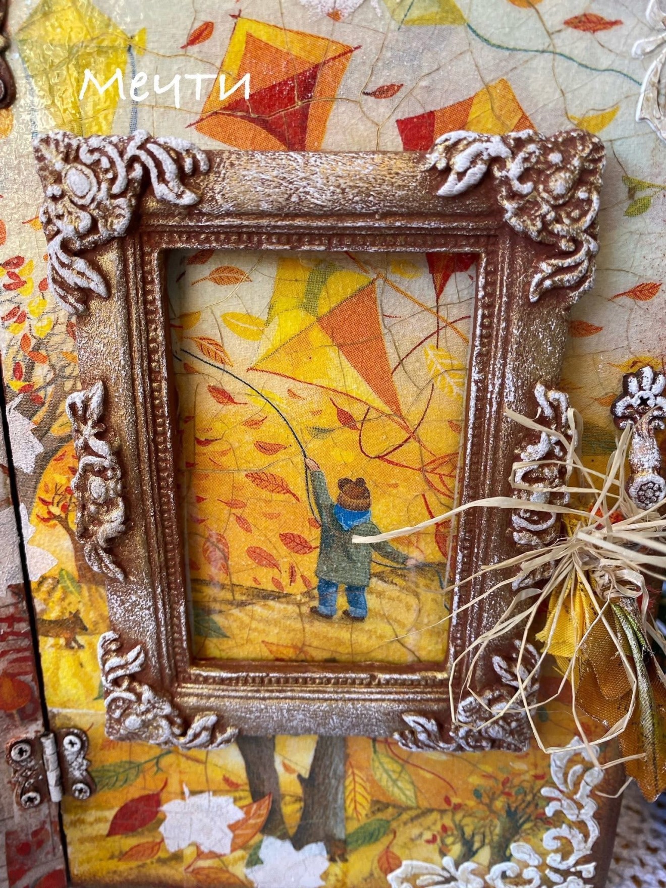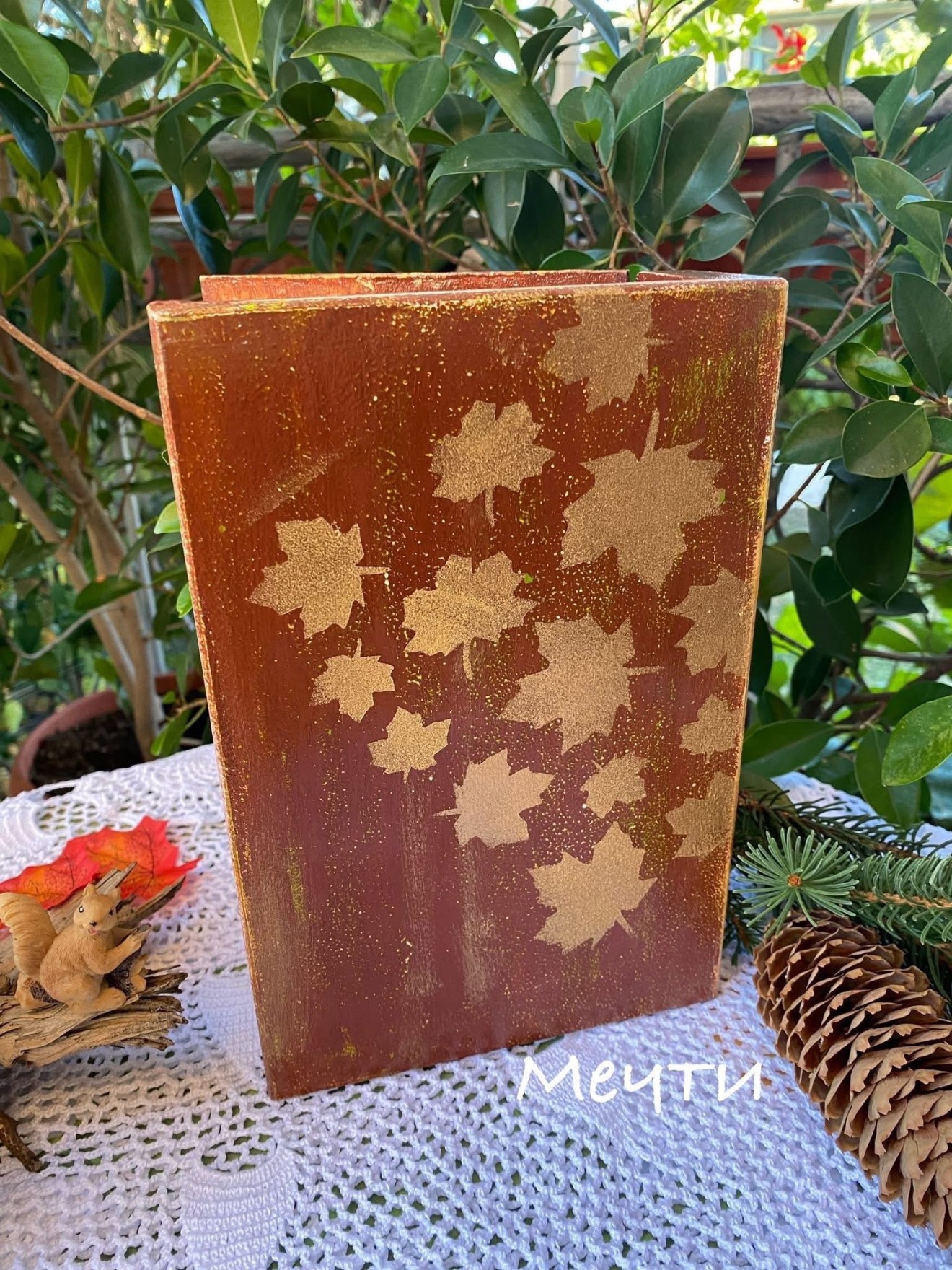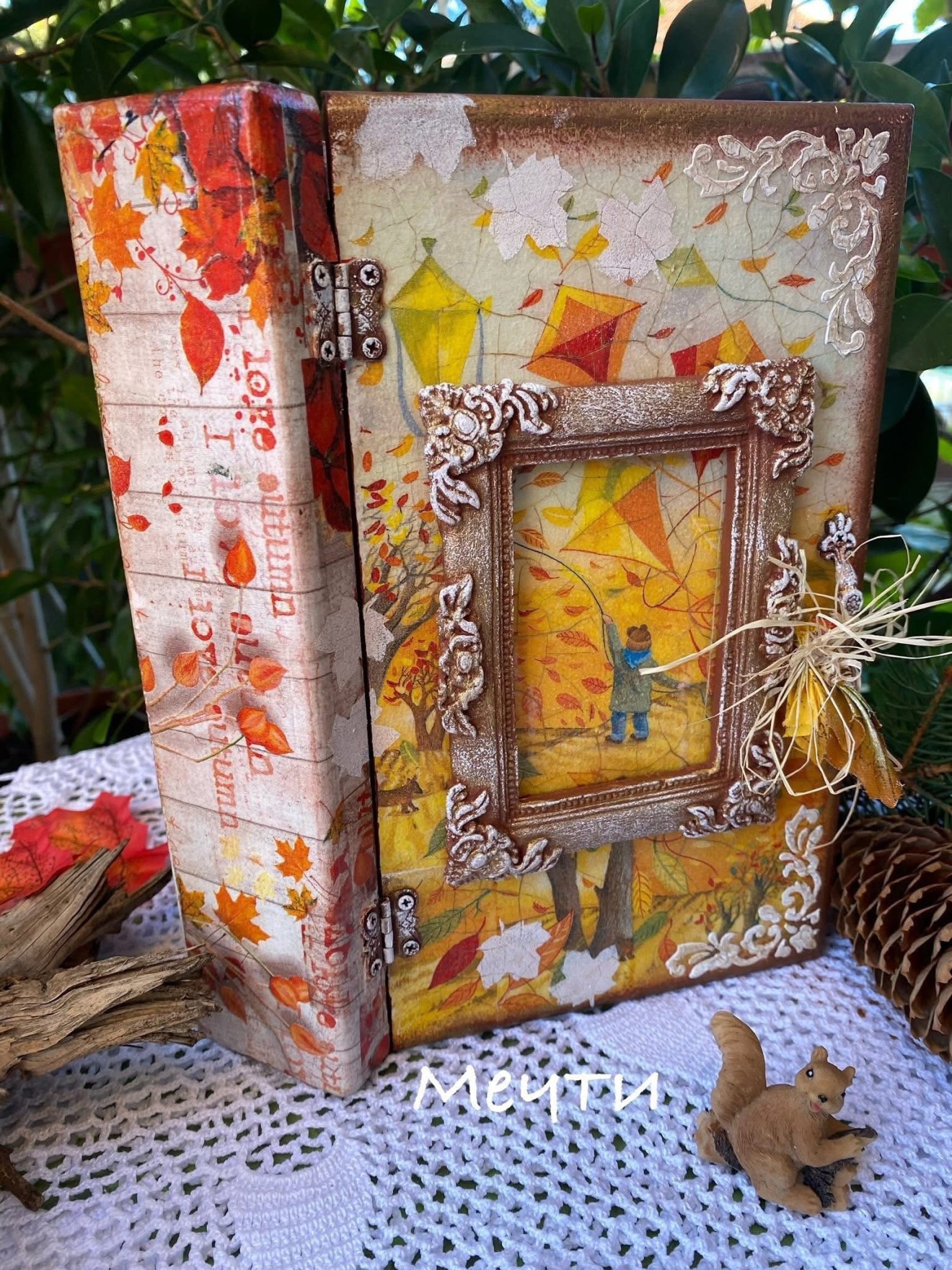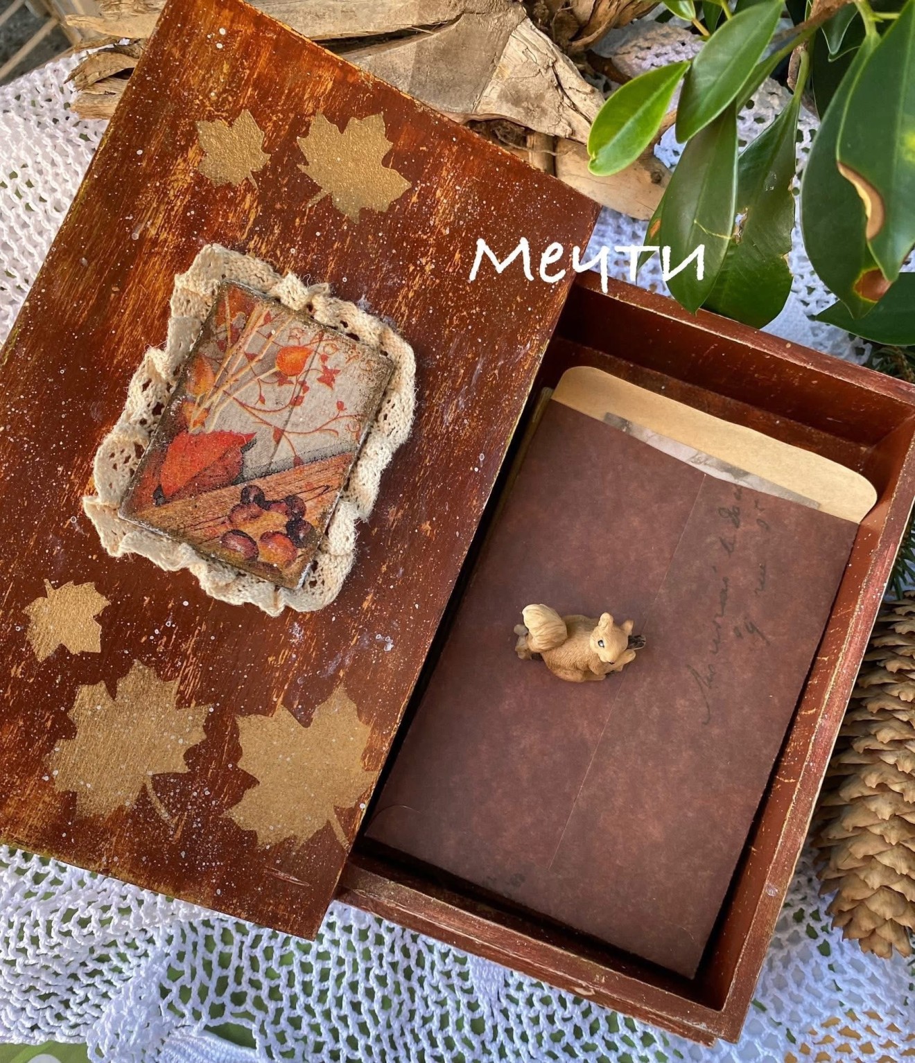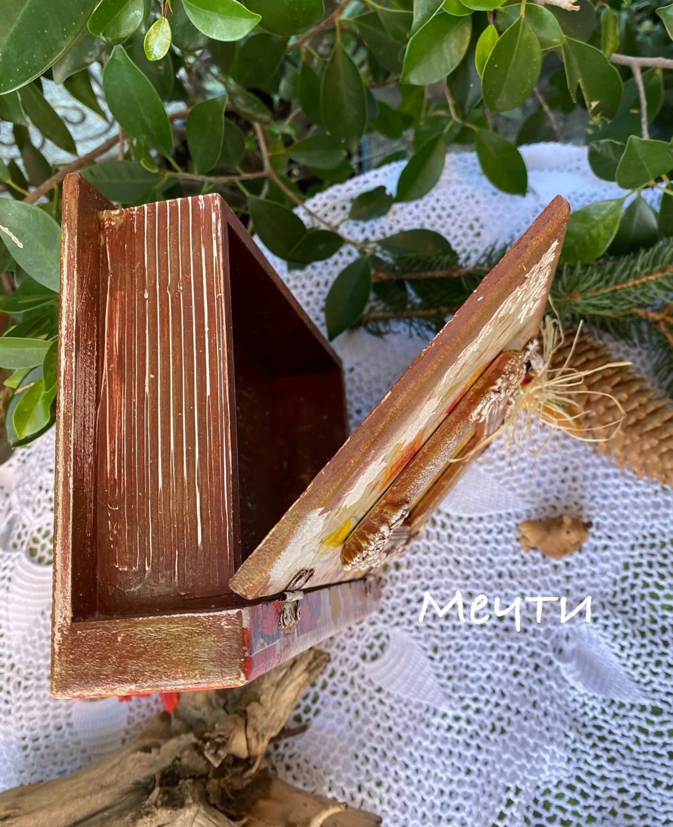 Кутията е от МДФ, декорирана с декупаж, кракле, вакса, шаблони, гипсови елементи… Размери; 23см./15см./5см.
