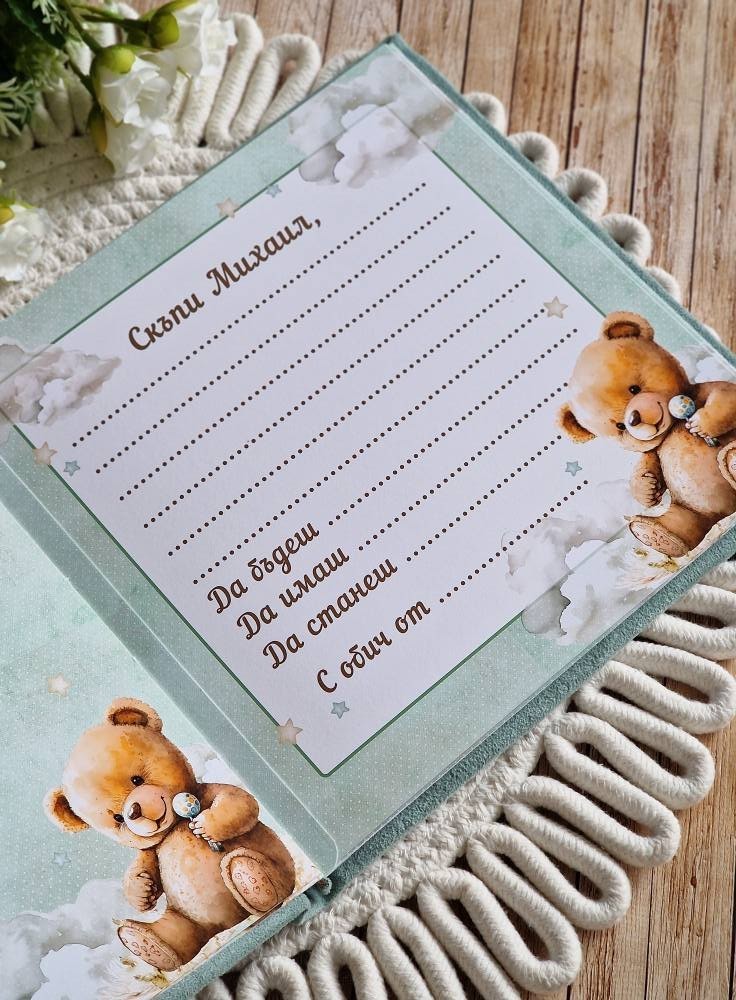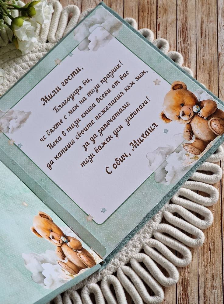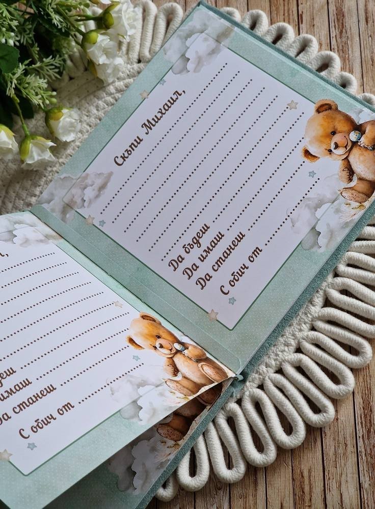 Книга за пожелания, с корици облечени в елегантен и мек велур. 🤎💚 Книга за пожелания с размери 23/22см. 🤎💚 Персонализирана с дизайни и цветове според предпочитанията. 🤎💚 20 листа/ 40 страници, двустранно принтирани с места за пожеланияи снимки. ✔️Корици облечени в мек и елегантен велур ✔️Страници- ръчно шити, за здравина и устойчивост. ✔️Персонализирана корица Изработва се с дизаините, цветове според предпочитанията. #craftstudiog #комплектпогача #орисване #платно #книгазапожелания #пожелания #книга #ръчнаизработка #велур #погачанабебе #погача #светокръщение #кръщене #бебешкапогача #бебешкиподарък #малъкбългарскибизнес #малъкбизнес #ръчнаизработка