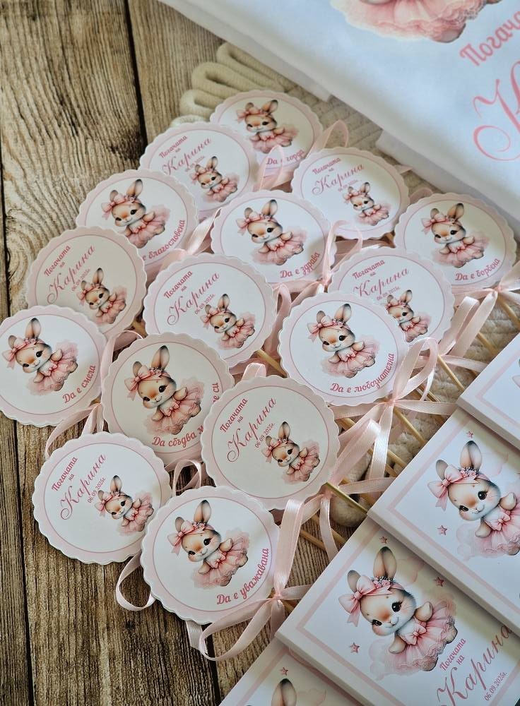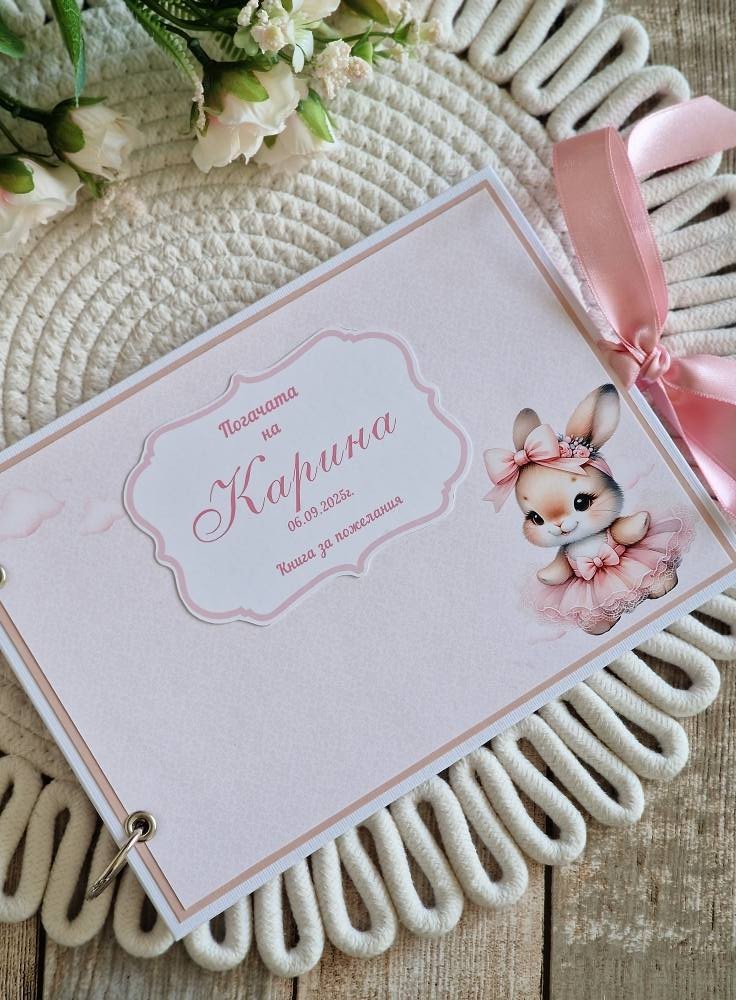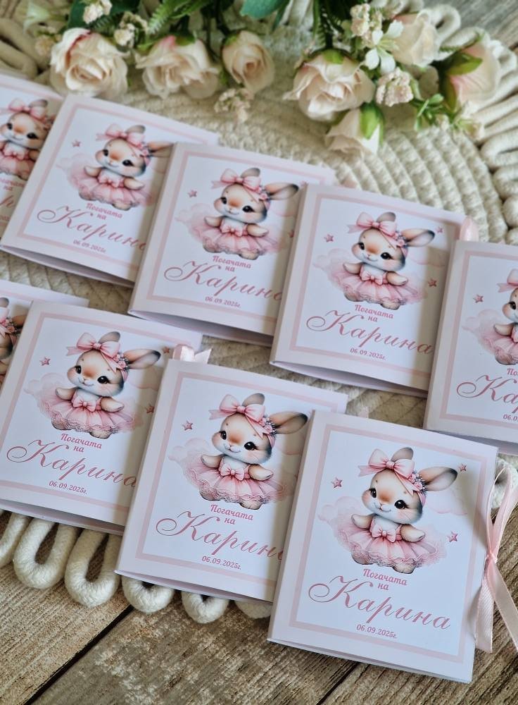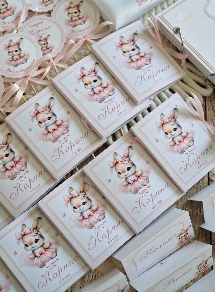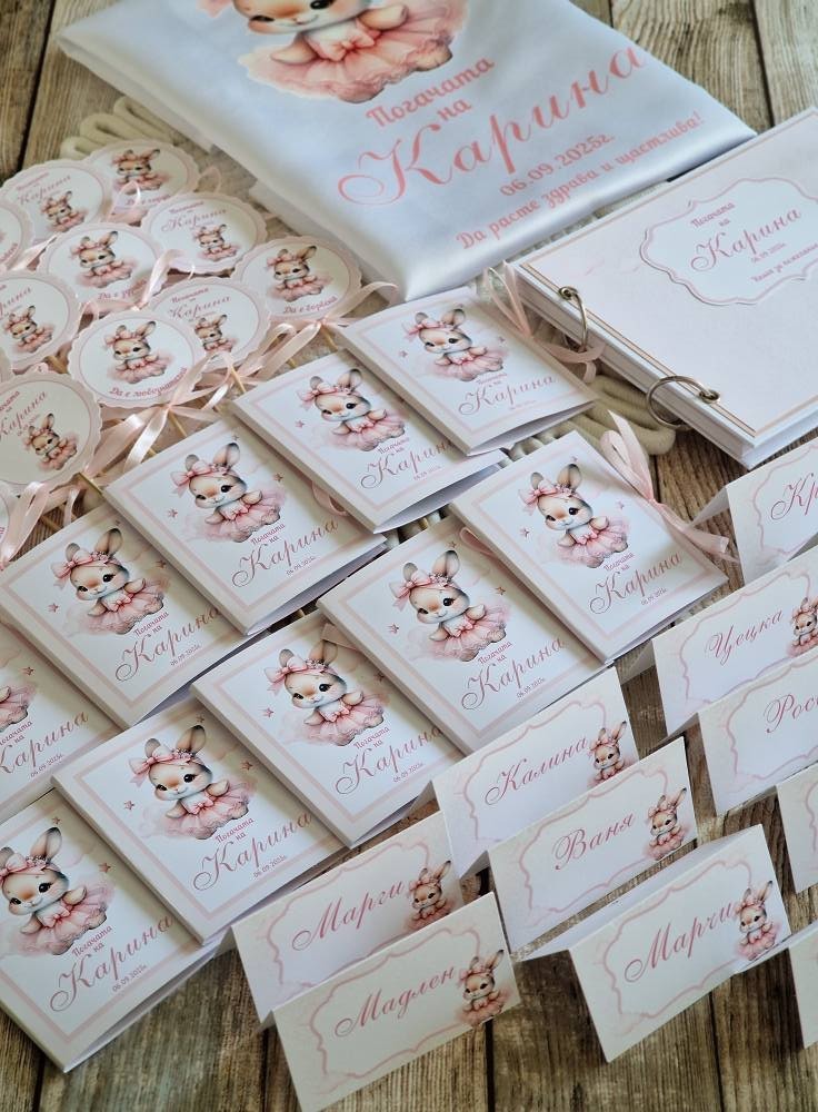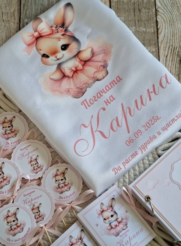 🌸Комплект/ аксесоари за погача 🌸 🌸За първия празник в живота на Карина. 🌸Изработени в пастелни цветове и акцент нежно зайче 📌Платно/месал персонализиран 26лв 📌 Книга за пожелания/орисване 50лв 📌Топери с наричания 2лв бр 📌Подаръци за всяка от орисниците 4.90лв за бр 📌Табелки с имената на гостите 0.80лв за бр 📍Всички аксесоари се изработват, с дизайни в зависимост от предпочитанията #craftstudiog #погачазабебе #погача #книгазапожелания #декорация #бебе #ръчнаизработка #подаръчета #месал #наричане #орисване #Топери #бебешкапогача #бебешкиподарък #подаръцизагости #персонализиранподарък #малъкбизнес