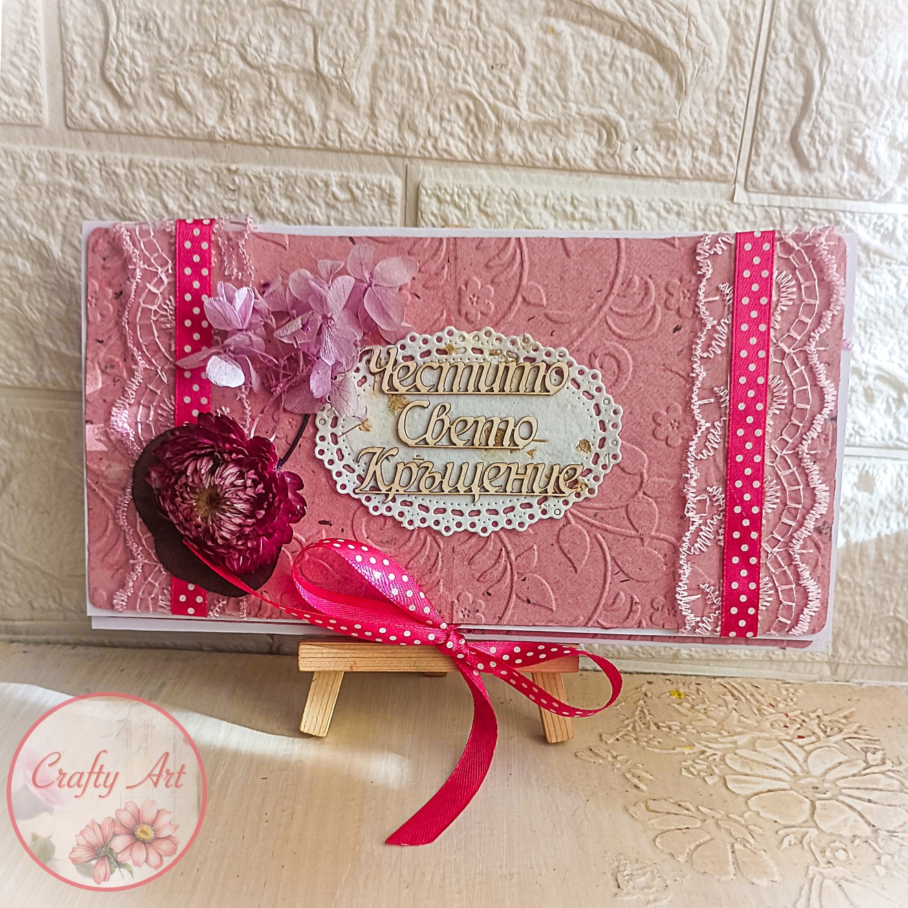 Красива картичка - плик за кръщене в розово. Картичката е направена предимно от еко материали - домашно правена рециклирана хартия, естествени сухи цветя, зебло и надпис от бирен картон. Размерът на картичката е 21х11см и има отделение за паричен подарък или пожелание, което мога да напечатам за Вас :) Цената на картичките е 10лв.
